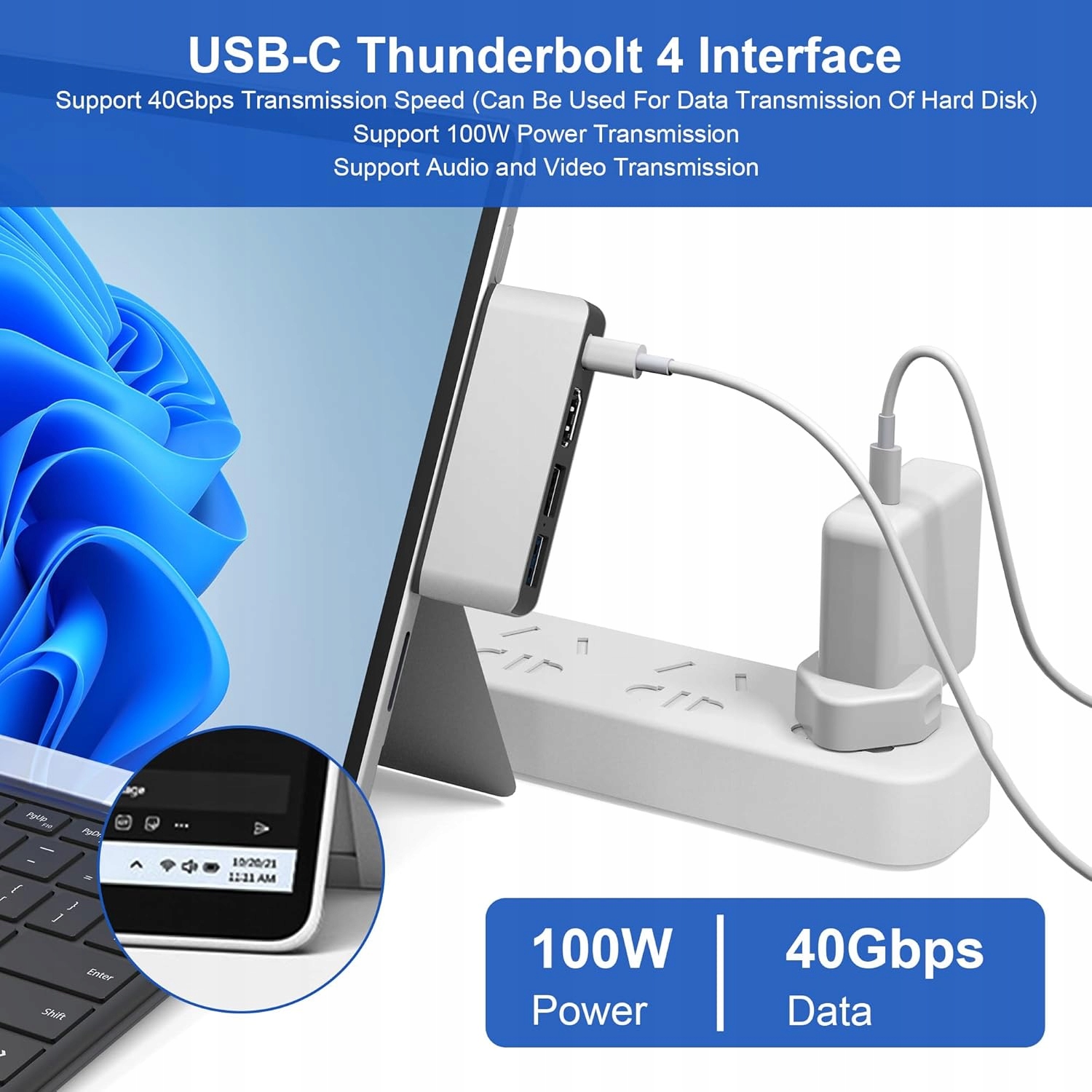Stacja dokująca zaprojektowana specjalnie dla Surface Pro 8, idealnie współpracuje z dwoma portami USB-C urządzenia.