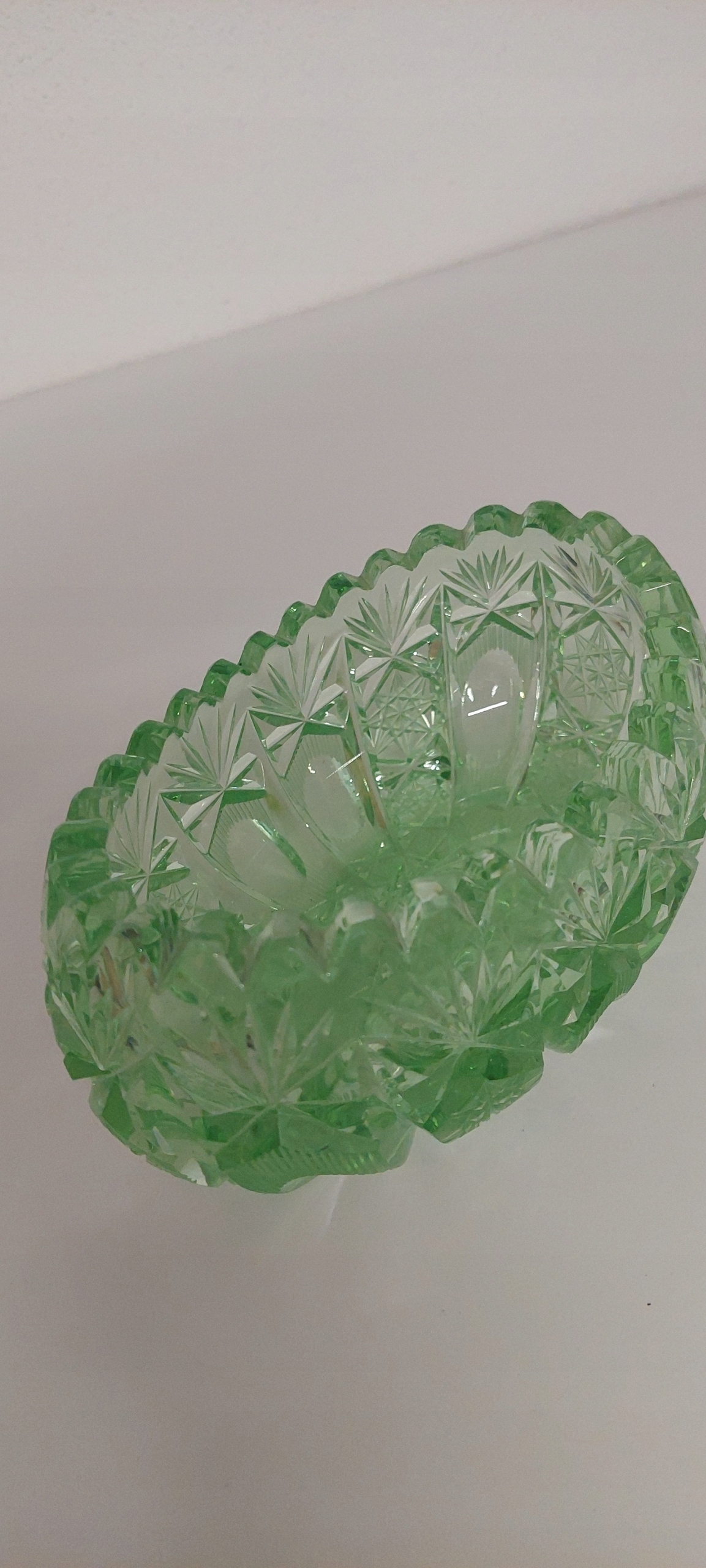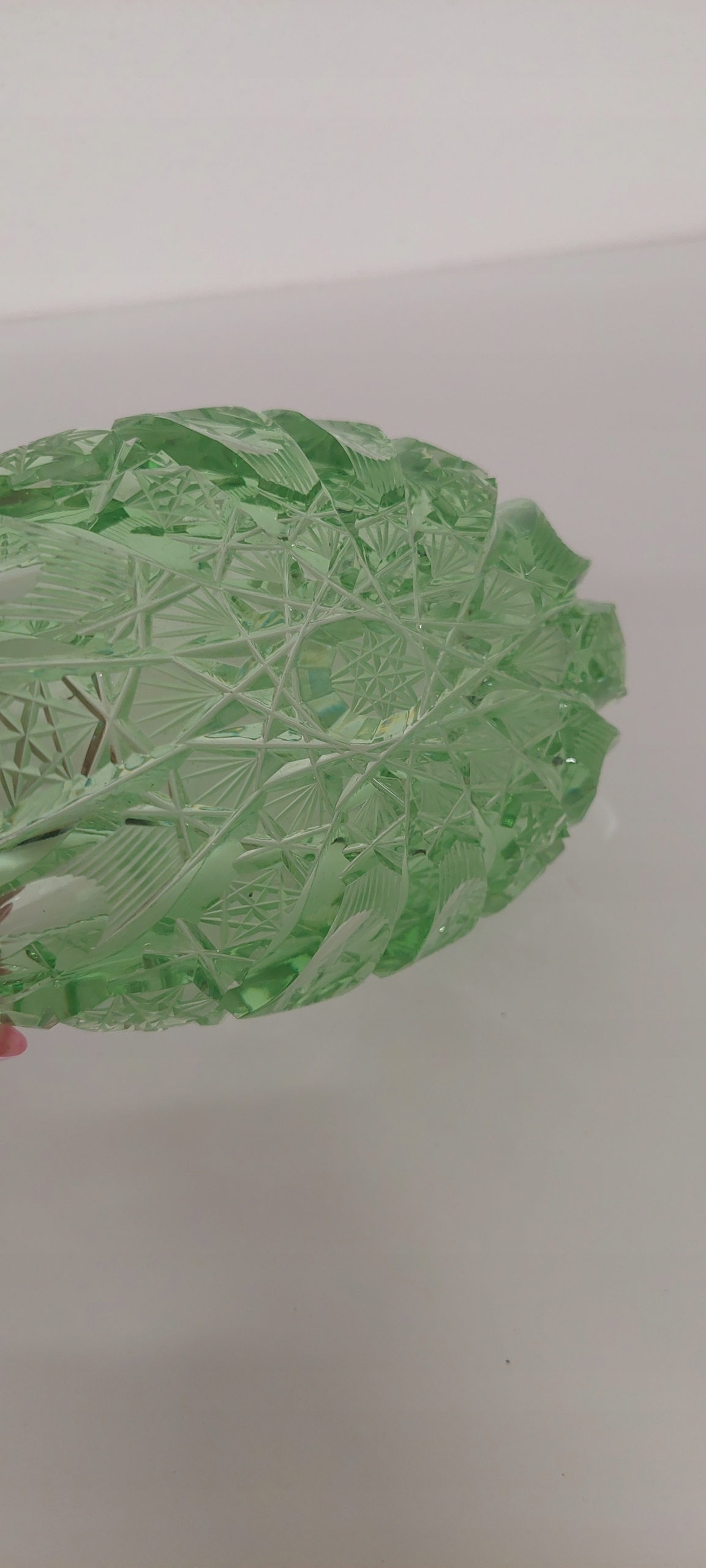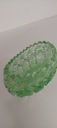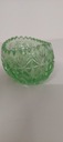Żardiniera w kolorze zieleni o wymiarach wysokość 7cm, długości 15cm, szerokość 9cm. Drobne rysy na szkle.