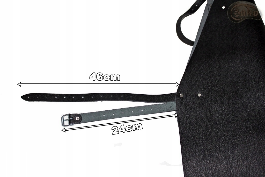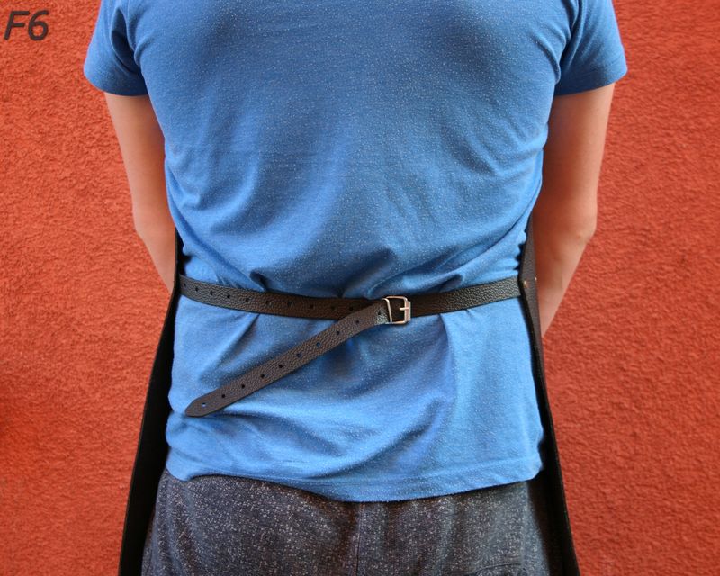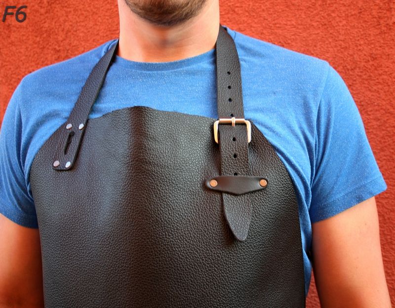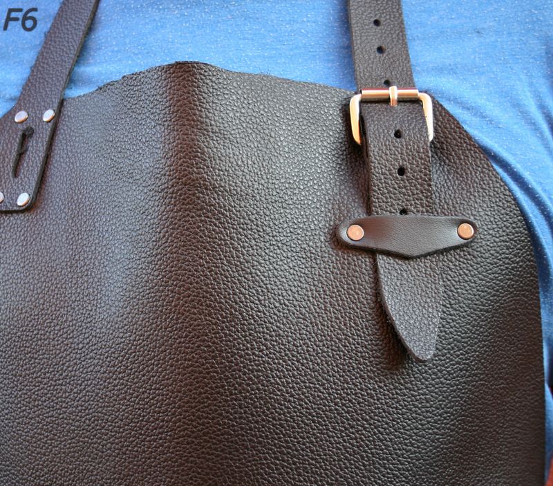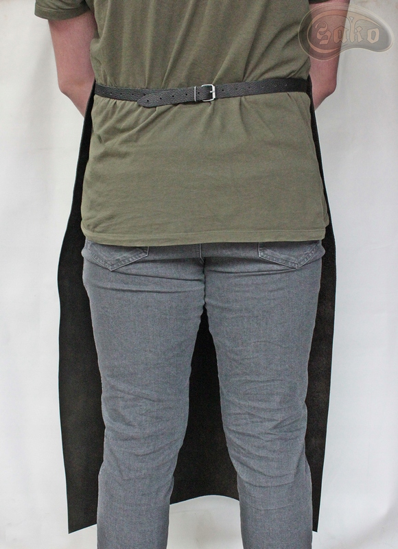 Fartuch skórzany przedni zakładany na szyję, z regulacją, z zapięciem na klamrę.