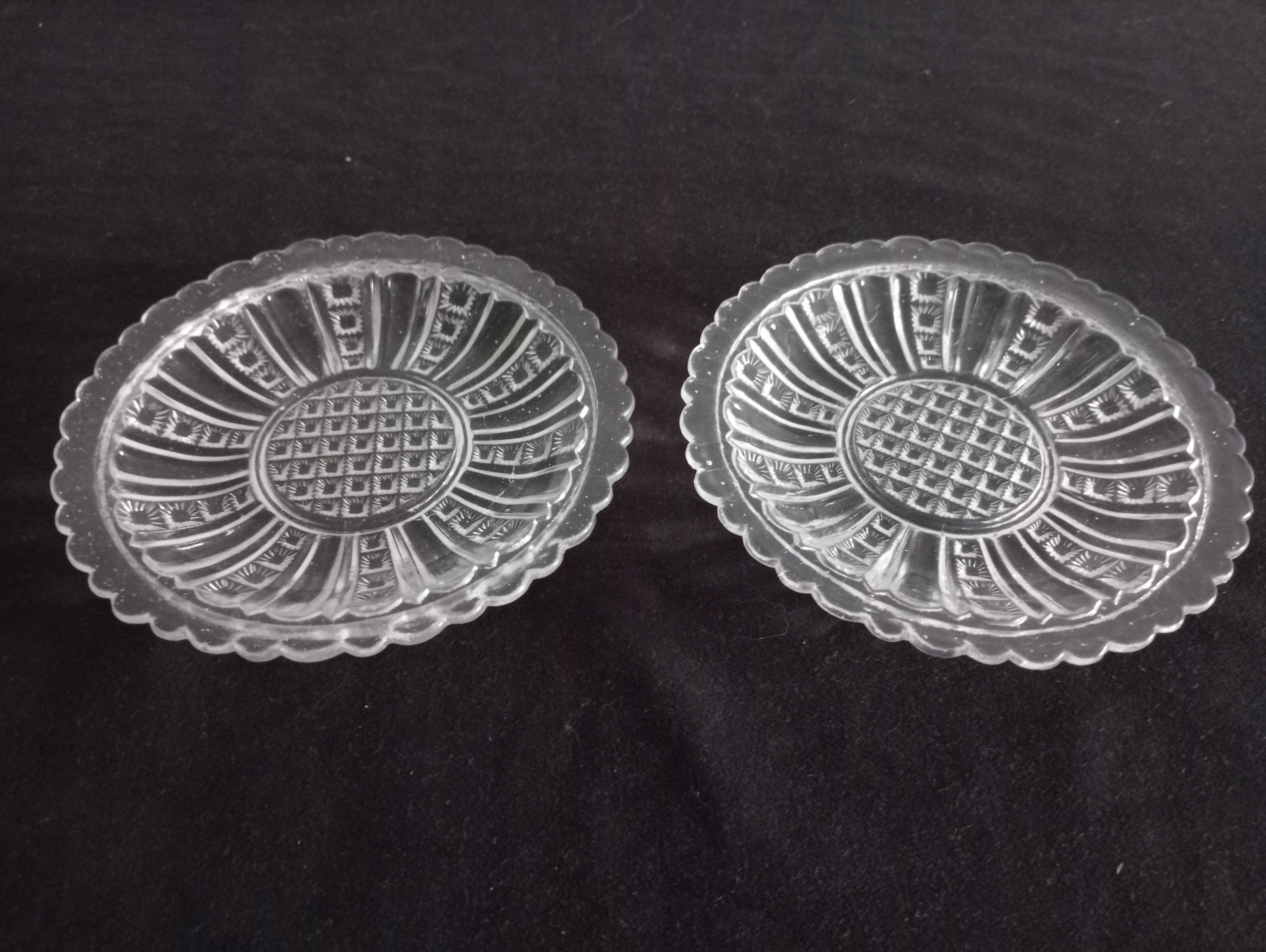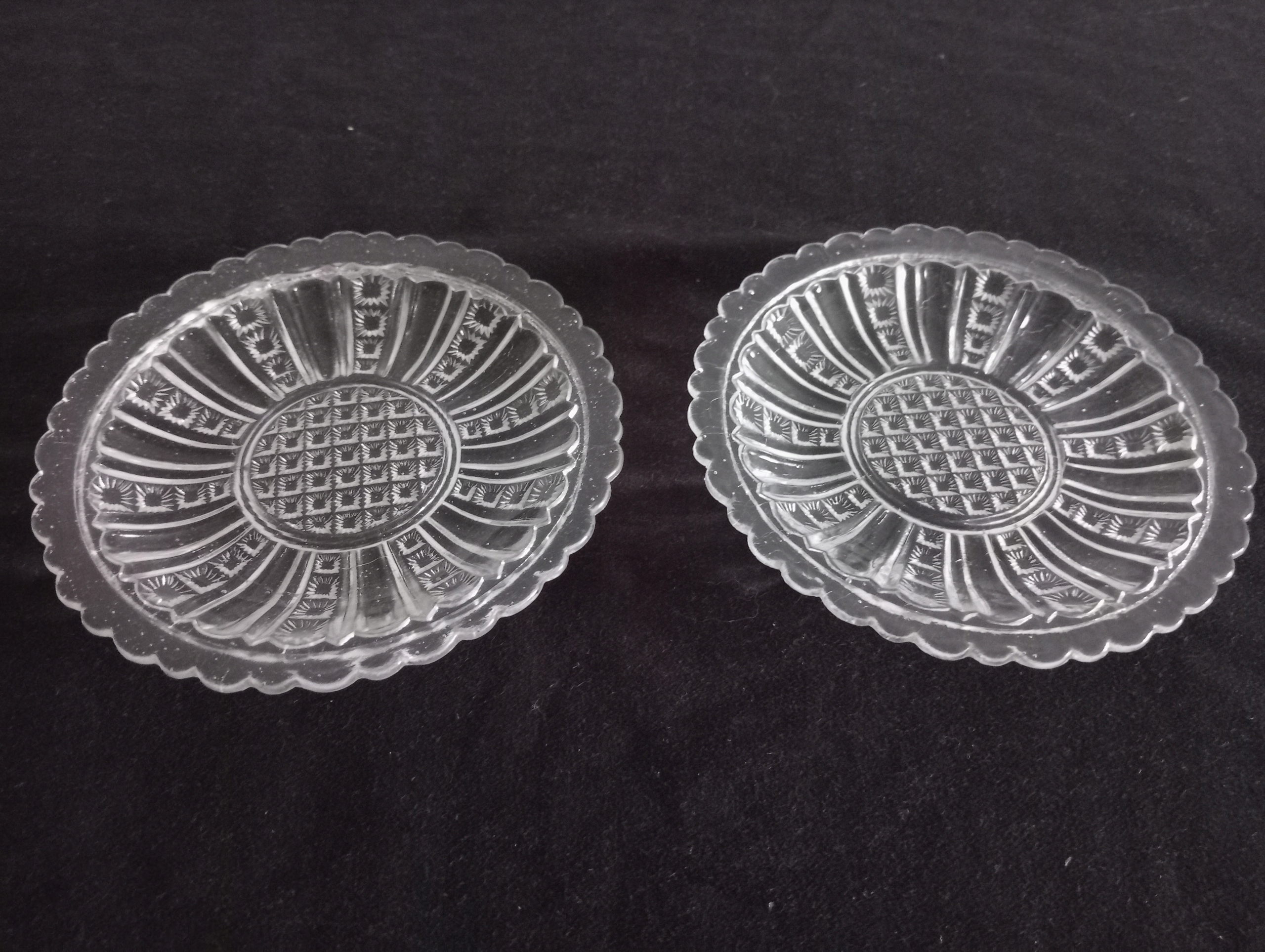 Dwa talerzyki z przedwojennego szkła prasowanego, prawdopodobnie któraś z niemieckich hut.