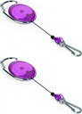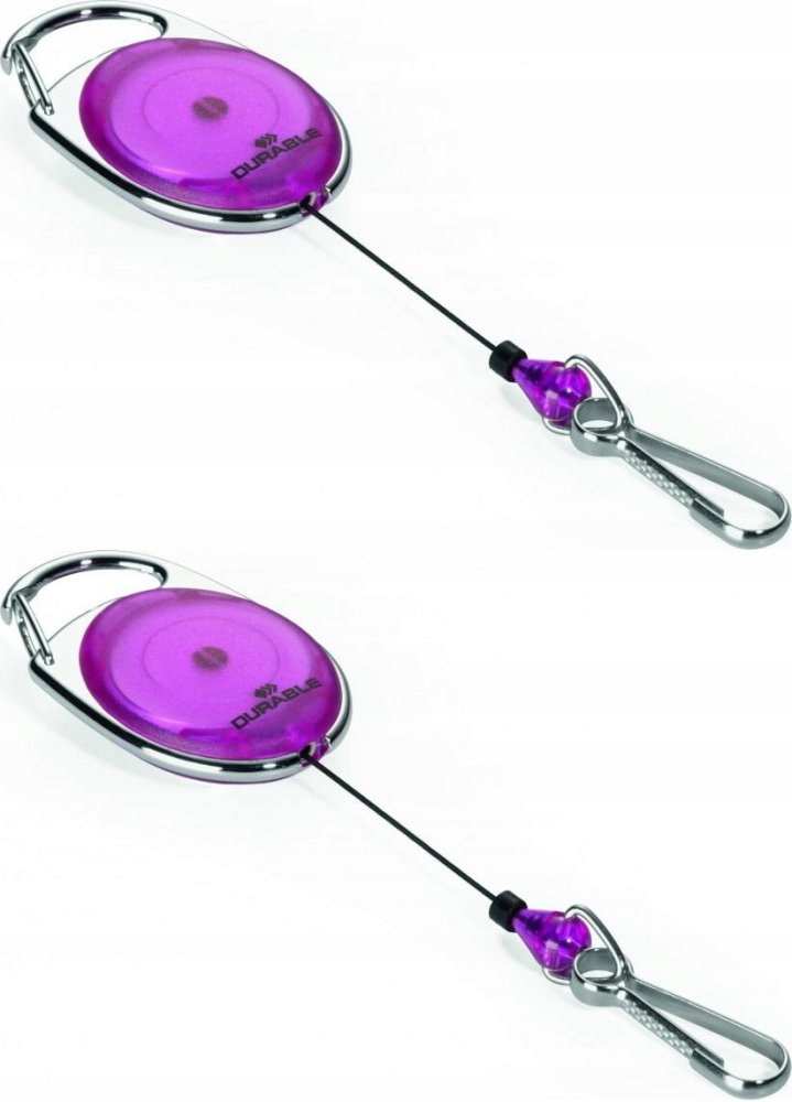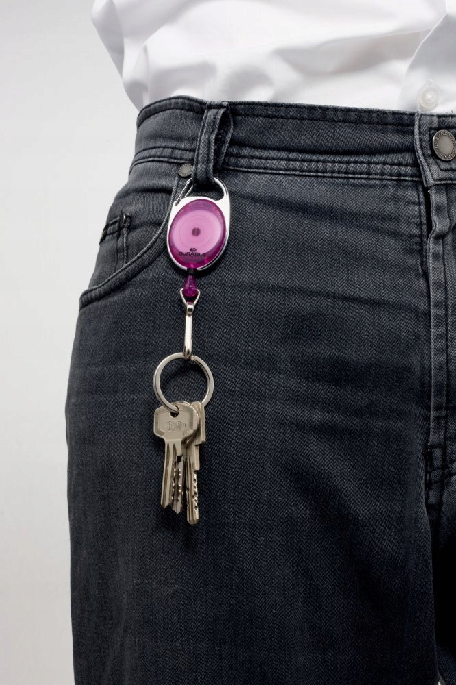 Stylowy owalny mechanizm ściągający z metalowym zaczepem do spodni i karabińczykiem.