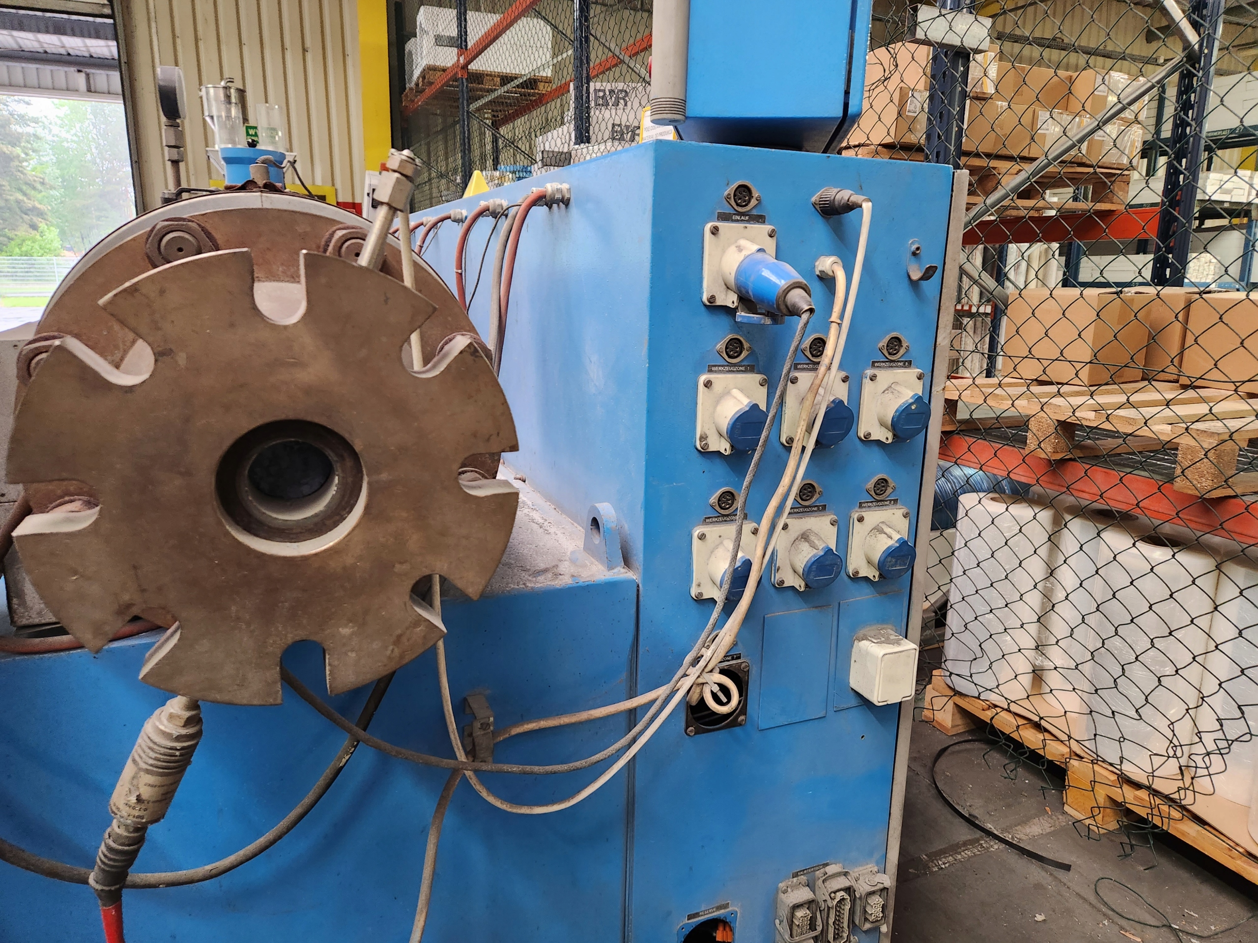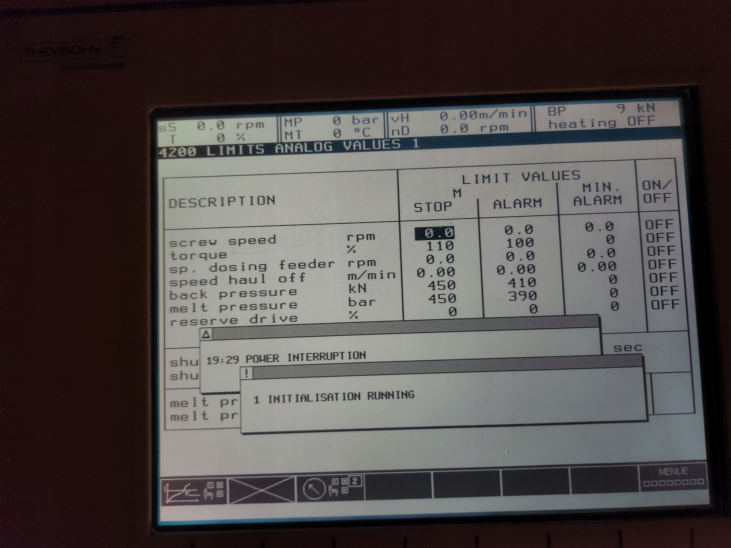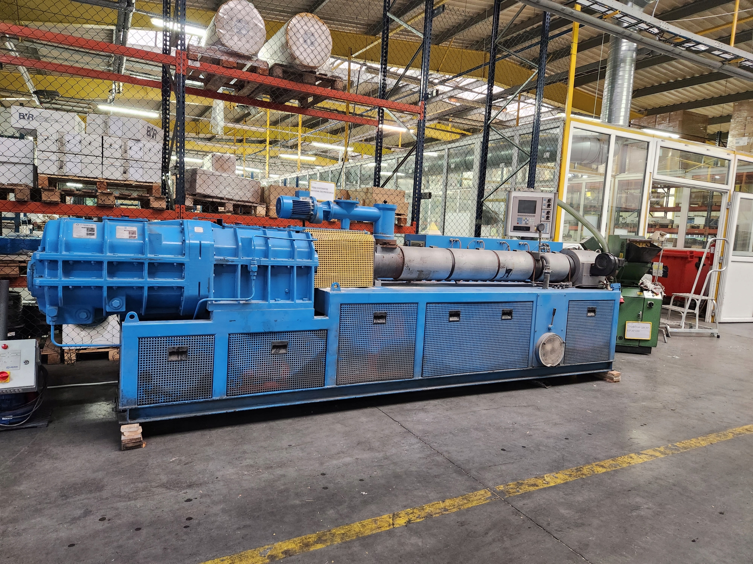 Wytłaczarka Theysohn Par 108 /23D dwuślimakowa, tylko 30080 roboczo / godzin // Układ ślimaków równoległy, 1997 r. prod // Cylinder 5 stref grzania. // Waga - 5500 kg // Sterowanie maszyny z komputera // Wytłaczarka w bardzo dobrym stanie od 10 lat nie pracowała, ale komputer działa. Kompletna DTR niemiecka