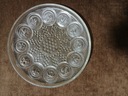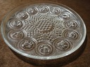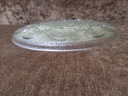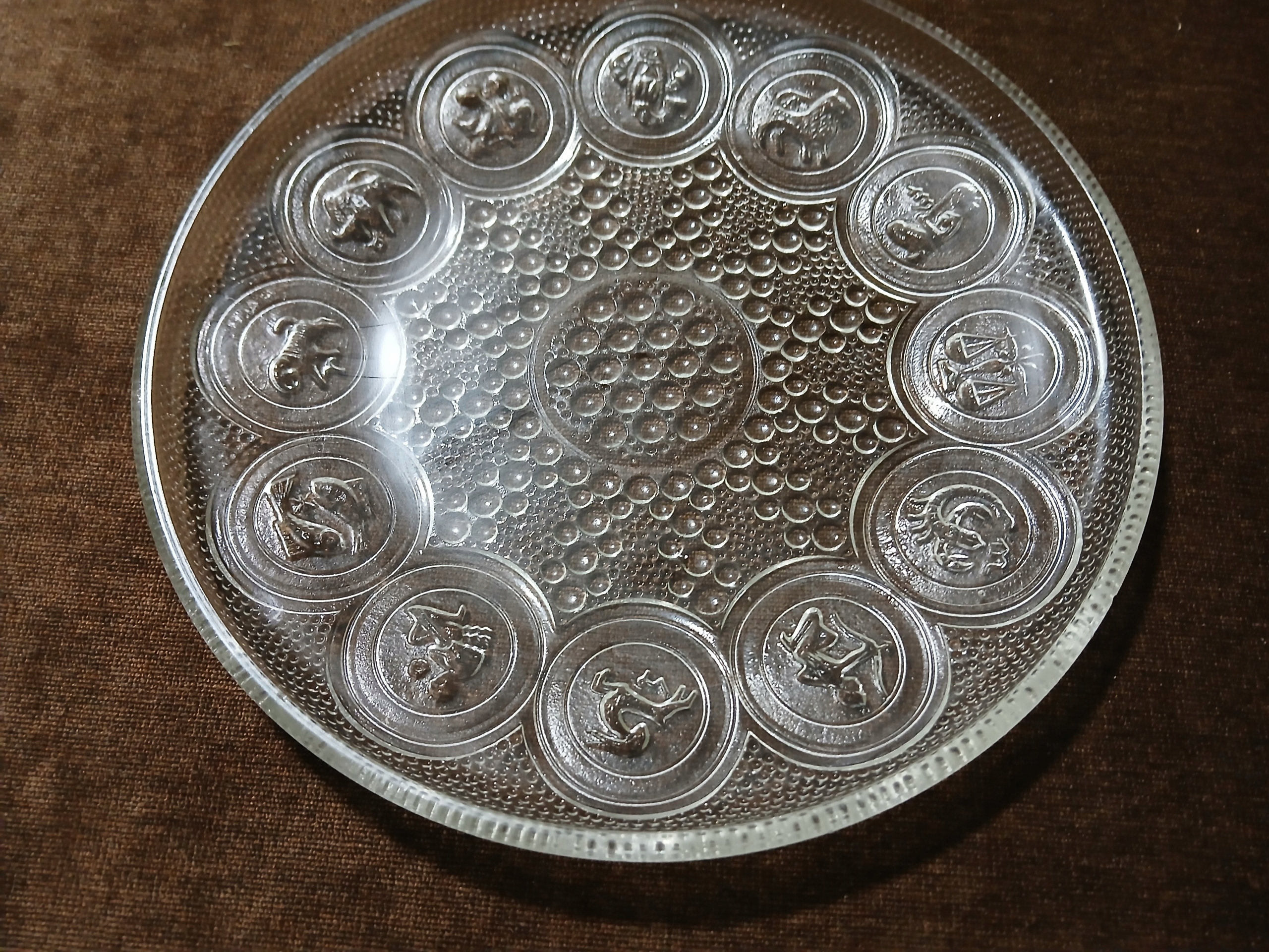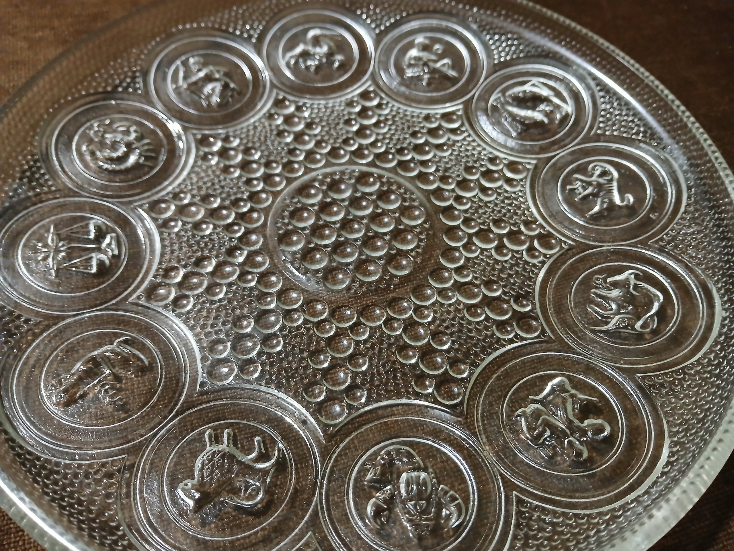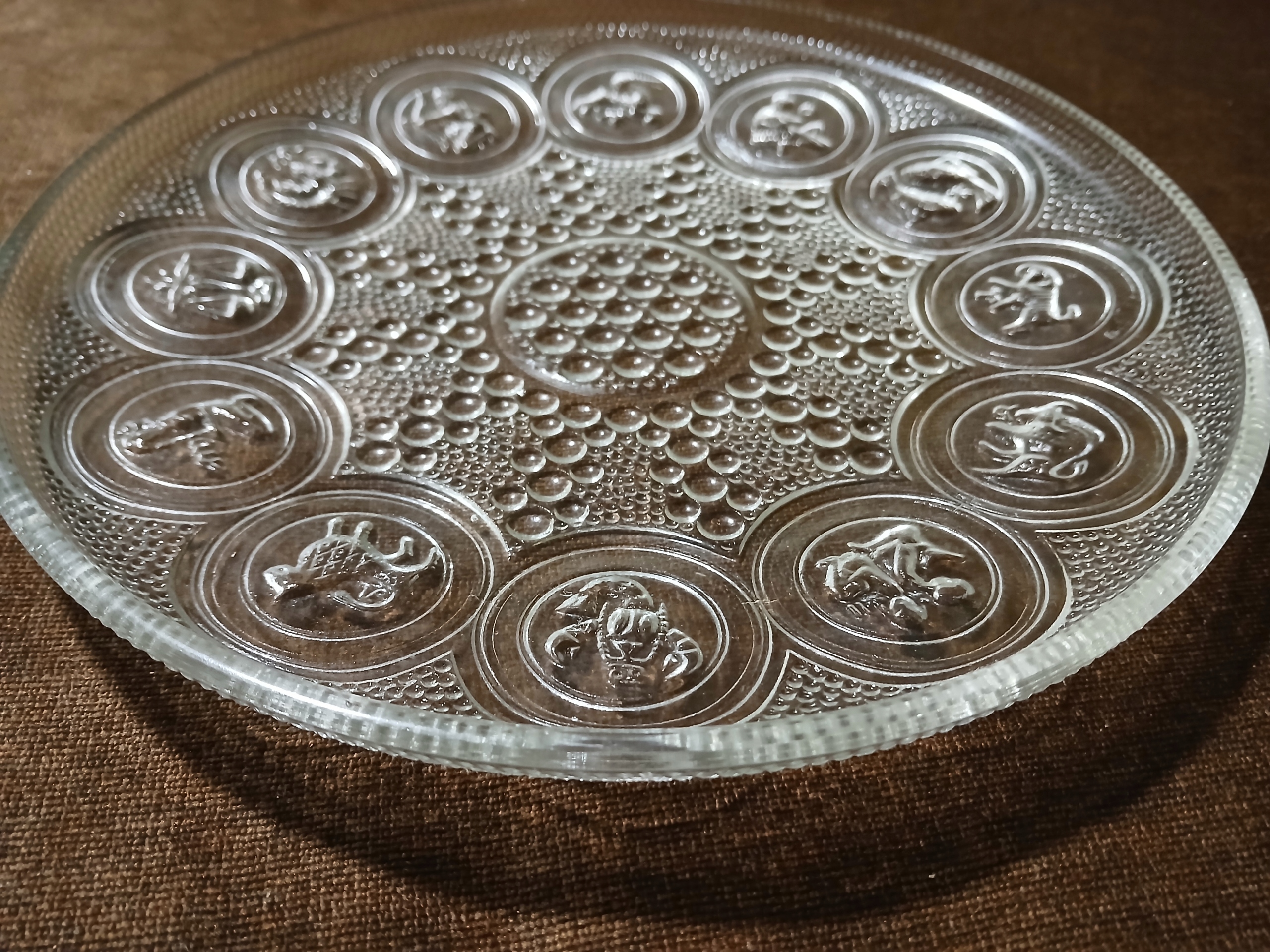 ZĄBKOWICE - ZODIAK – ASTEROID -PATERA NA NODZE - DLA KONESERA !!!!. Szkło prasowane, bezbarwne, z minionej epoki. Eksponat z lat 70 XX wielu. Pochodzi z Huty Szkła Gospodarczego ZĄBKOWICE w Dąbrowie Górniczej. Autorem patery ze wzorem "Zodiak" jest Eryka Trzewik-Drost. Patera ta, zaprojektowana w latach 60. lub 70. XX wieku, jest częścią kolekcji "Asteroid" i charakteryzuje się wytłoczonym wzorem 12 znaków Zodiaku na zewnętrznej stronie oraz kulkami i kropkami od spodu.