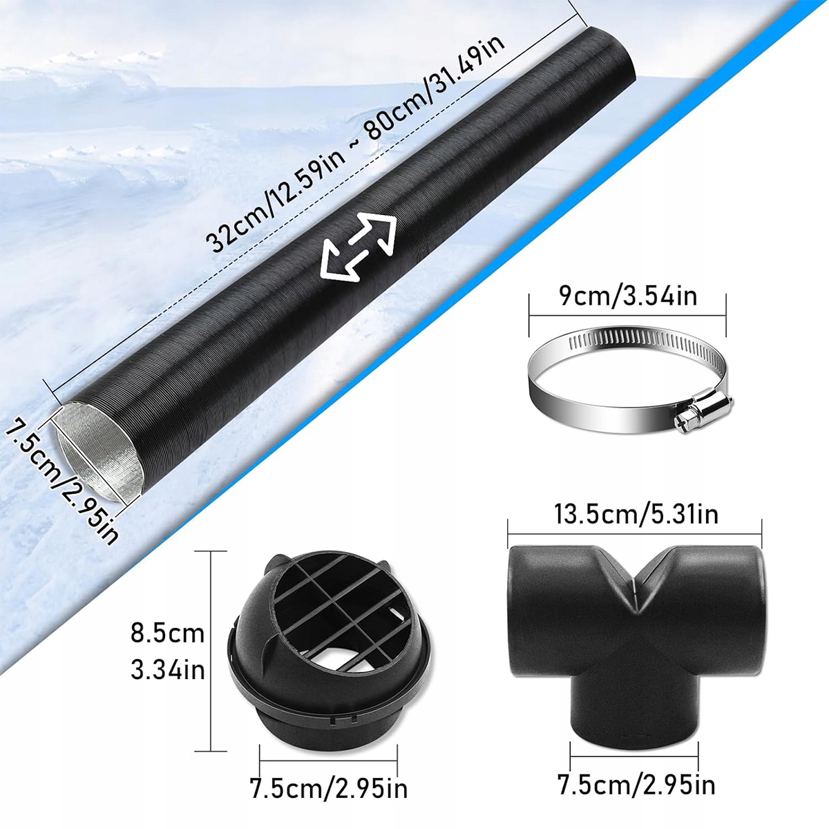 🔥 【Instrukcja montażu】 Wewnętrzna średnica kanału wynosi 75 mm. Stosowany głównie do nagrzewnic powietrza na olej napędowy o mocy 5KW/8KW. Nadaje się do rur ciepłego i zimnego powietrza w grzejnikach na olej napędowy, gospodarstwach domowych, strugarkach itp.