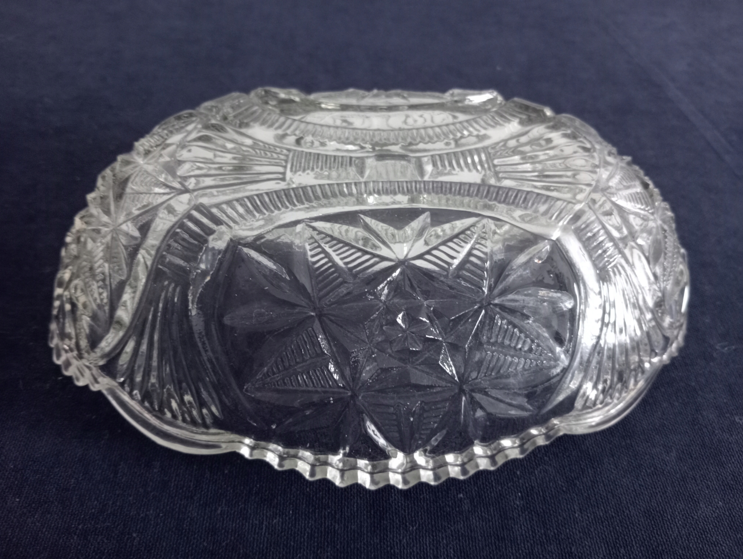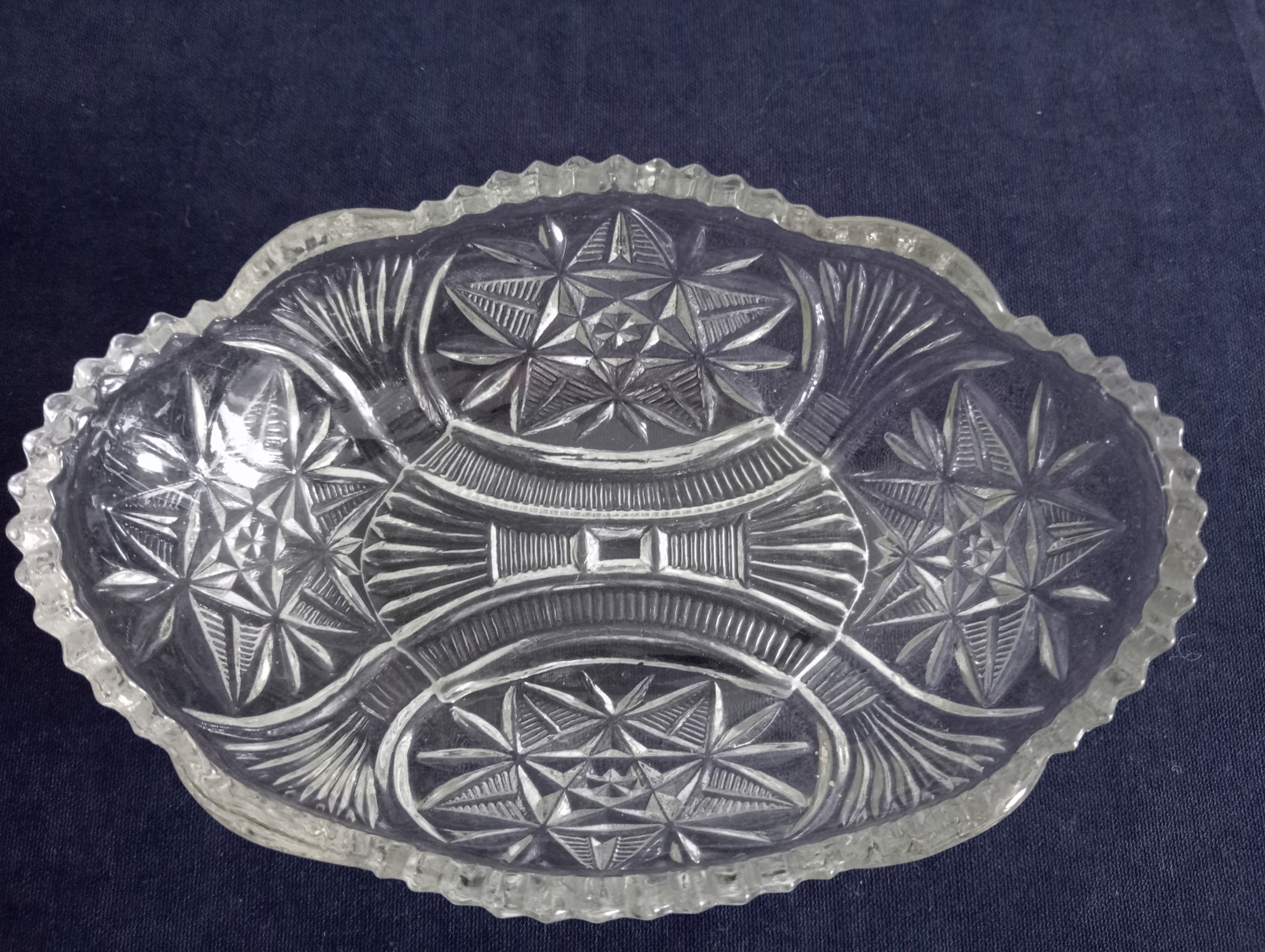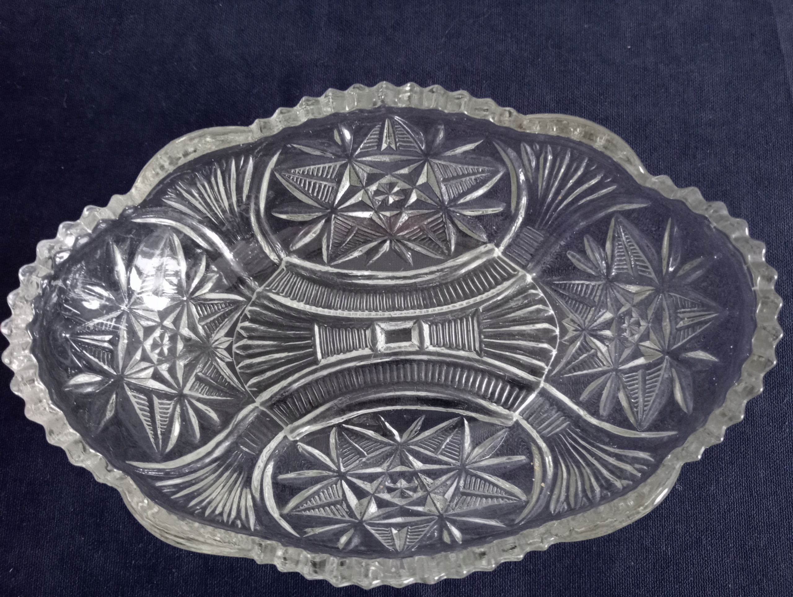 Овальная витрина из аметистового прессованного стекла. Украшена тиснением в геометрические узоры. Родом из стекольного завода "гортензия" в Петркув-Трыбунальском. II Пол. Xxв.