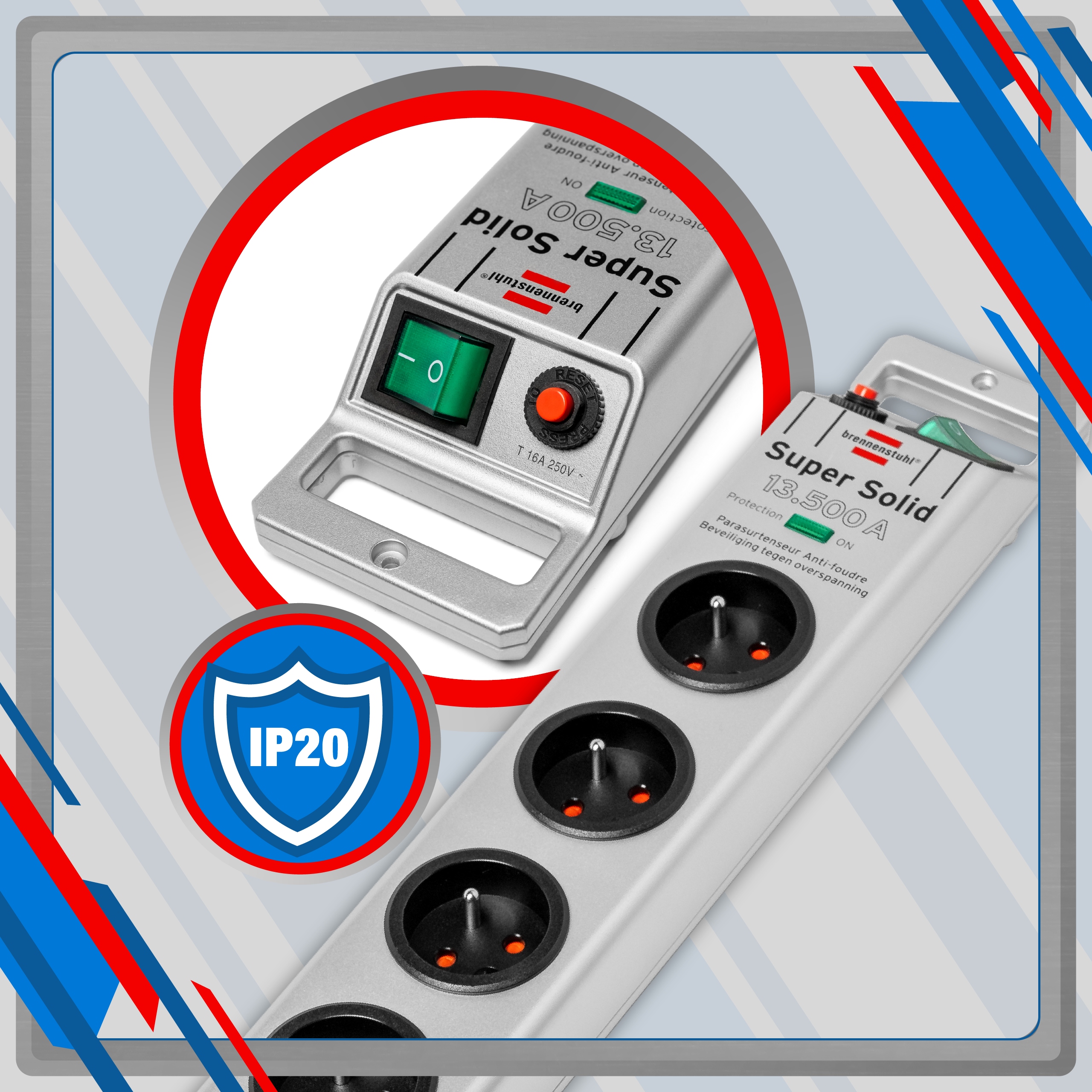 Listwa Super-Solid renomowanej niemieckiej marki Brennenstuhl stanowi doskonałe źródło zasilania. Imponuje zarówno jakością wykonania, jak i poziomem bezpieczeństwa. Dzięki przemyślanej konstrukcji możesz ją umieścić w dowolnym miejscu: nie tylko na podłodze lub płaskiej powierzchni, ale także na ścianie. Jest też bardzo wytrzymała i żywotna. Wyróżnia się niezwykłym komfortem obsługi. Do tego została wyposażona w ochronę przeciwprzepięciową (13 500 A), dzięki czemu zabezpieczy Twoje urządzenia przed szkodliwymi skutkami przepięć w sieci. Wszystko to sprawia, że z pewnością spełni wszelkie pokładane w niej oczekiwania!