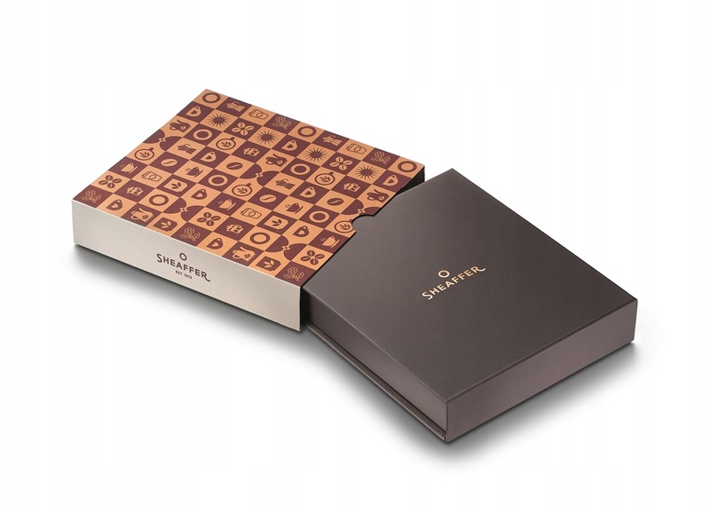 Zestawy Sheaffer Coffee Edition są elegancko zapakowane w ciemnobrązowe, teksturowane pudełko z brązowym, metalicznym logo.