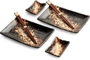 Zestaw Do Sushi 22 cm x 12,5 cm 6 el. Emro AziaTica Zestaw Do Sushi 22 cm x 12,5 cm 6 el. Emro AziaTica to elegancki komplet dla dwóch osób, który zawiera dwie prostokątne tace do sushi, dwie małe miseczki na sos sojowy oraz dwie pary drewnianych pałeczek. Czarne szkliwienie z jasnym, „rozpryskanym” efektem nadaje zastawie wyjątkowy charakter i pięknie podkreśla kolory rolek, sashimi oraz dodatków, a całość zapakowano w estetyczne pudełko prezentowe.