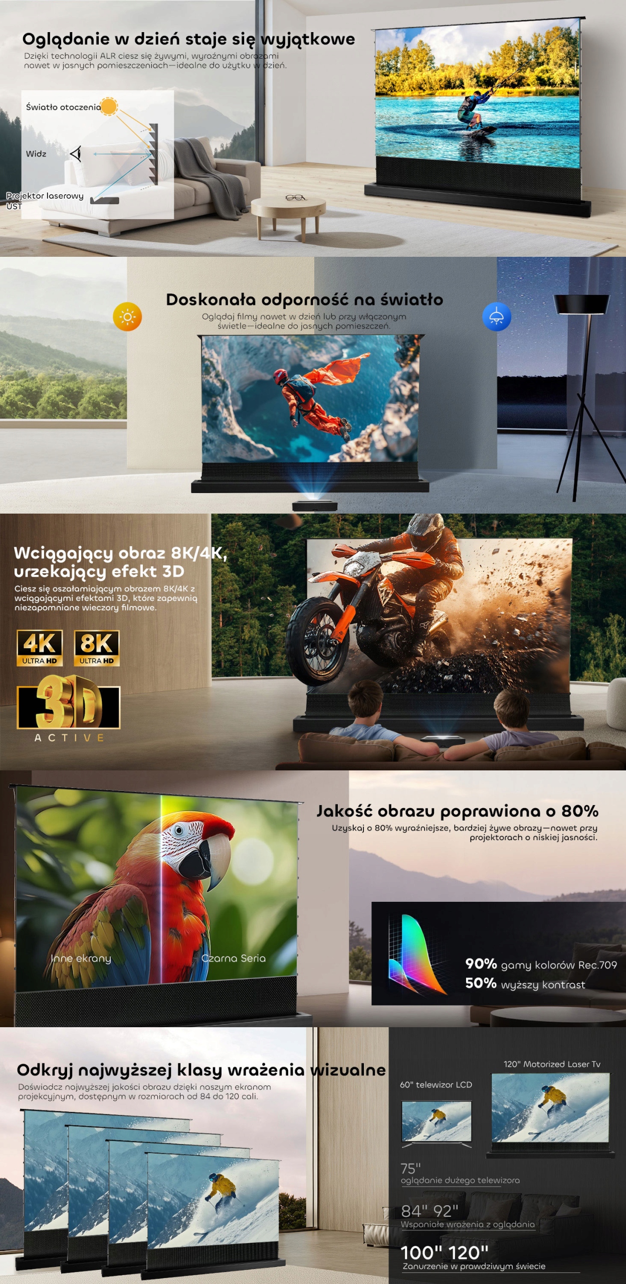 ✅ Zastosowanie: kino domowe, „ekran TV” do projekcji, projektory krótkiego rzutu