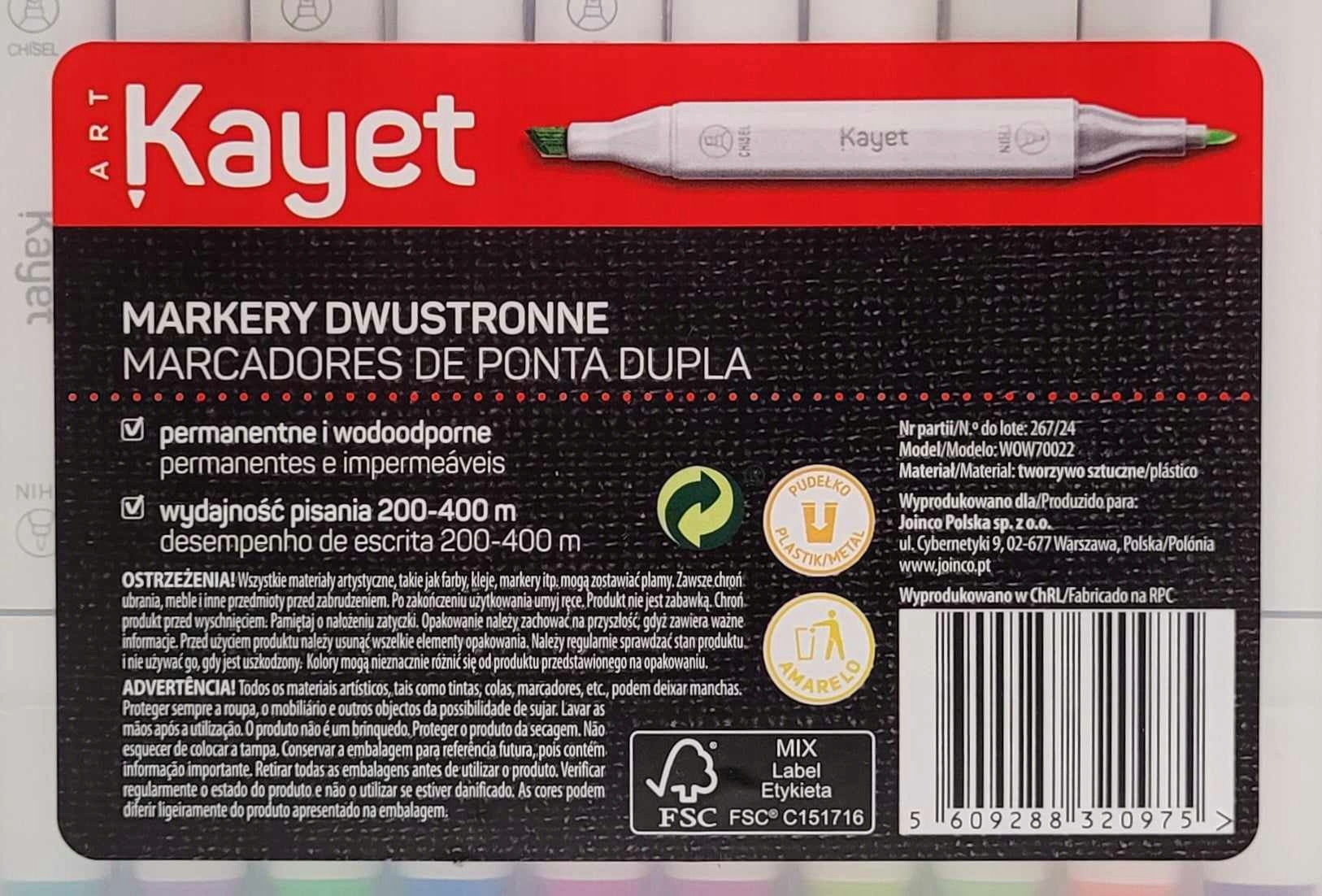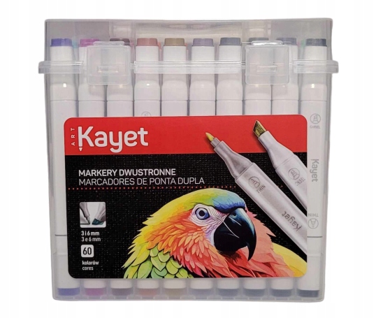 Zestaw markerów dwustronnych KAYET to 60 kolorów w szerokiej gamie barw wraz z organizerem. To profesjonalne markery, które są permanentne i wodoodporne. Posiadają dwie funkcjonalne końcówki: okrągłą (3 mm) i szeroką (6 mm).Zapakowane zostały w praktyczne pudełko z rączką. Charakteryzują się wysoką wydajnością pisania od 200 do 400 m. Ich zaletą jest także czytelna numeracja kolorów.