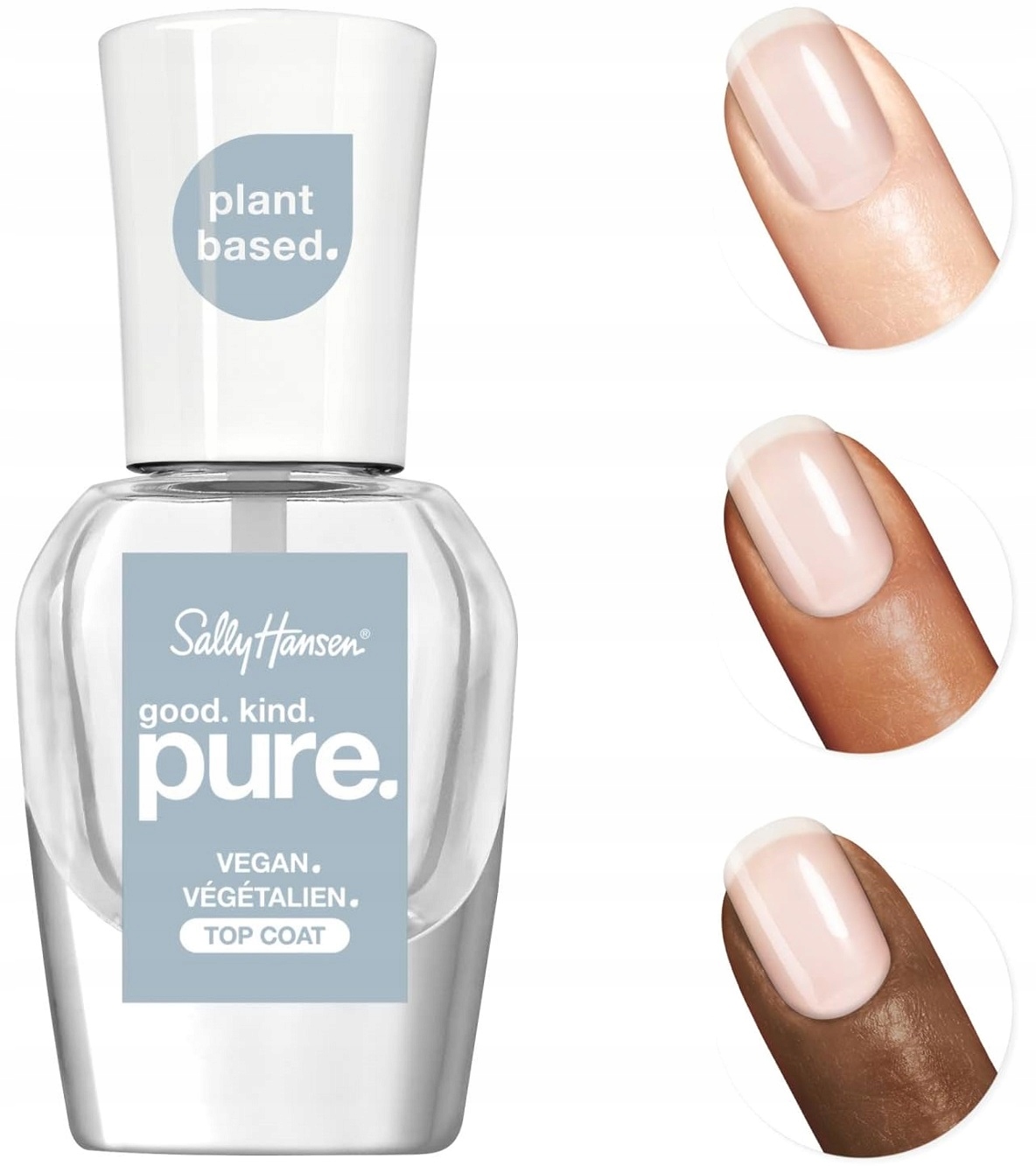 Opis: Pierwsze w 100% wegańskie lakiery do paznokci od Sally Hansen Good. Kind. Pure.™ Stworzone z miłości do natury lakiery oferują bogatą paletę barw i połysk bez kompromisów. Dostępne w 17 intensywnych kolorach. Aż 77% składników jest pochodzenia naturalnego, a wegański pędzelek idealnie współgra z nową formułą lakieru.