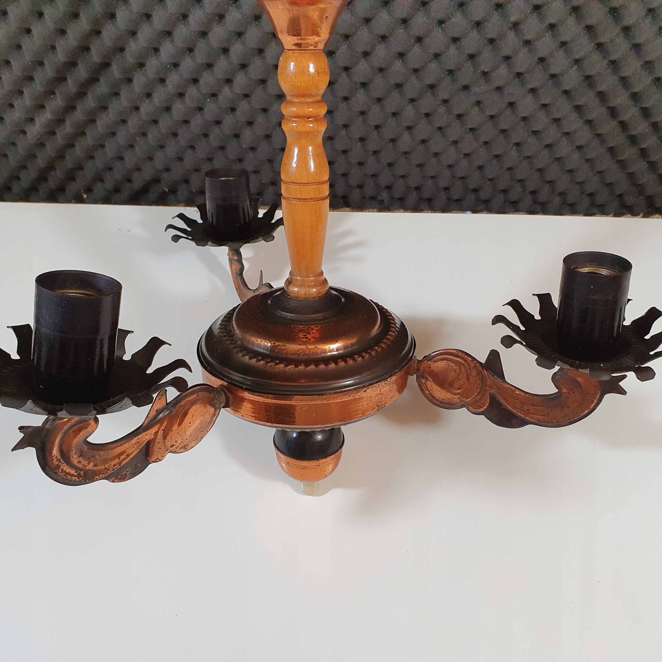 ŻYRANDOL LAMPA WISZACA PRL.TRÓJRAMIENNY WYSOKOŚĆ 58 CM, ODLEGŁOŚĆ RAMION OK 30 CM. ŻARÓWKA E-27.ŚREDNICA 17 CM. METAL + DREWNO. STAN WIZUALNY JAK NA ZDJĘCIACH.POLECAM.