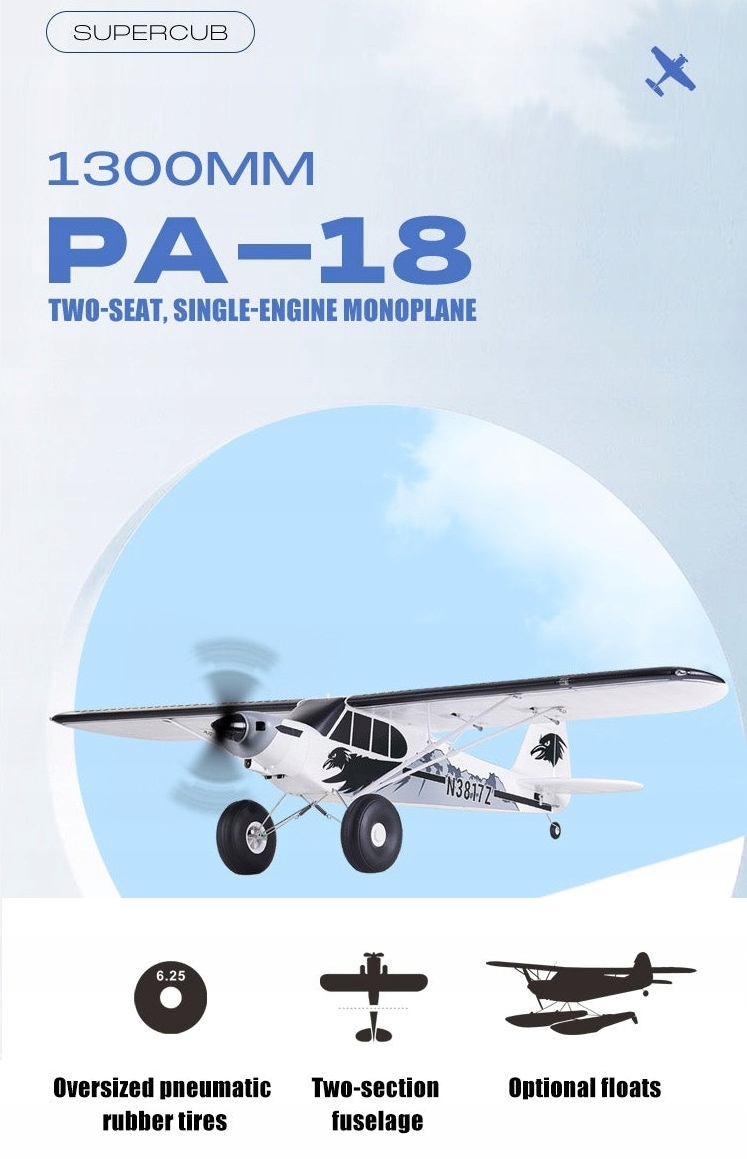 Piper PA-18 Super Cub to dwumiejscowy, jednosilnikowy jednopłat. Został opracowany na bazie Piper PA-11. W ciągu prawie 40 lat produkcji zbudowano ponad 9000 egzemplarzy. Samoloty Super Cub są powszechnie wykorzystywane do latania w buszu, holowania banerów i szybowców. FMS 1700mm PA-18 został wprowadzony na rynek w 2019 roku, a jego stabilne, łatwe w pilotażu i łatwe w obsłudze funkcje przyniosły pełne zaskoczenie zarówno nowym, jak i starszym pilotom. Podczas gdy ten trenażer był powszechnie chwalony, FMS był stale pytany, czy możliwe jest zmniejszenie rozmiaru samolotu, w tym samego samolotu i opakowania, przy jednoczesnym zachowaniu jego stabilności i sterowności operacyjnej w jak największym stopniu, tak aby można go było podnieść jak walizkę pokładową. Dzięki PA-18 1300mm, FMS odpowiedział na powyższe pytanie. PA-18 1300 mm również przyjmuje dwusekcyjne skrzydło główne i poziomą strukturę stabilności, ale jednocześnie kadłub jest również dwusekcyjny, co znacznie ułatwia graczom transport i przenoszenie. Można go schować w rogu bagażnika samochodowego, gotowy do użycia w dowolnym momencie. Dzięki funkcjonalnym klapom, wysokiemu udźwigowi, wytrzymałemu podwoziu i dużym pneumatycznym oponom gumowym - PA-18 Super Cub 1300 mm ma imponujące osiągi krótkiego startu i lądowania (STOL), co pozwala mu operować z niemal każdego terenu. Dla pilotów chcących poczuć się jak w prawdziwym samolocie, PA-18 Super Cub może być wyposażony w pływaki. Najnowszy PA-18 1300mm może być świetnym początkiem do cieszenia się wszechstronnym, zabawnym i wyjątkowo relaksującym lotem.