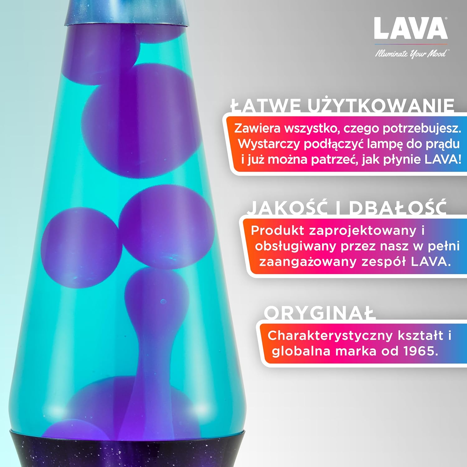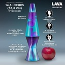 Lampa Lava 2047 w edycji Zorza Galaxy to wyjątkowa lampa dekoracyjna, która wprowadza do wnętrza magiczny i relaksujący nastrój. Urządzenie charakteryzuje się hipnotyzującym połączeniem niebieskiej cieczy oraz płynnie poruszającego się fioletowego wosku, co tworzy niepowtarzalny spektakl wizualny. Solidna podstawa i kapturek wykonane z aluminium zostały ozdobione efektownym motywem zorzy polarnej, nadając lampie nowoczesny charakter. Jest to oryginalny produkt marki Lava, co gwarantuje wysoką jakość wykonania oraz bezpieczeństwo użytkowania. Lampa emituje łagodne, ciepłe światło, idealnie sprawdzając się jako lampka nocna w sypialni lub nastrojowy dodatek w salonie.