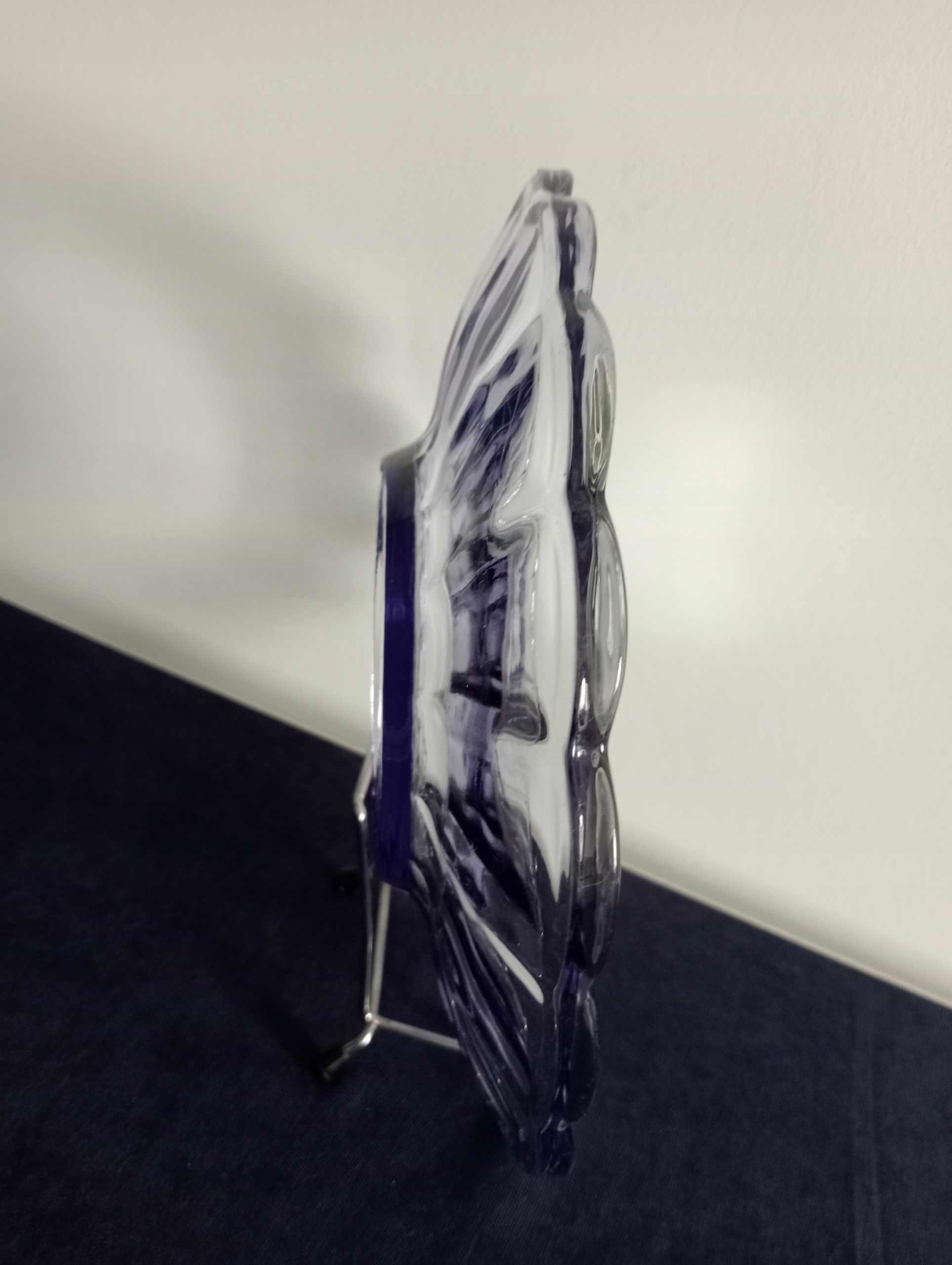 Pochodzi z huty szkła J. Stolle Niemen, numer katalogowy z 1926 roku to 1771. Szkło prasowane fioletowy odcień zachowane w stylu Art-Deco. Prosta forma z falowanymi rantami.