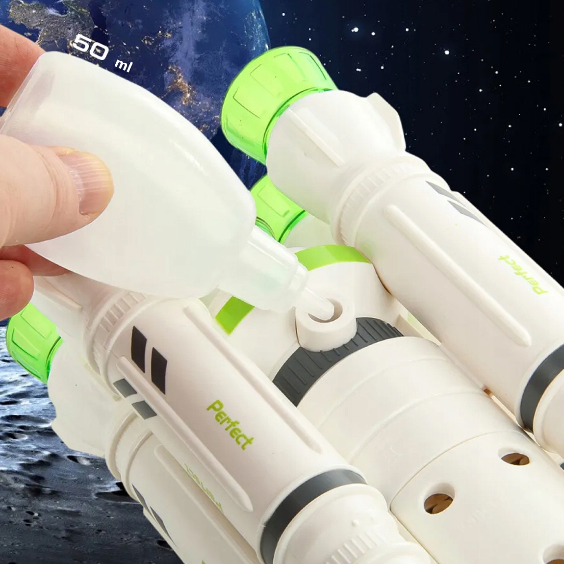Po napełnieniu zbiorniczka wodą specjalną pipetą — podczas startu z silników zaczyna wydobywać się para, imitując prawdziwy dym rakietowy!