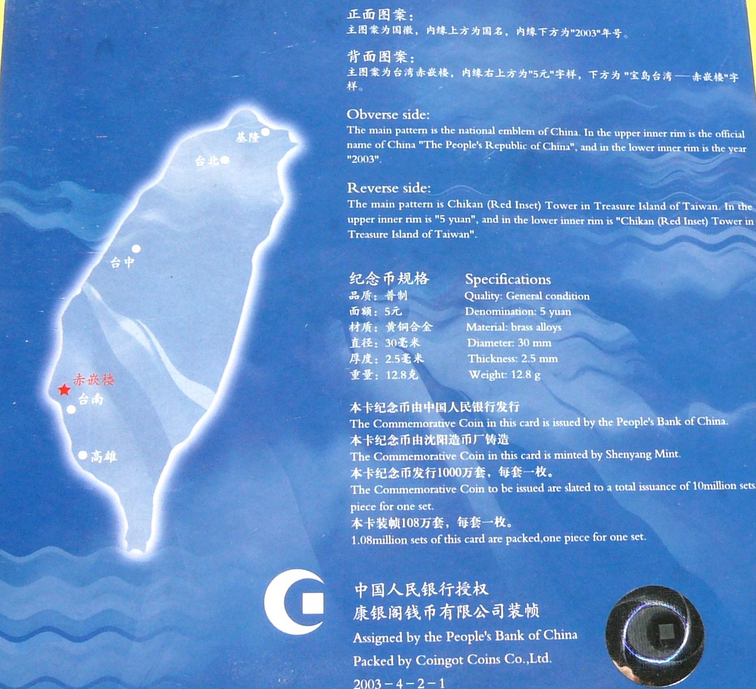 NA AUKCJI WYSTAWIANA JEST PRZEPIĘKNA ORYGINALNA MONETA KOLEKCJONERSKA - 5 YUAN - CHINY 2003 - WIEŻA CHIKAN - SKARBY TAJWANU - RZADKA - MENNICZA - MATT - ORYGINAŁ + CERTYFIKAT AUTENTYCZNOŚCI - MONETA W ORYGINALNYM MENNICZYM OPAKOWANIU NIGDY NIE WYCIĄGANA - NA INNYCH AUKCJACH WYSTAWIAM MONETY Z TEJ SERII - ZAPRASZAM DO OGLĄDANIA