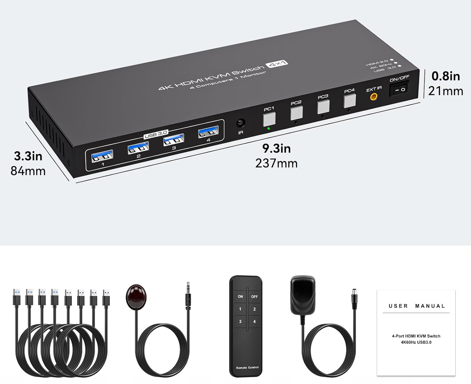 Przełącznik KVM 4 Monitor PC 1: Ten przełącznik HDMI KVM umożliwia 4 komputerom korzystanie z ekranu i udostępnianie 4 urządzeniom USB 3.0, takim jak mysz, klawiatura, drukarka itp. Za pomocą pilota lub przycisków przełączników na panelu można łatwo przełączać się pomiędzy 4 komputerami, bez skomplikowanych procesów. Możesz umieścić produkt poza miejscem pracy, aby zachować porządek na biurku.
