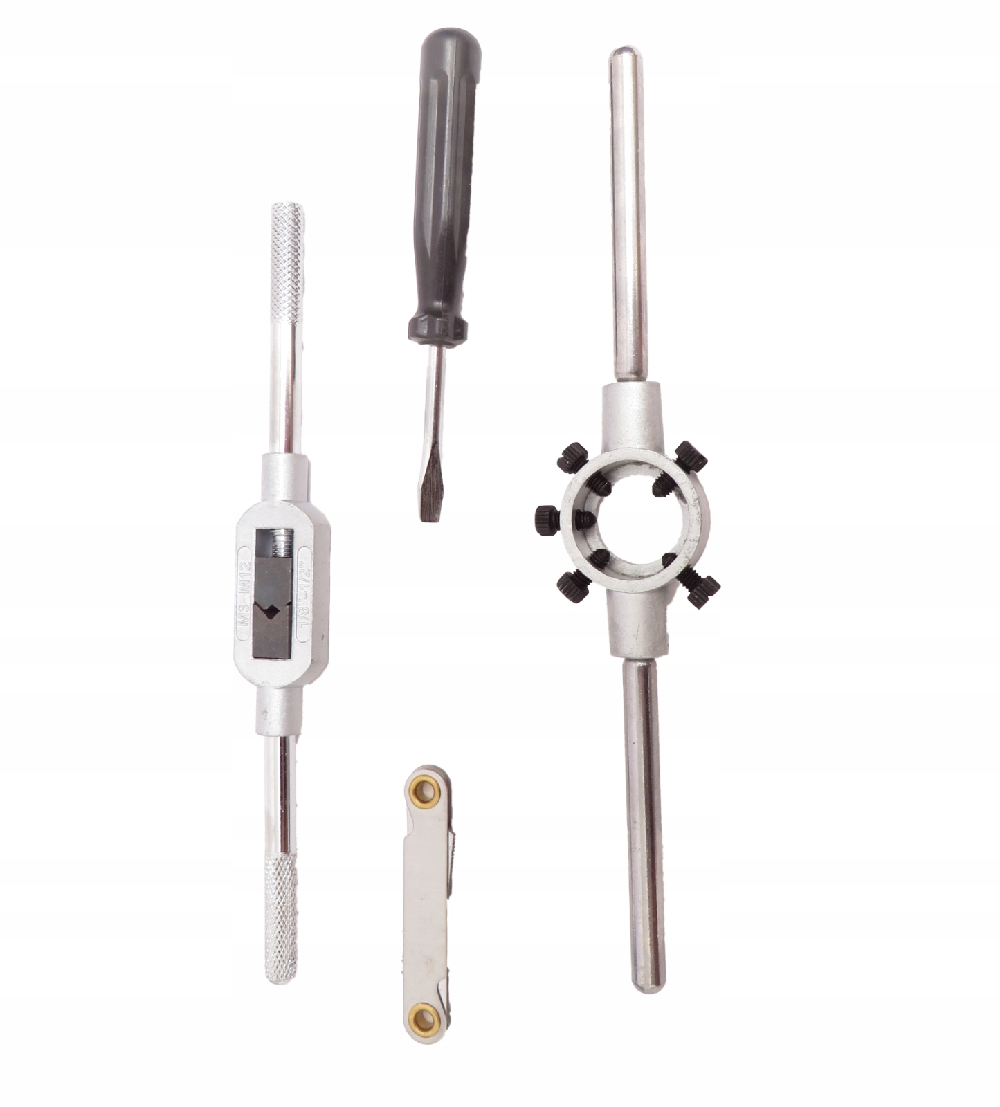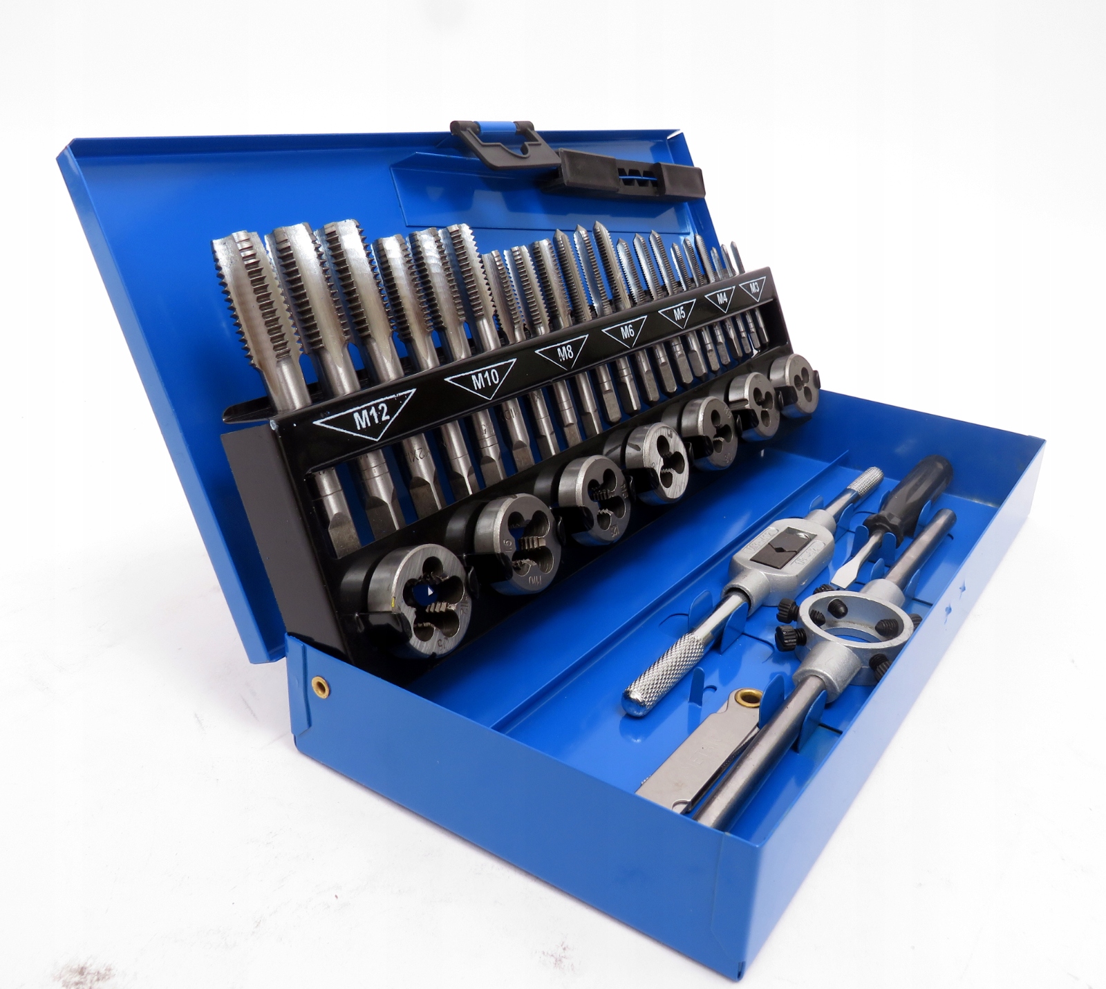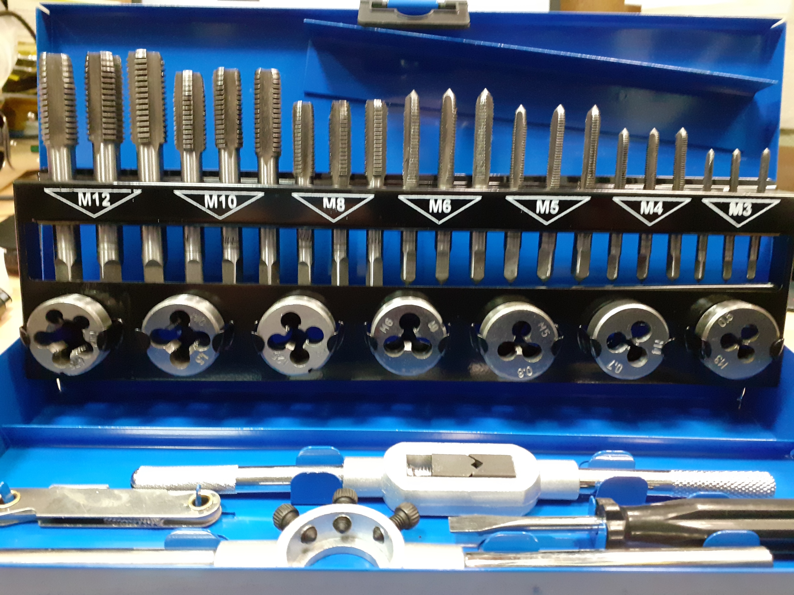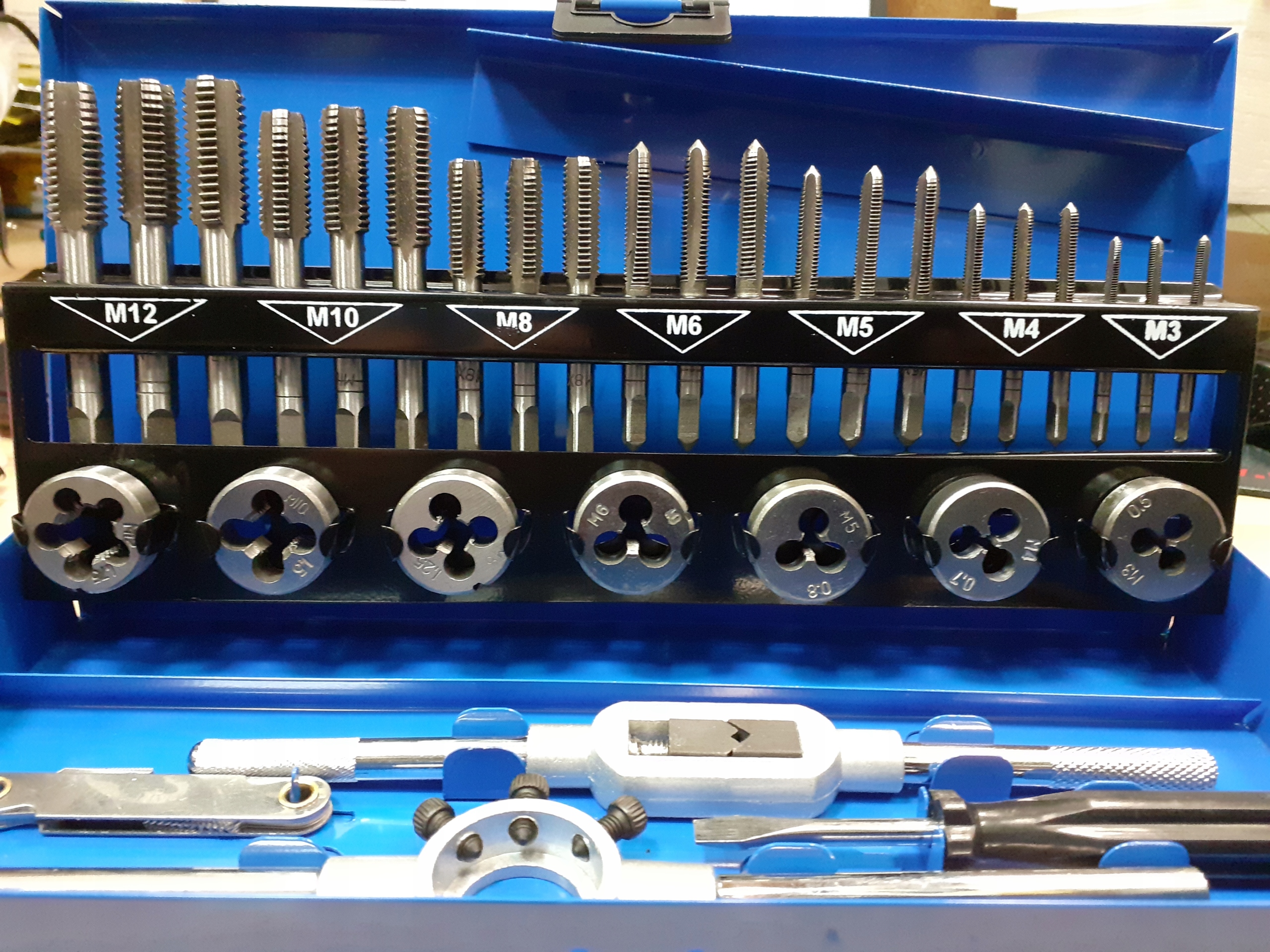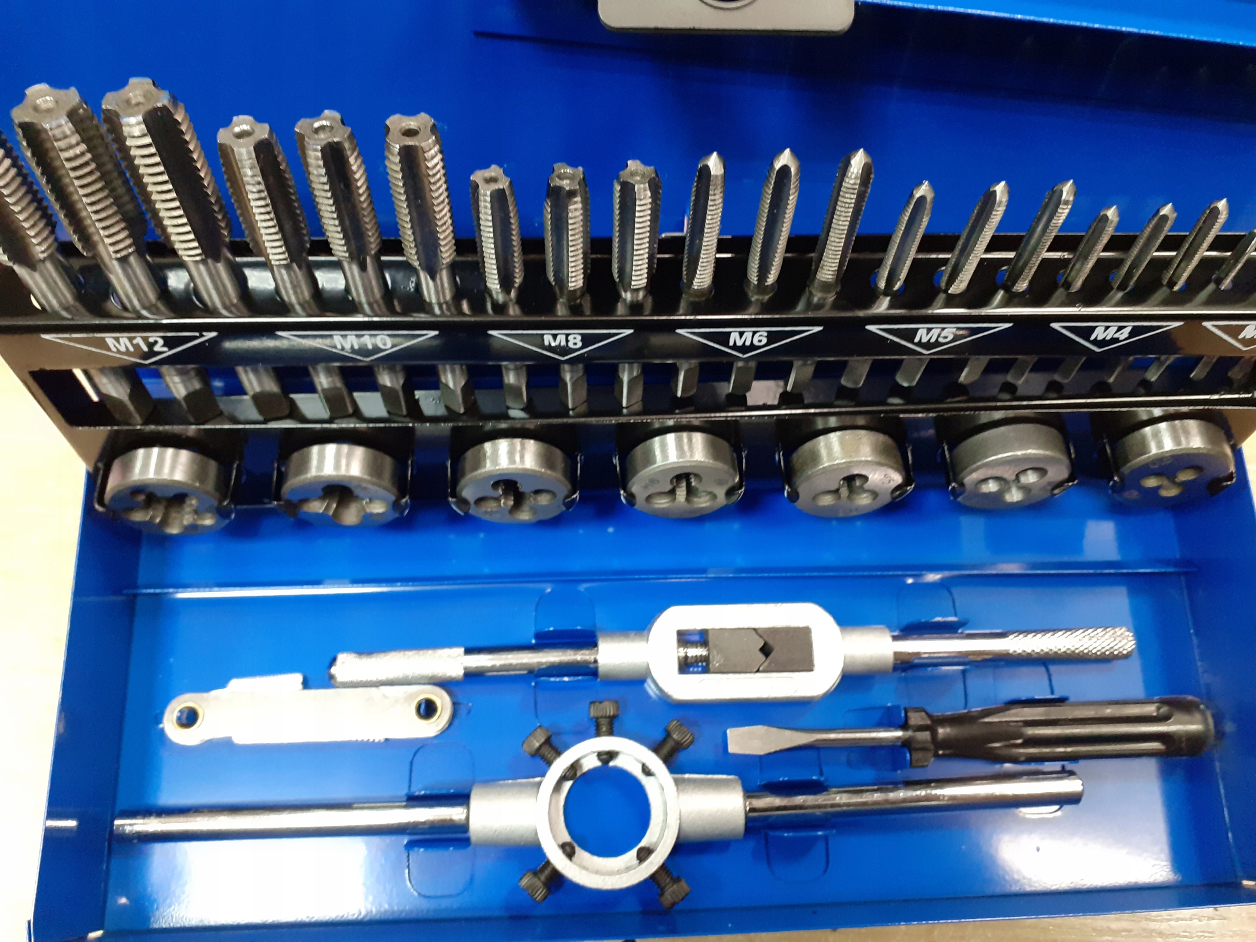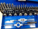 Zestaw narzynek i gwintowników zapakowanych w poręczną walizkę, dzięki czemu każdy element ma swoje stałe miejsce. Zestaw służy do naprawy połączeń gwintowych różnego kalibru.
