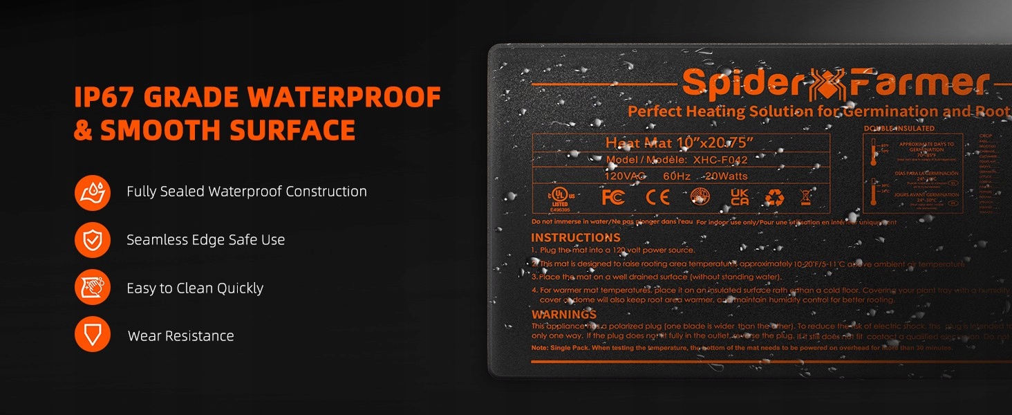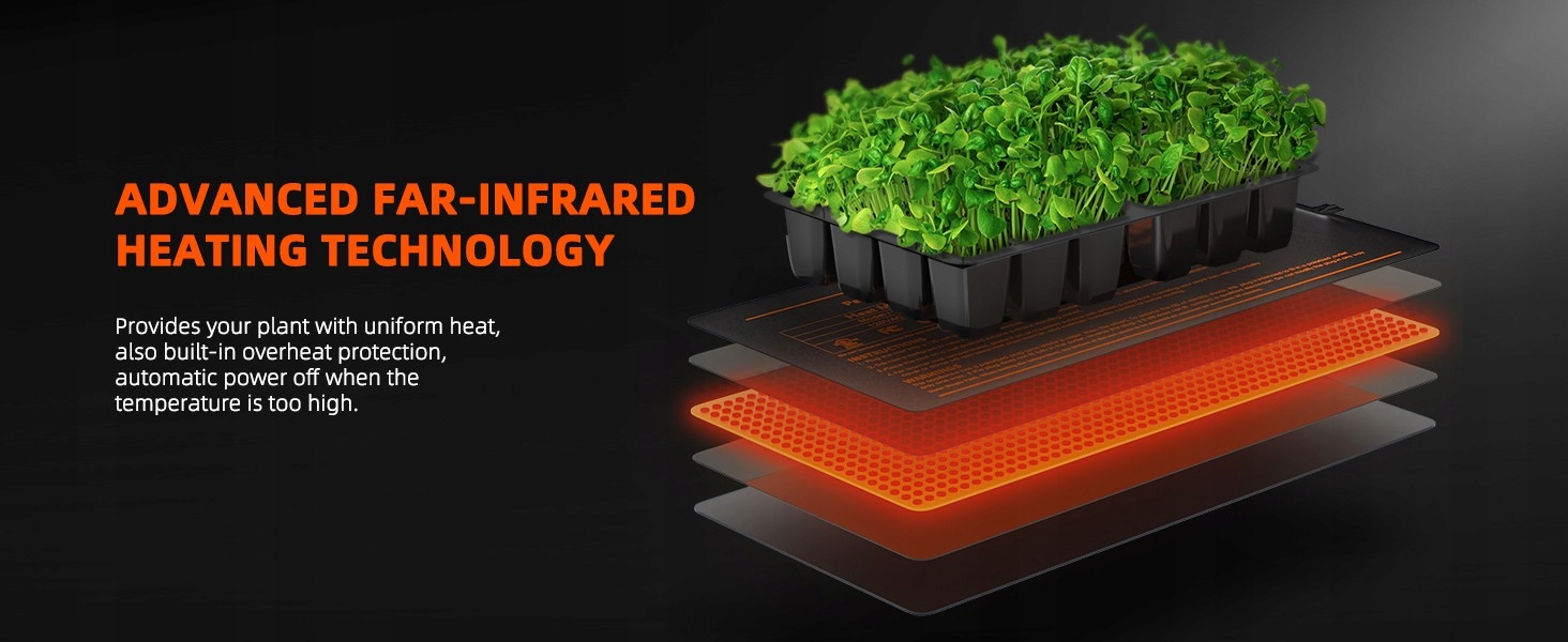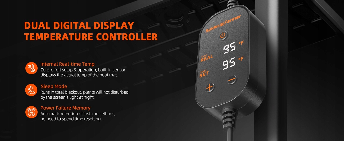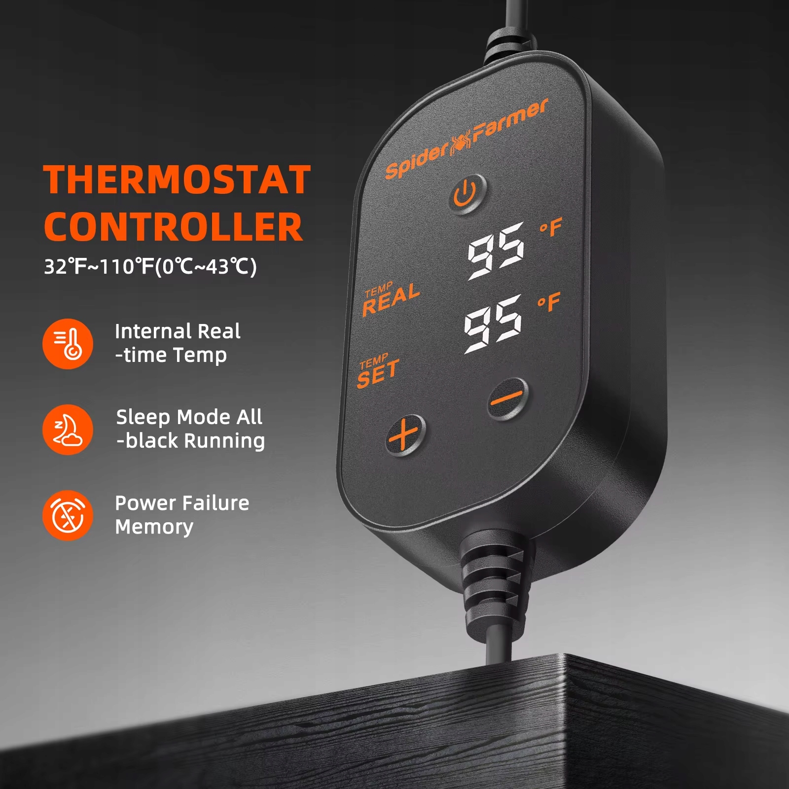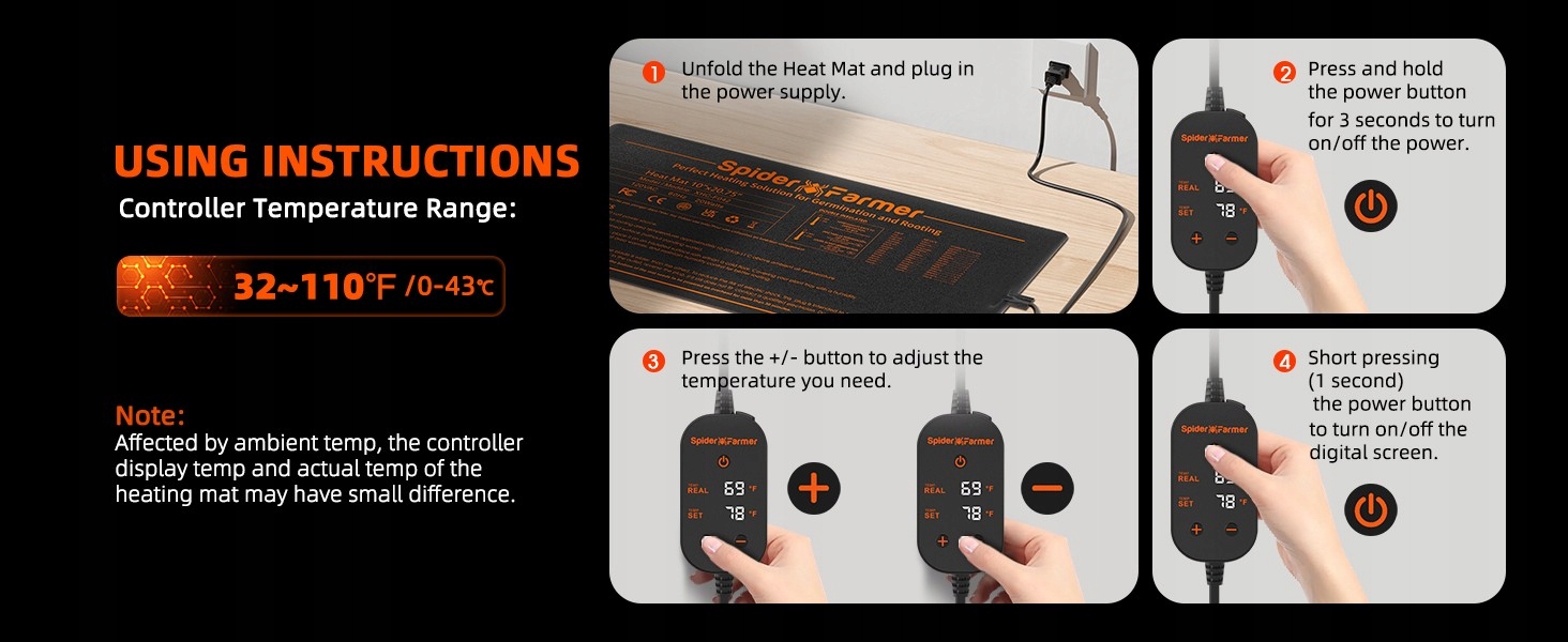 Łatwa Regulacja Temperatury: Dzięki regulatorowi temperatury, temperaturę maty grzewczej można łatwo regulować, zapewniając precyzyjną kontrolę nad środowiskiem uprawy. Zakres ustawień temperatury wynosi 40°F-108°F (5°C-42°C). Zakres wyświetlania temperatury wynosi 32°F-140°F(0°C-60°C).