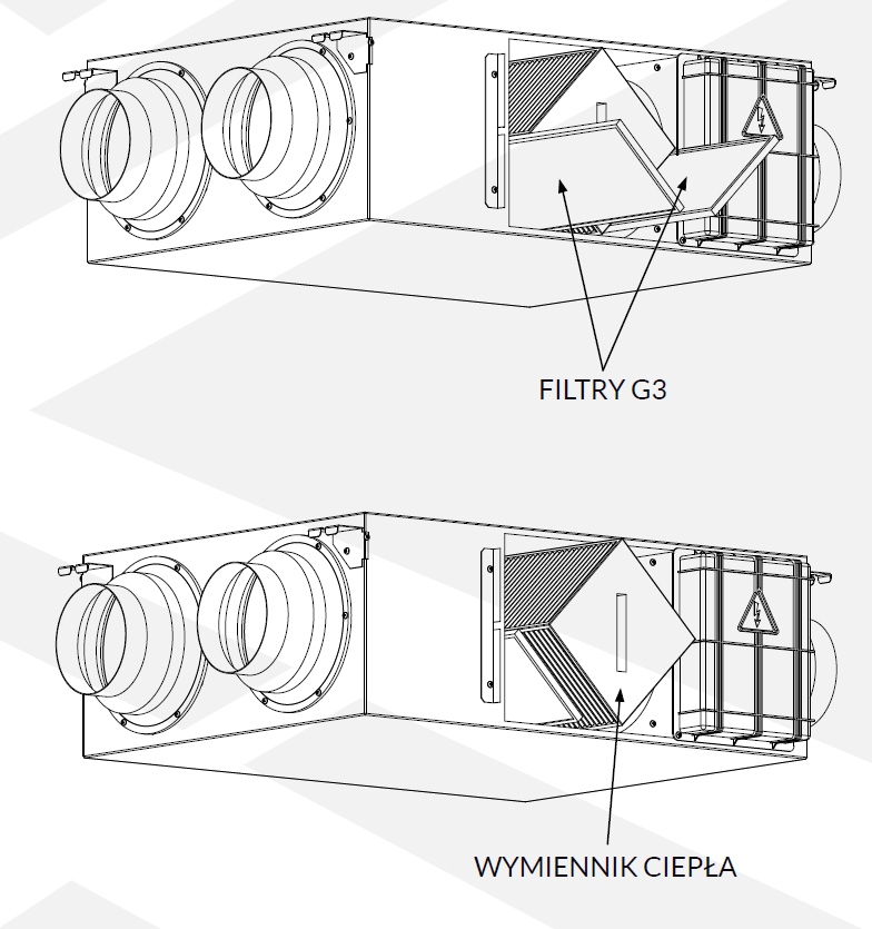 Urządzenie posiada zestaw filtrów - zestawy wstępnych filtrów G3, które właściwie utrzymywane gwarantują odpowiednią czystość powietrza doprowadzanego do pomieszczeń.