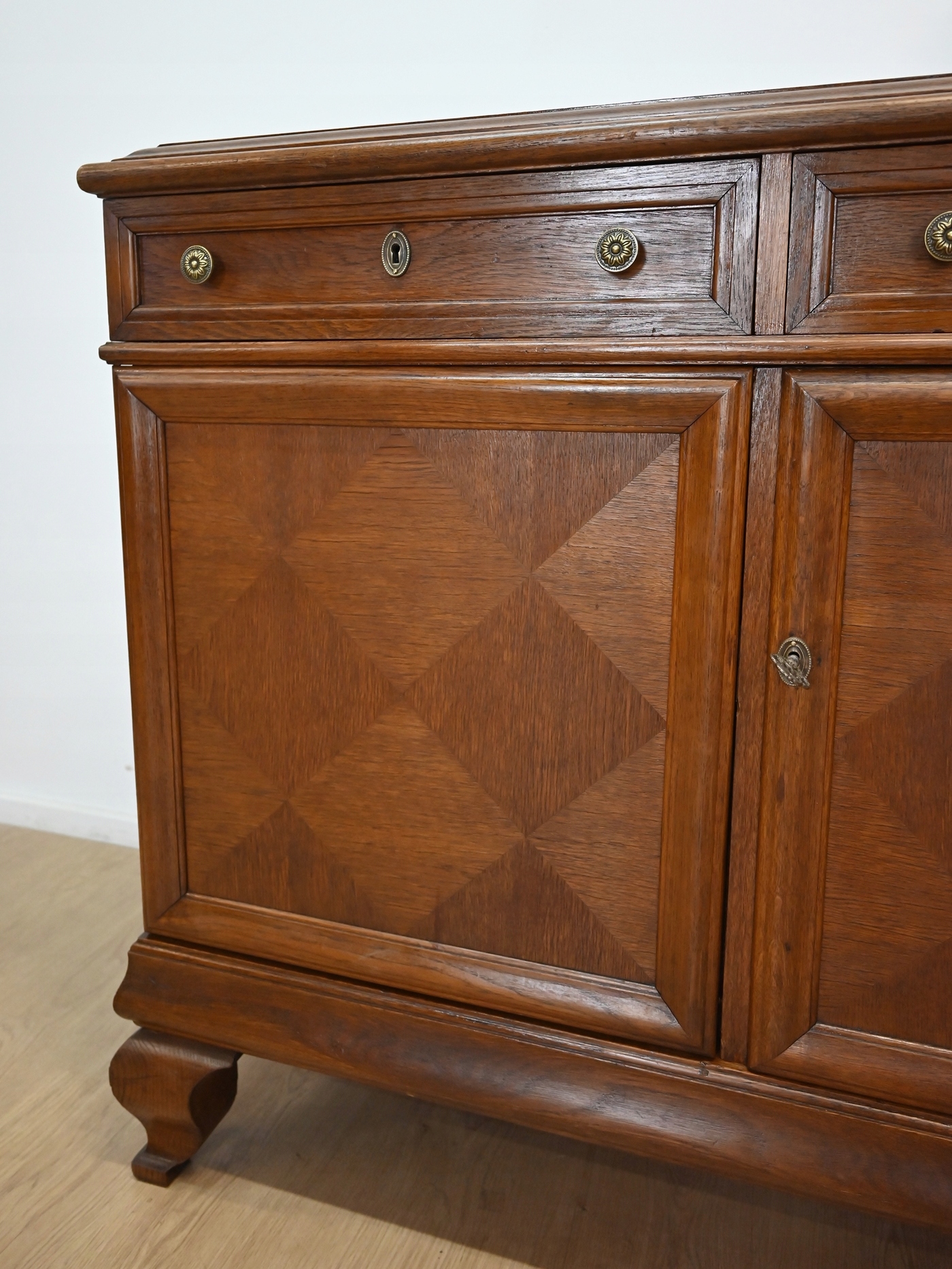 Wykonany jest w całości z drewna, fornirowany dębem.
