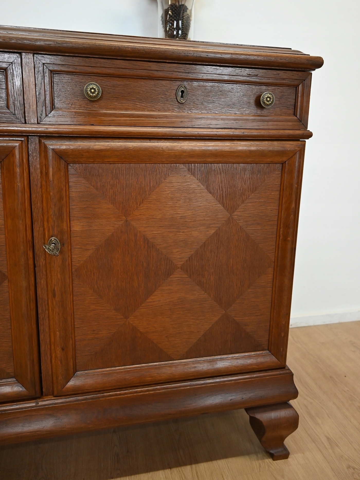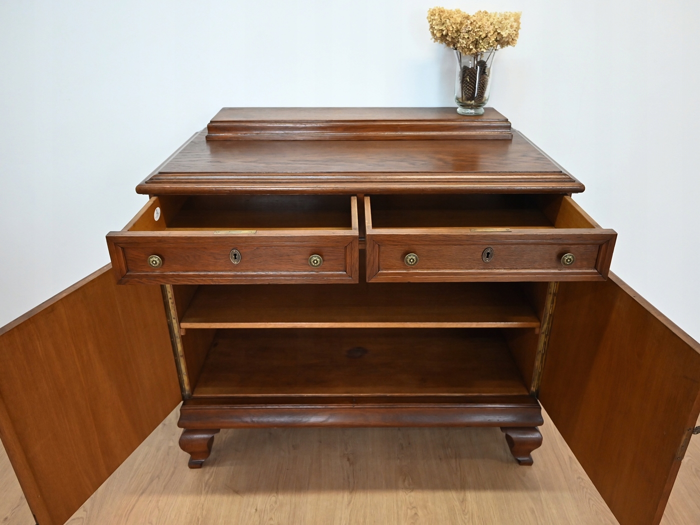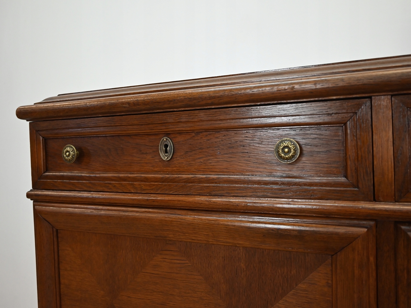 Stan bardzo dobry. Mebel przygotowany do użytkowania. Odświeżone zostały powierzchnie zewnętrzne jak i środek mebla. Mebel ma już swoje lata i ślady minionego czasu, które nie wpływają na jego odbiór estetyczny, są świadectwem autentyczności mebla. Komodę od razu można wstawić do mieszkania.