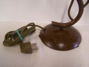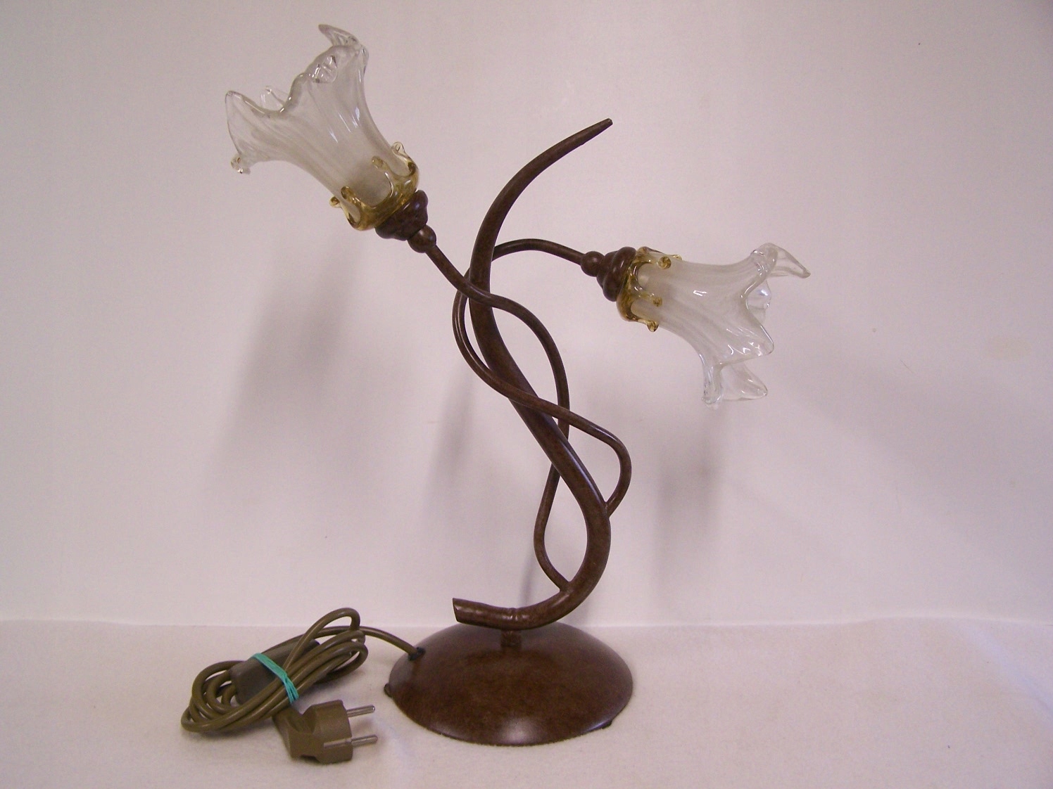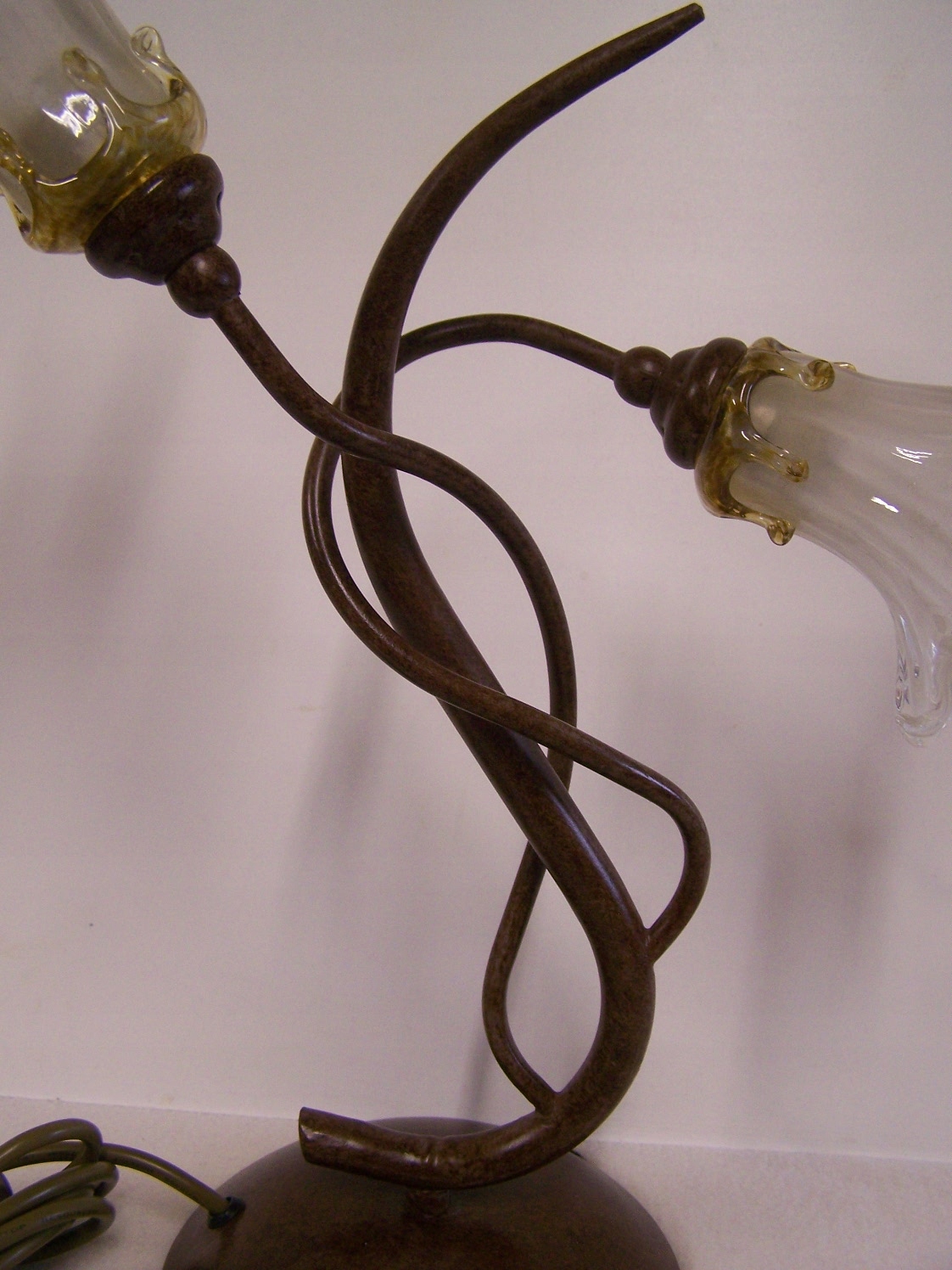 Stylową lampę stołową z dwoma ramionami świetlnymi, wykonaną z metalu w kolorze patynowanego brązu oraz oryginalnych, ręcznie formowanych kloszy szklanych.