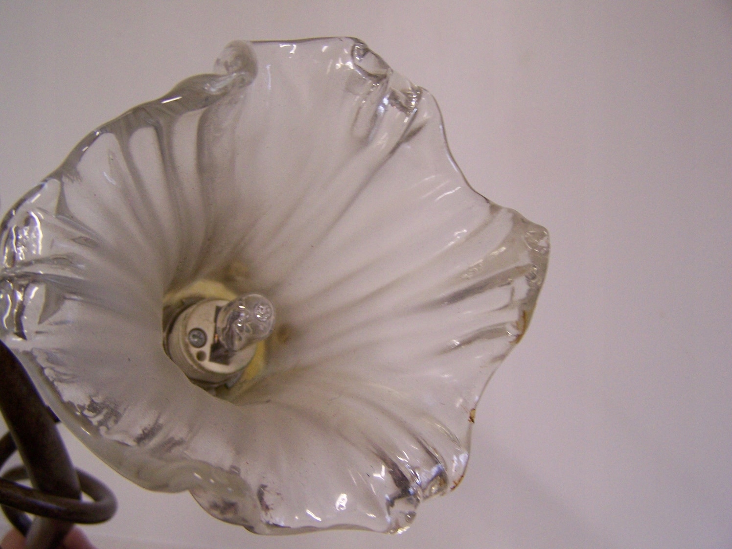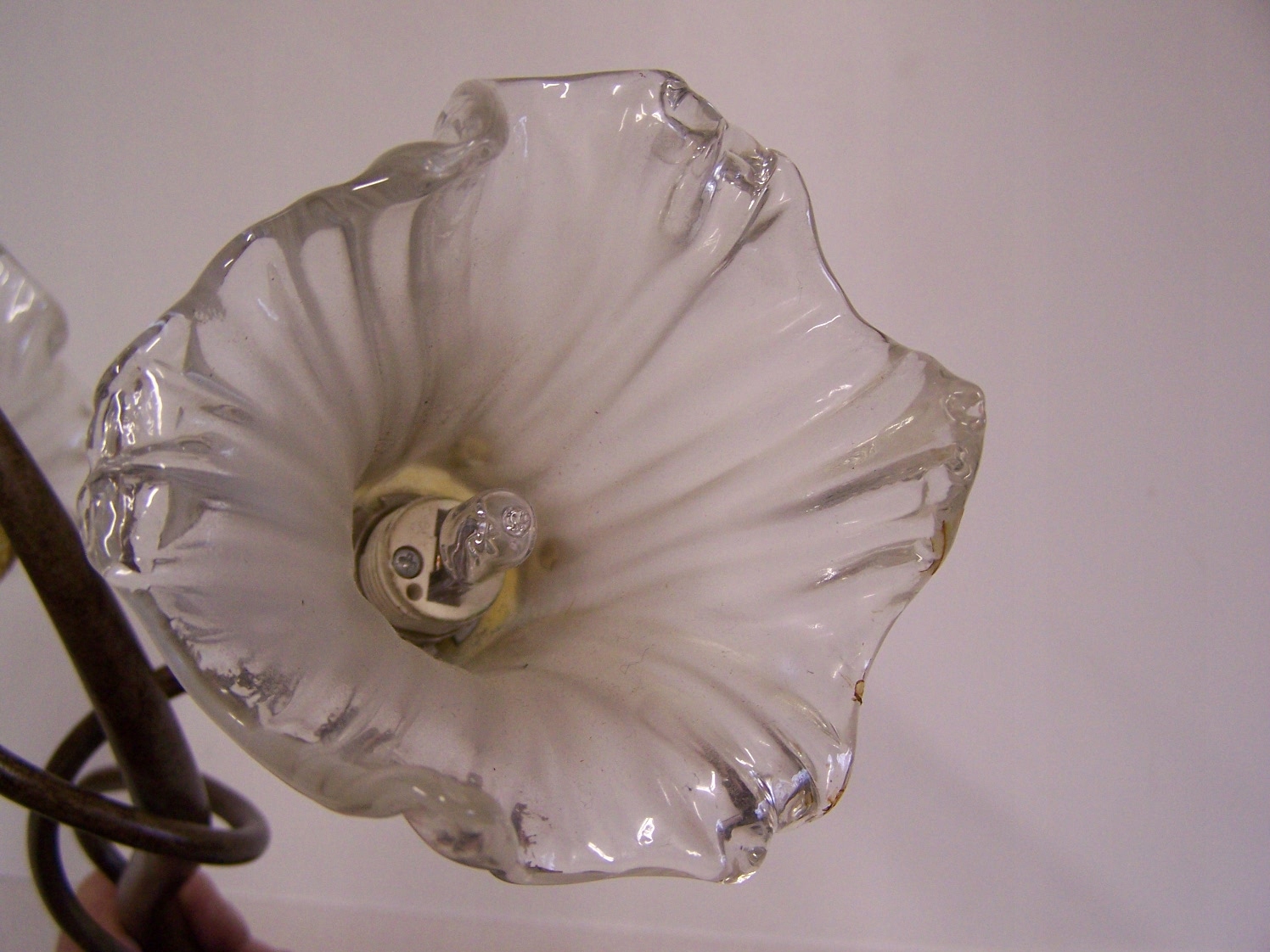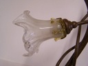 Konstrukcja lampy oparta jest na skręconych, roślinnych ramionach, charakterystycznych dla secesji. Klosze w kształcie kwiatów, z delikatnym mlecznym szkłem i bursztynowymi akcentami przy oprawkach.