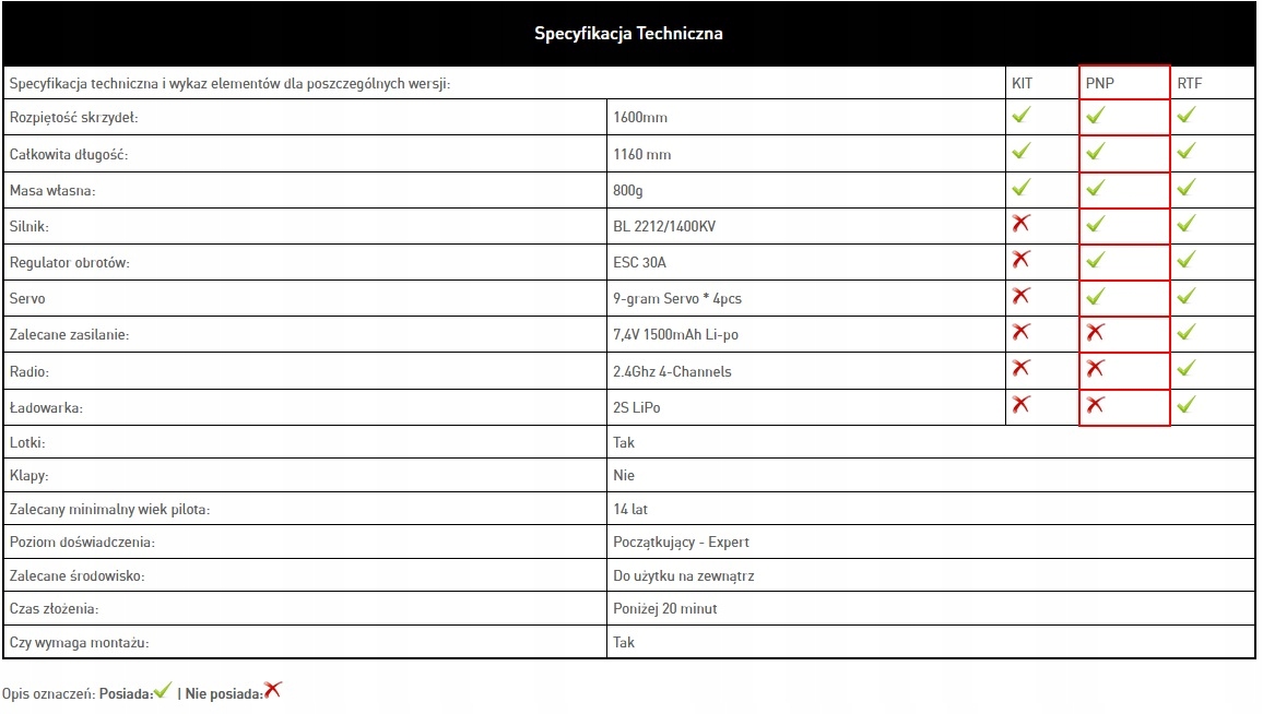 Планер версии PNP, комплект включает в себя модель, двигатель, регулятор и сервоприводы. Самостоятельно необходимо будет купить аккумулятор, зарядное устройство, передатчик и приемник.