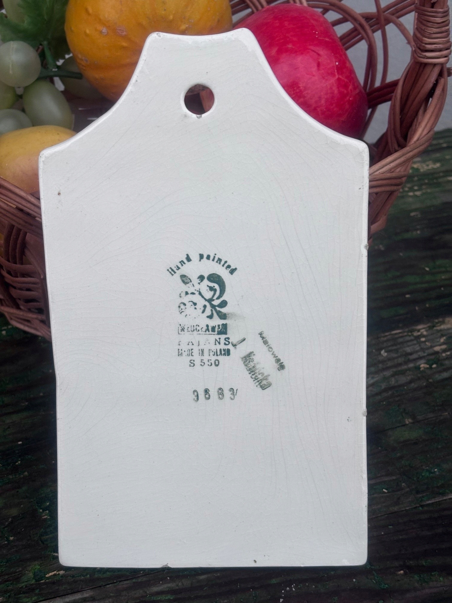 Fajansowa deska z Włocławka z lat 70/80-tych. Sygnowana. Ręcznie malowana. Wzór 1012 zatwierdzony w 1968 r. Projekt Wit Płażewski. Wymiary; wys. 21 x 12 cm. Drobne ubytki , poza tym niewielkie ślady użytkowania. Stan deski pokazano na zdjęciach.