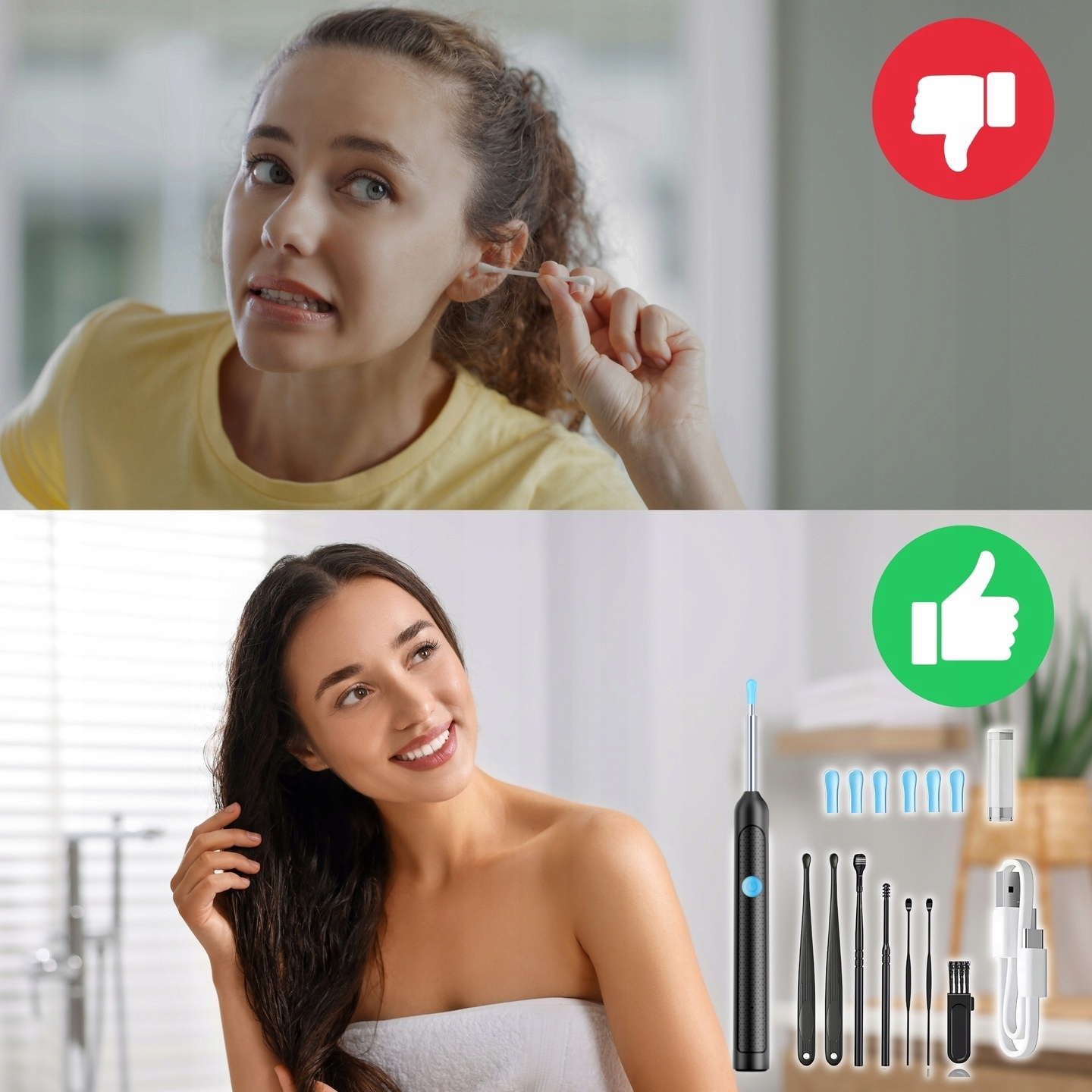 Bezpieczna i miękka silikonowa łyżka do uszu: środek do czyszczenia uszu ma obrotowe plastikowe nauszniki ABS, które zapobiegają ich wypadaniu podczas użytkowania. Przed użyciem upewnij się, że silikonowa nakładka na ucho jest dobrze dopasowana do nakładki na ucho.