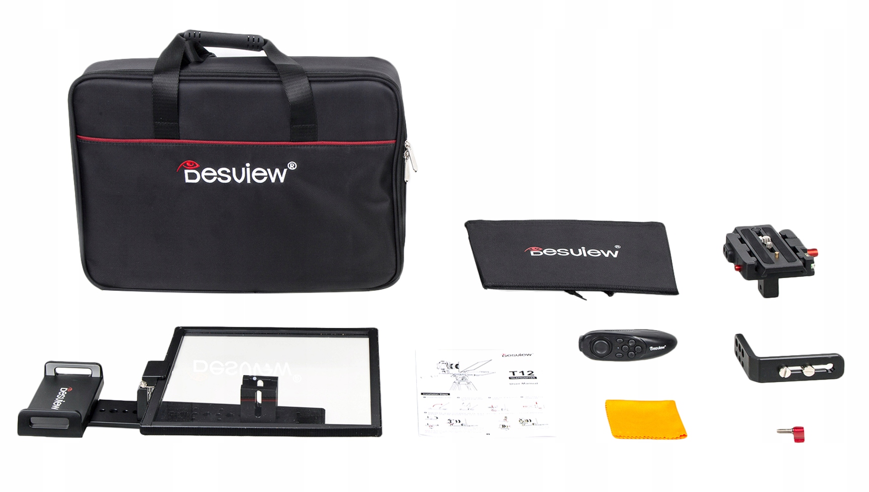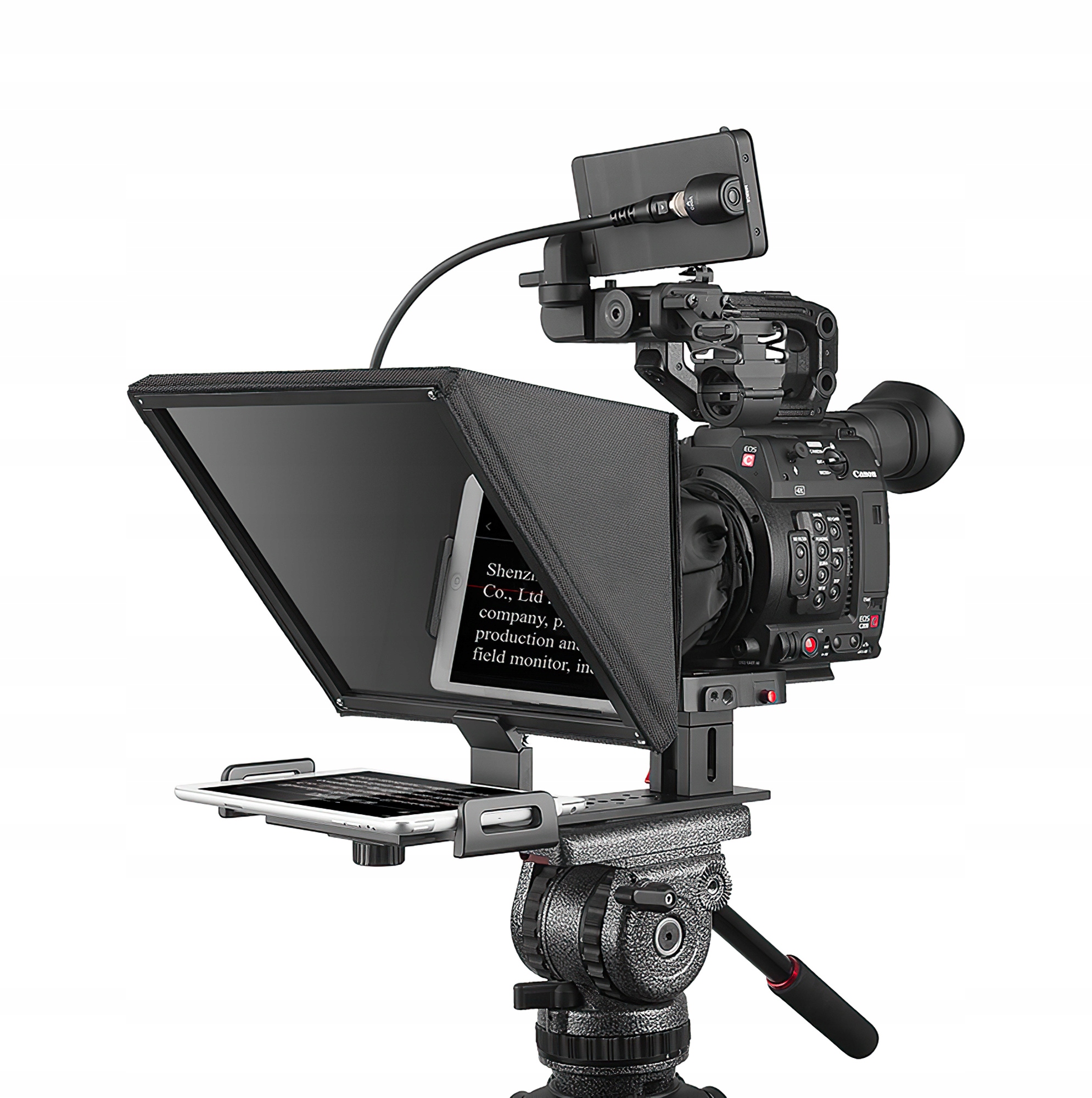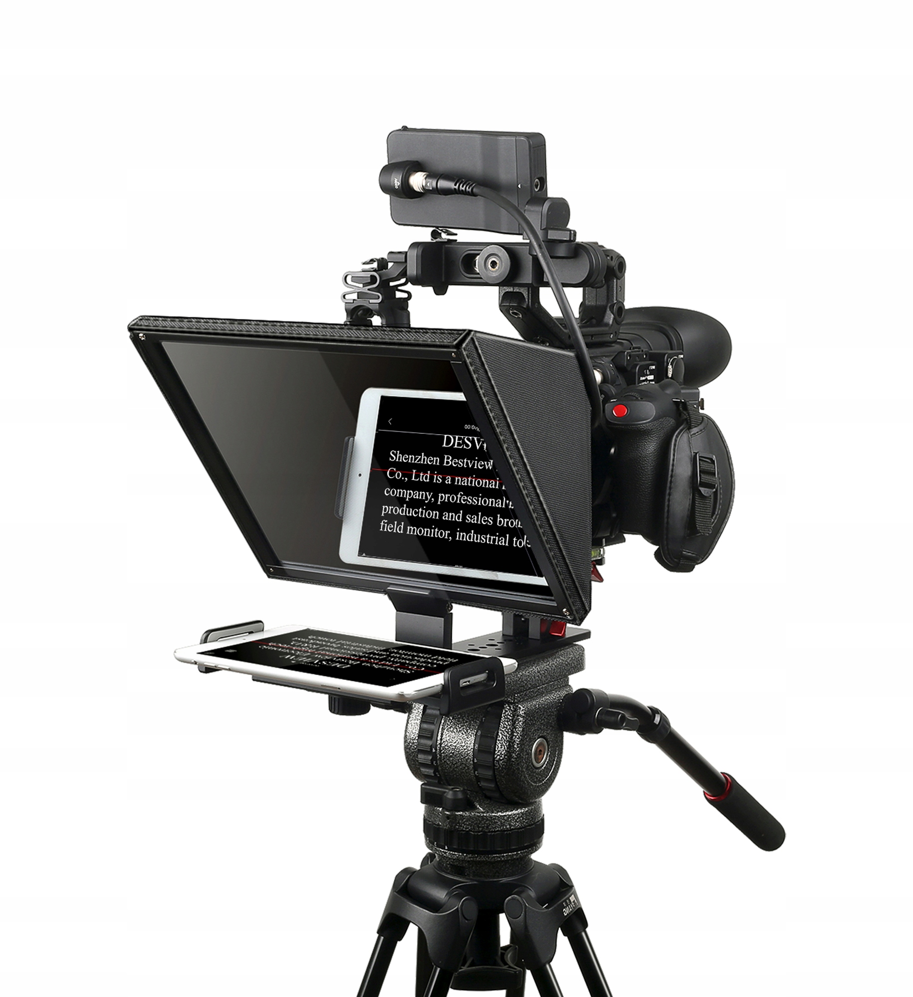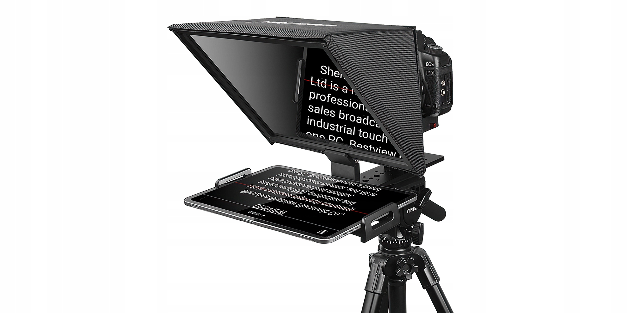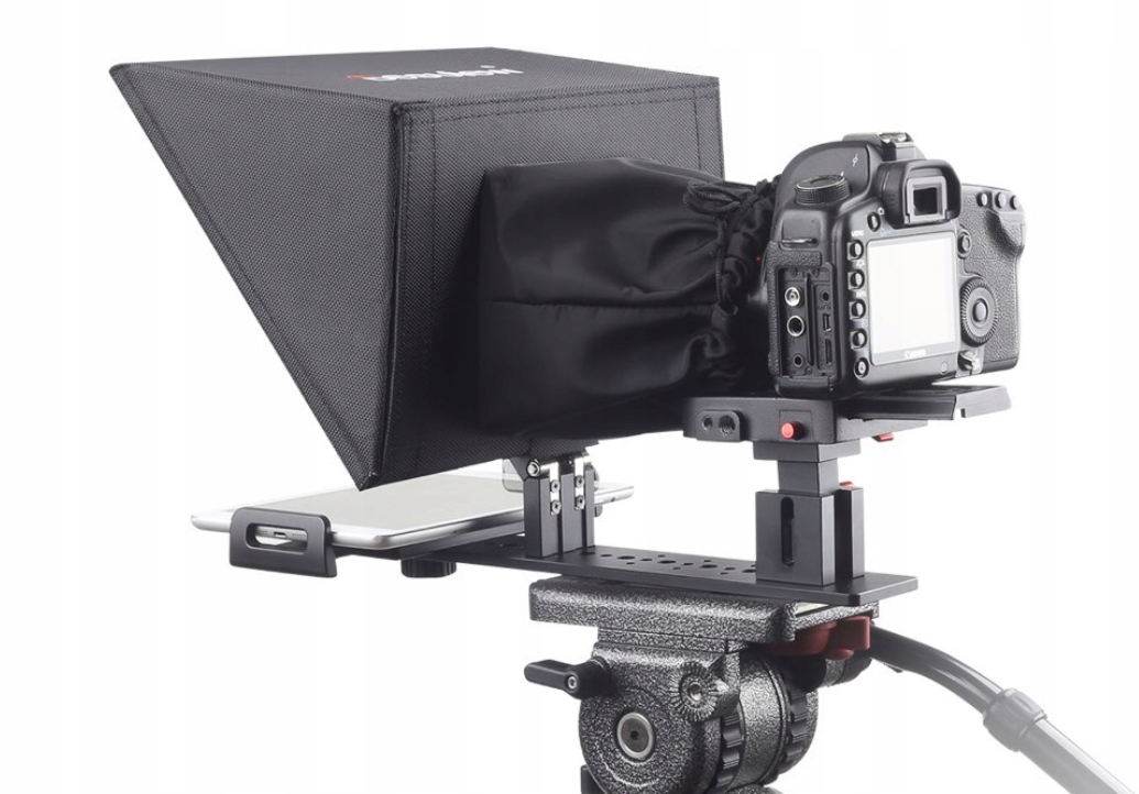 Oferuje on profesjonalny uchwyt, który wygodnie zainstalujesz na statywie, a następnie połączysz z tabletem lub smartfonem o maksymalnej przekątnej wynoszącej 11”. Czytany tekst odbije się na wysokiej jakości lustrze wykonanym z 26-warstwowego szkła rozdzielającego wiązkę światła. Komfort pracy podniesie dołączony do zestawu pilot Bluetooth oraz darmowa aplikacja (iOS/Android), które pozwolą sterować wyświetlanym scenariuszem.