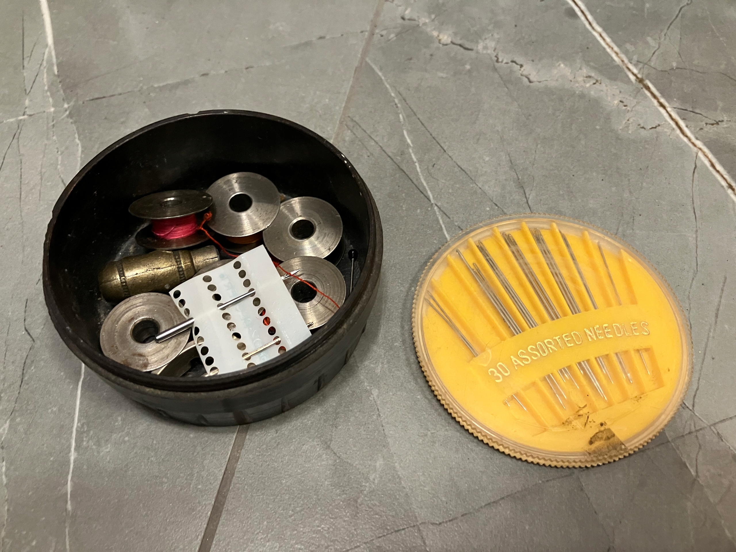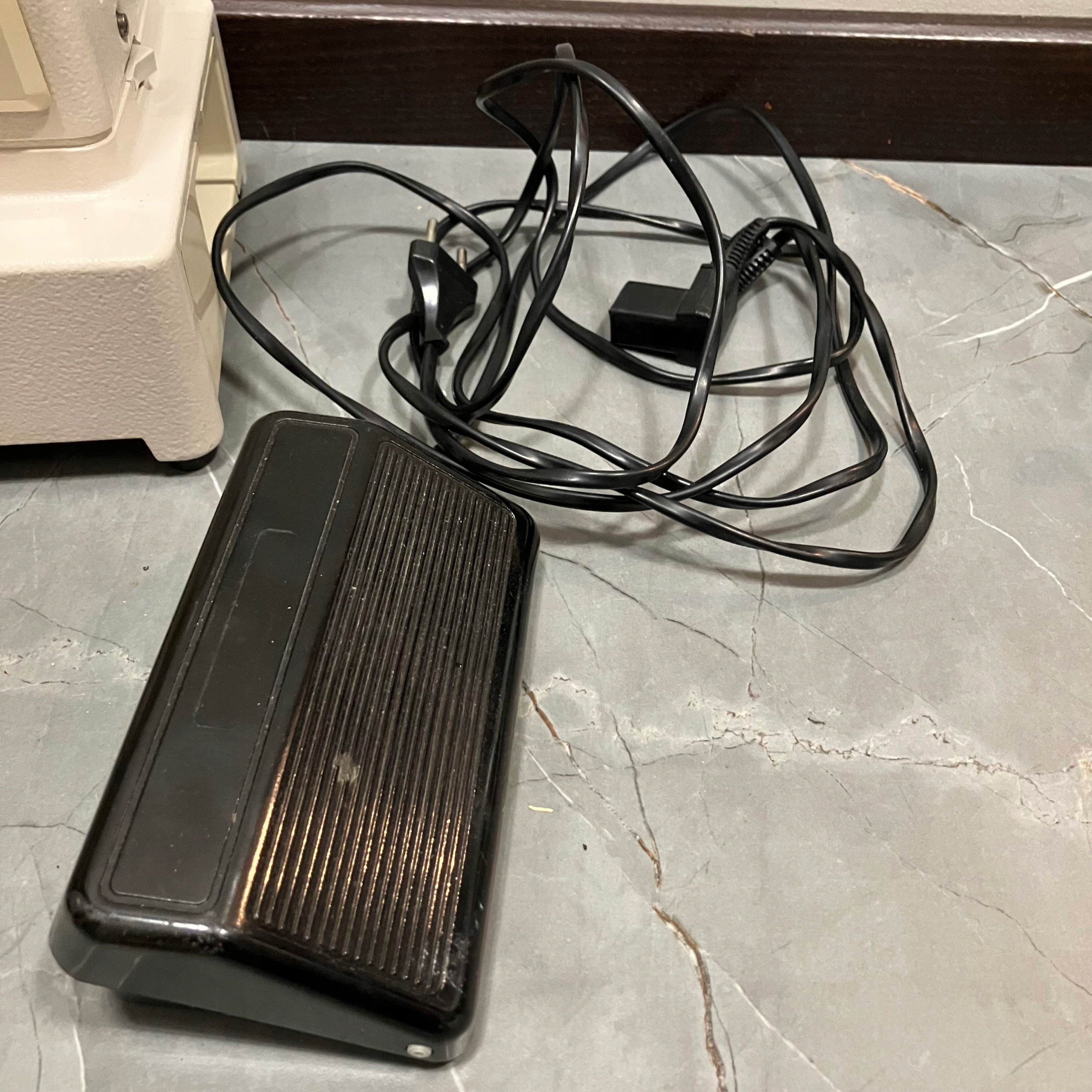 W zestawie pedał z przewodem zasilającym, plastikowa przedłużka, pudełeczko ze szpulkami i igłami