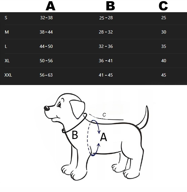 Aby dobrać właściwy rozmiar, zmierz obwód szyi kota (nisko, nad łopatkami) - pomiar A, a także obwód klatki piersiowej w najszerszym miejscu - pomiar B , jak na rysunku obok. Następnie porównaj pomiary z tabelą rozmiarów. Niektóre rozmiary pokrywają się - w takim wypadku weź pod uwagę, czy pies jeszcze rośnie, a także jego temperament - im większy i bardziej energiczny jest pies, tym większy rozmiar należy wybrać.