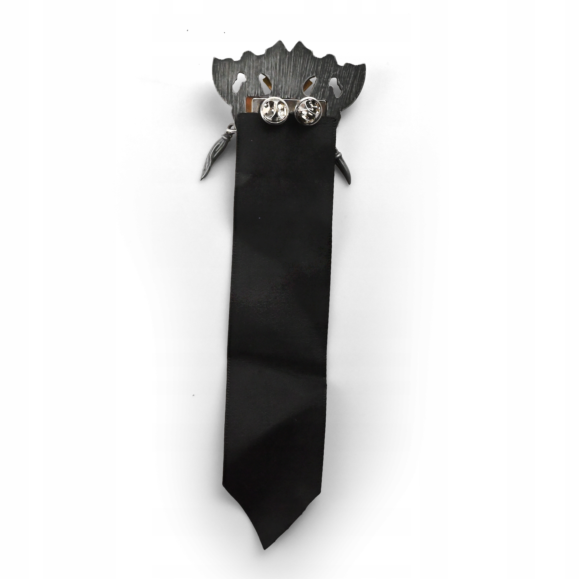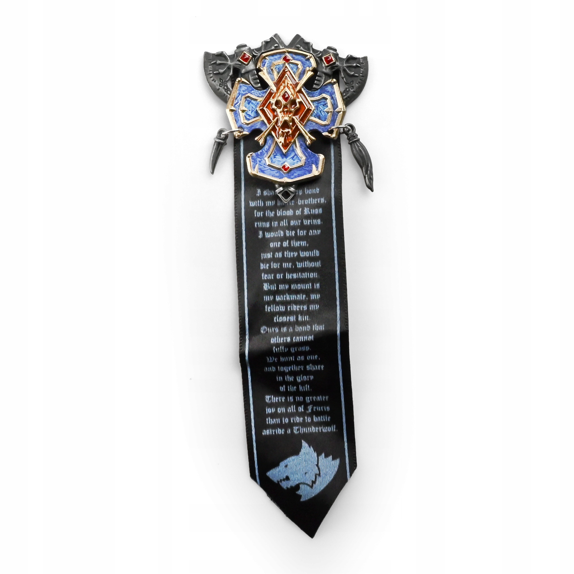 W Warhammer 40k — od lodowego Fenrisa po niekończące się wojny 41. milenium — Space Wolves nie ruszają w bój bez znaków, które mówią: „to jest mój wilczy ród”. Ten wyrazisty pin Space Wolves (8 cm) przenosi ten klimat prosto na Twoją kurtkę, plecak albo tablicę kolekcjonerską, żebyś mógł/mogła nosić dumę Synów Russa z konkretną, ceremonialną energią godną sagi Wielkiej Kompanii. To Space Wolves collectible, który świetnie pasuje do klasycznej heraldyki rozdziału i „kodeksowej” estetyki. Metalowa konstrukcja ma ostre, warstwowe tłoczenia: szczotkowany, ciemny „gunmetal” na spodzie i jasne złote obramowania, które zamykają krzyżowy układ z marmurkową, kobaltową emalią. Małe rubinowe, kwadratowe akcenty dodają pazura, a w centrum siedzi ognisty bursztynowo-czerwony romb z wypukłą czaszką i skrzyżowanymi kośćmi. Dwa dyndające detale — jeden jak kieł, drugi jak ciemny, pleciony ogon — dają ruch i bardziej „dziki” charakter. Pod odznaką zwisa długa czarna wstęga z jasnoniebieską lamówką, gotyckim tekstem przysięgi i wilczą głową przy ostrym zakończeniu. Z tyłu są dwa bolce z metalowymi „motylkami”, więc całość siedzi stabilnie i równo — przypnij i niech Twoja kolekcja zawyje.