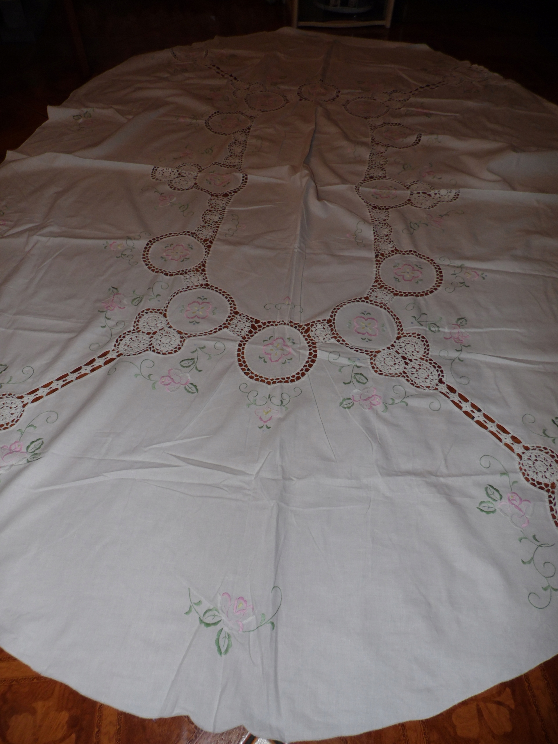 Do zaoferowania mam ładny duzy baełniany , owalny obrus z haftem i koronka szydełkowa.