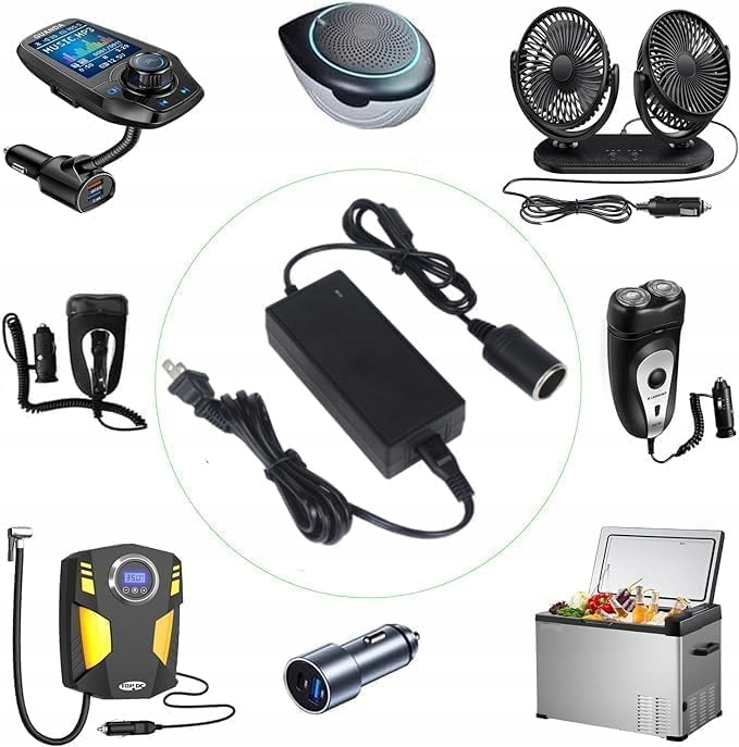 wysokiej jakości adapter 230 V na gniazdo zapalniczki samochodowej 12 V do domowego użytku akcesoriów samochodowych, takich jak odkurzacze samochodowe czy lodówki samochodowe. Ponieważ zamienia prąd domowy na prąd stały 12 V i ma gniazdo zapalniczki, możesz używać akcesoriów samochodowych i akcesoriów obsługujących napięcie wejściowe 12 V, takich jak lodówki samochodowe i odkurzacze samochodowe, w domu