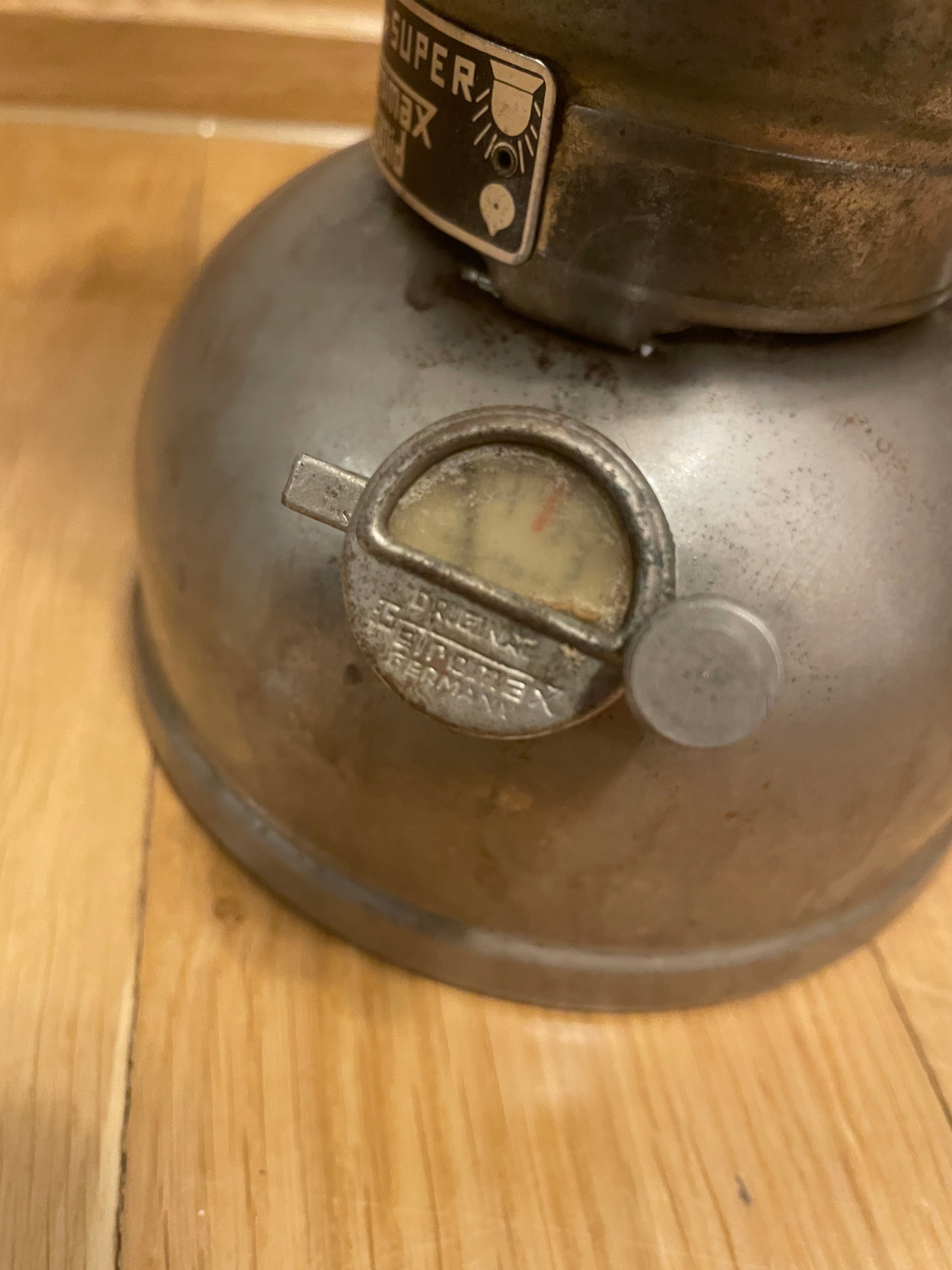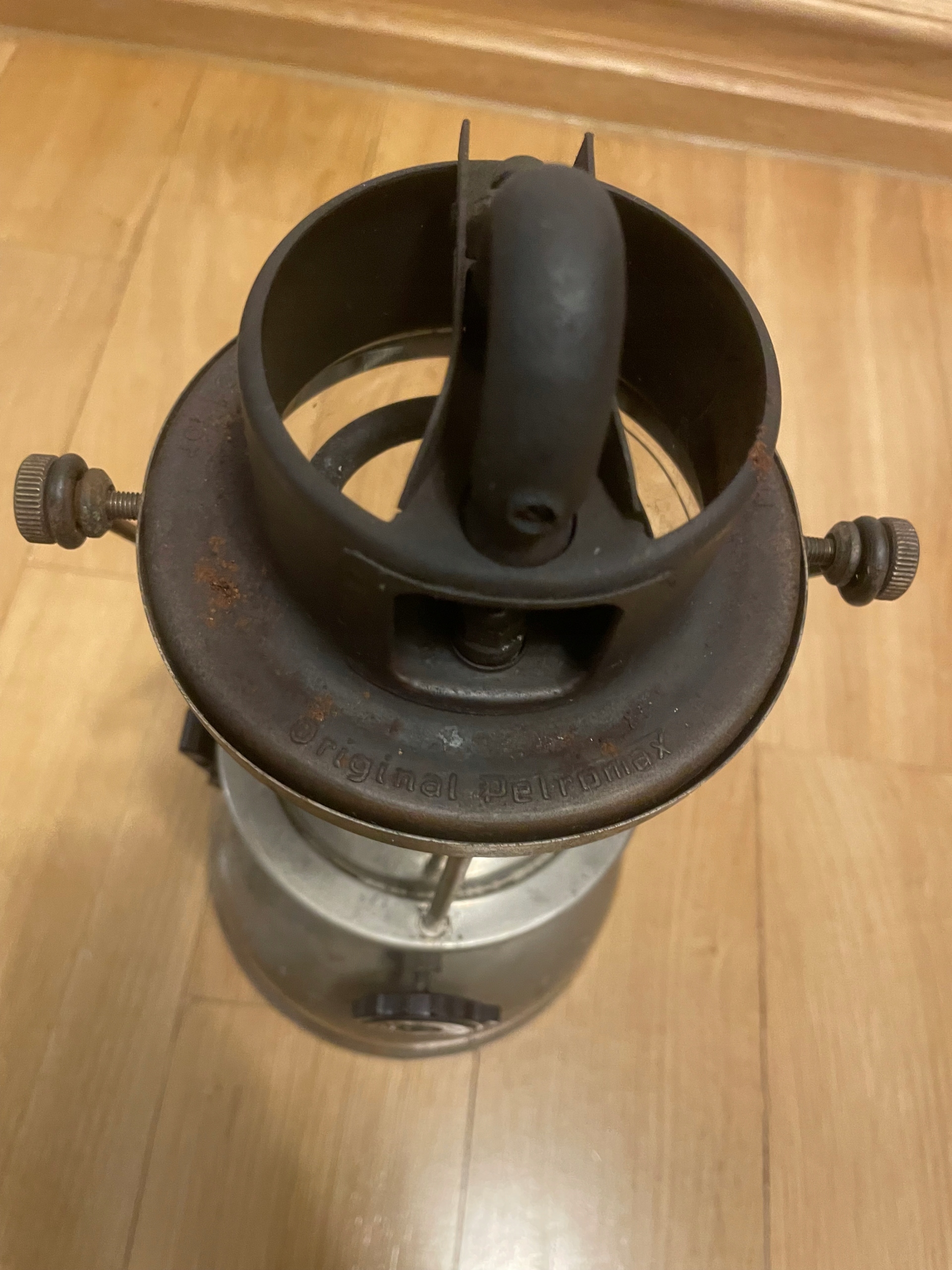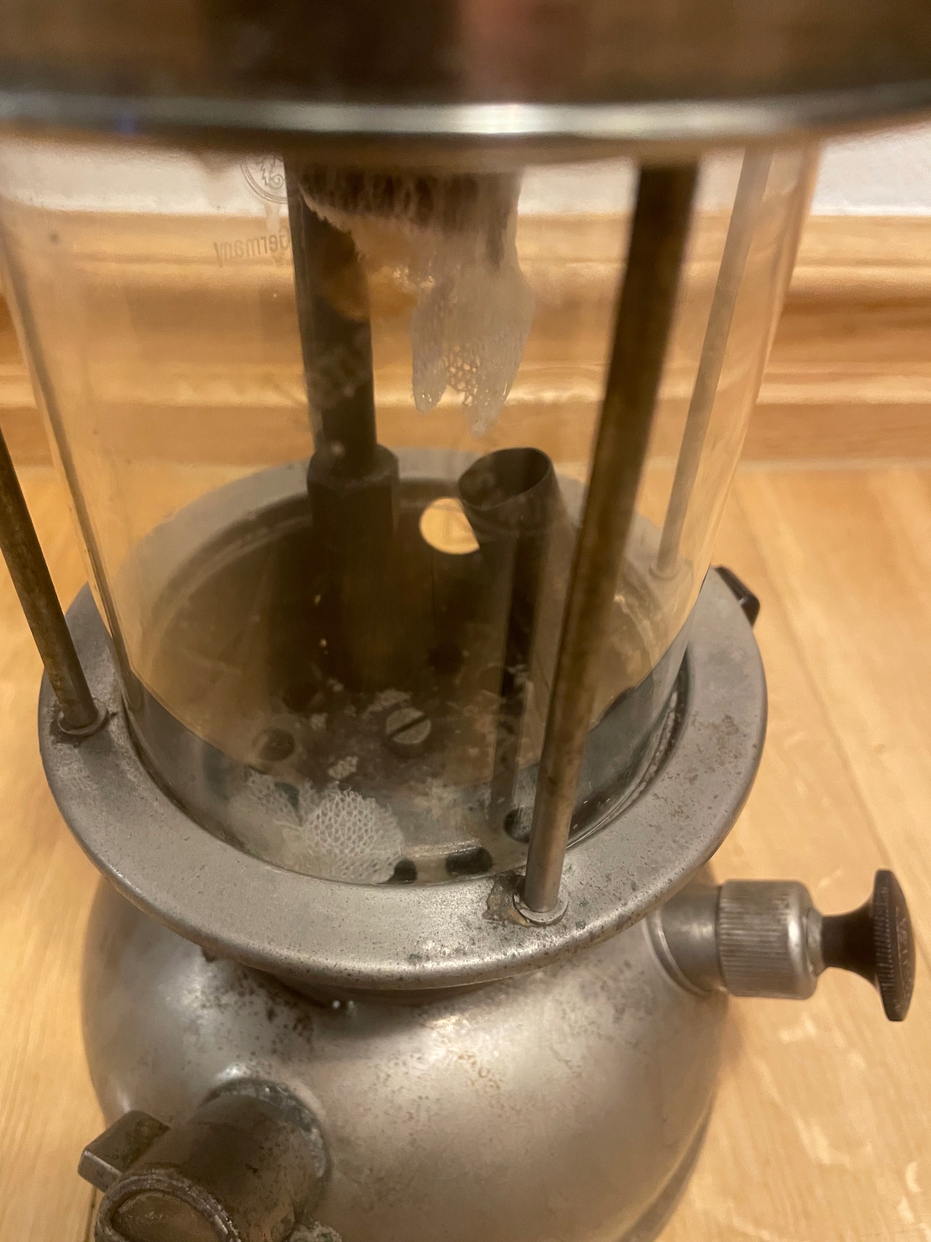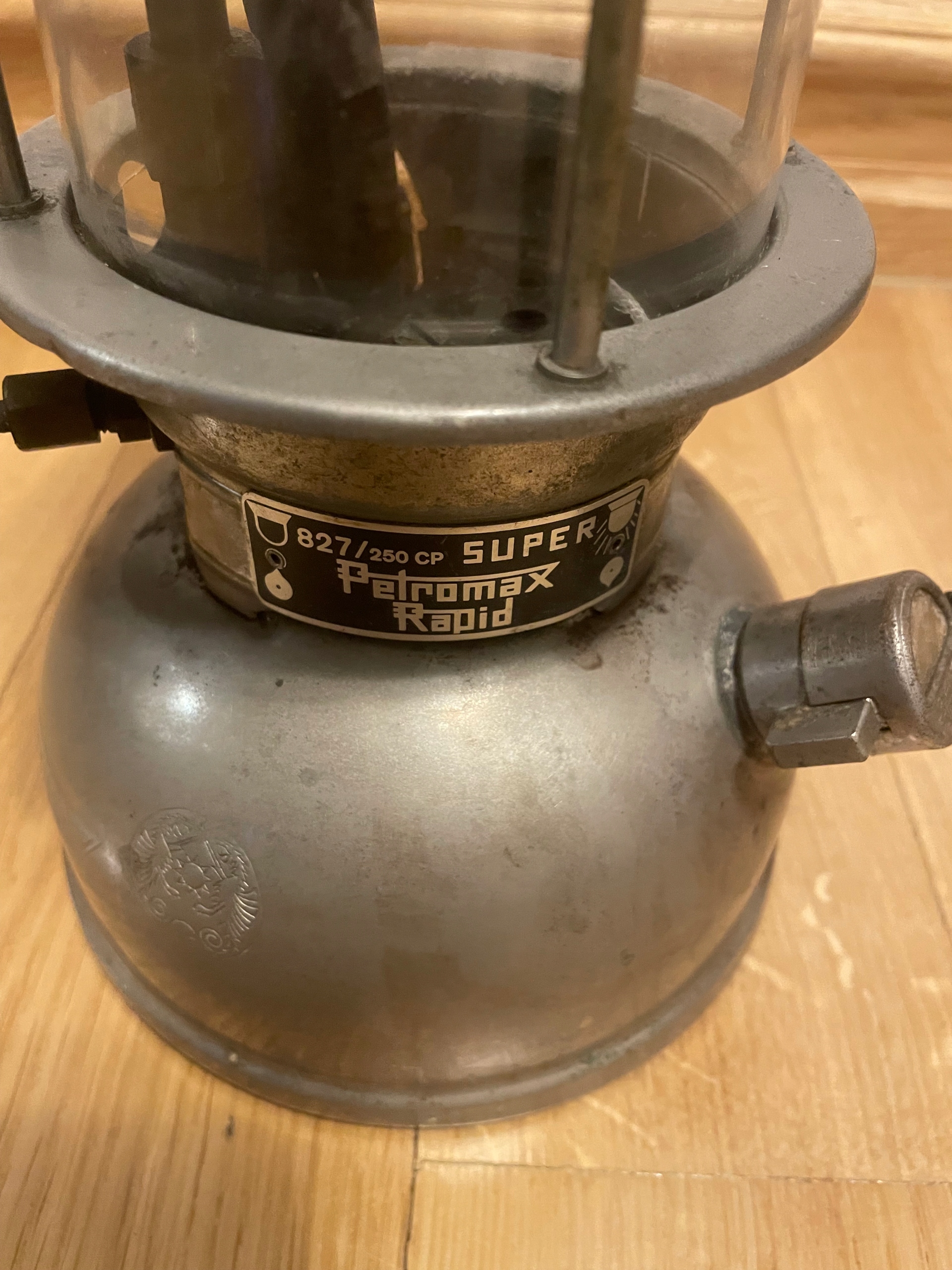 Lampa cisnieniowa Petromax jak na zdjeciach. Uszkodzony jest materialowy koszyczek wewnatrz i klosz jest pekniety w gornej czesci co widac na zdjeciach. Wysylka tylko w Polsce.