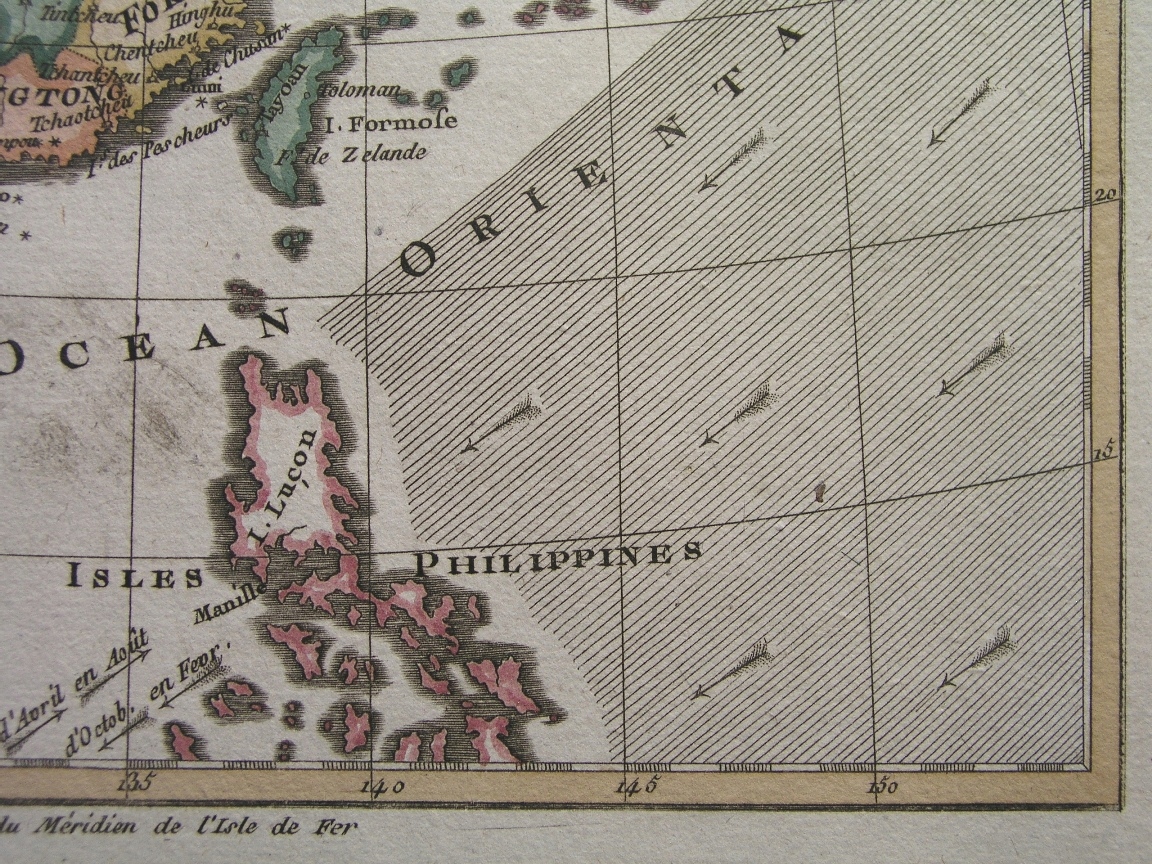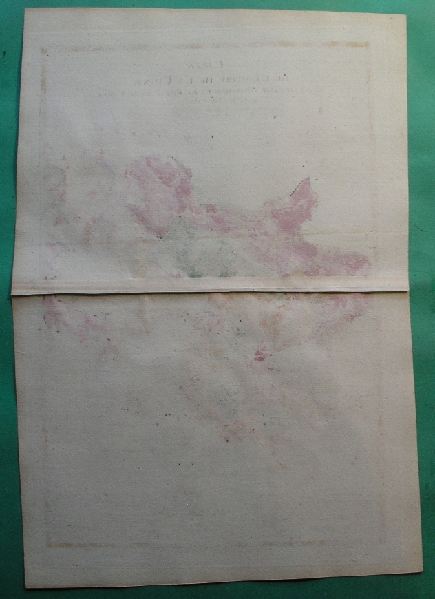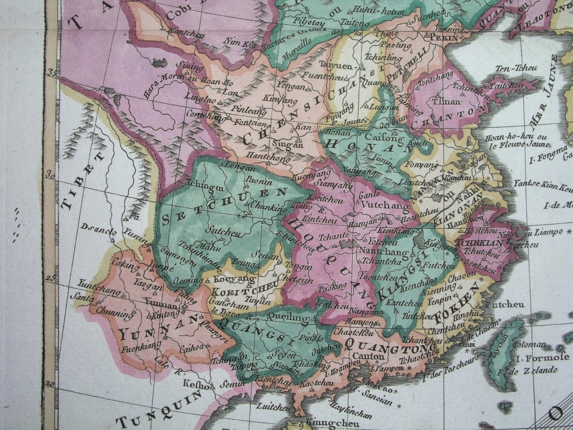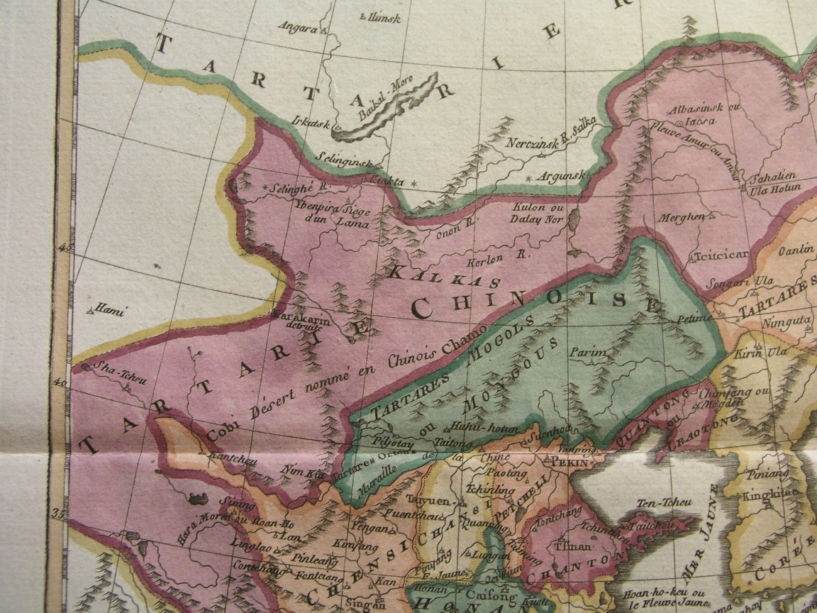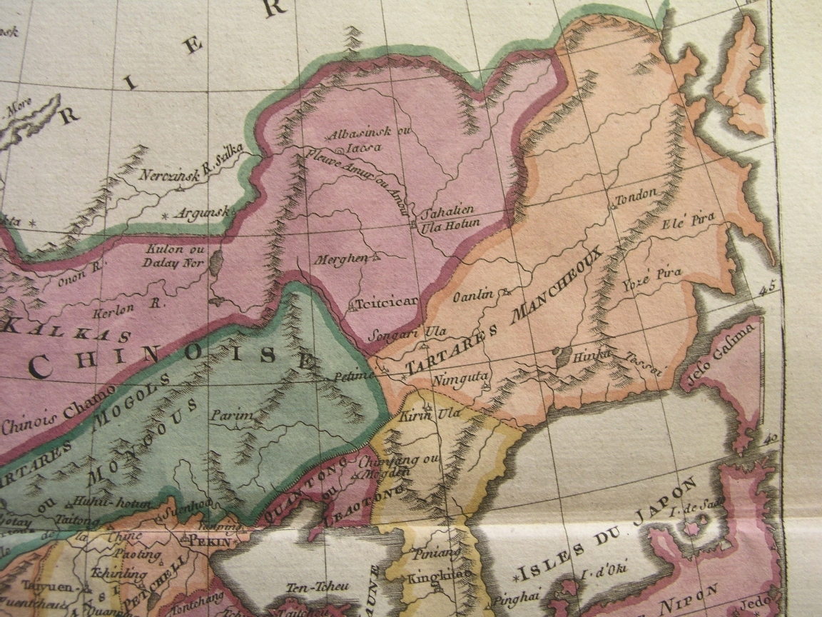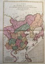 ORYGINALNA MAPA WSCHODNIEJ AZJI Rigoberta Bonne zamieszczona w pracy G. Raynala pt. "Atlas de Toutes les Parties Connues de Globe Terrestre...", Paryż 1780 r. Jest to miedzioryt ręcznie kolorowany liniowo i powierzchniowo, wyraźnie odbity na arkuszu żeberkowanego papieru czerpanego, zaopatrzony w trzy skale liniowe i prosty kartusz z nazwą mapy; arkusz zgięty w połowie (zgięcie atlasowe). Wymiary mapy z ramką: 32 na 21,5 cm, a arkusza ca 36 na 25 cm. Stan zachowania bardzo dobry (niewielkie przebarwienia i zabrudzenia obrzeży).