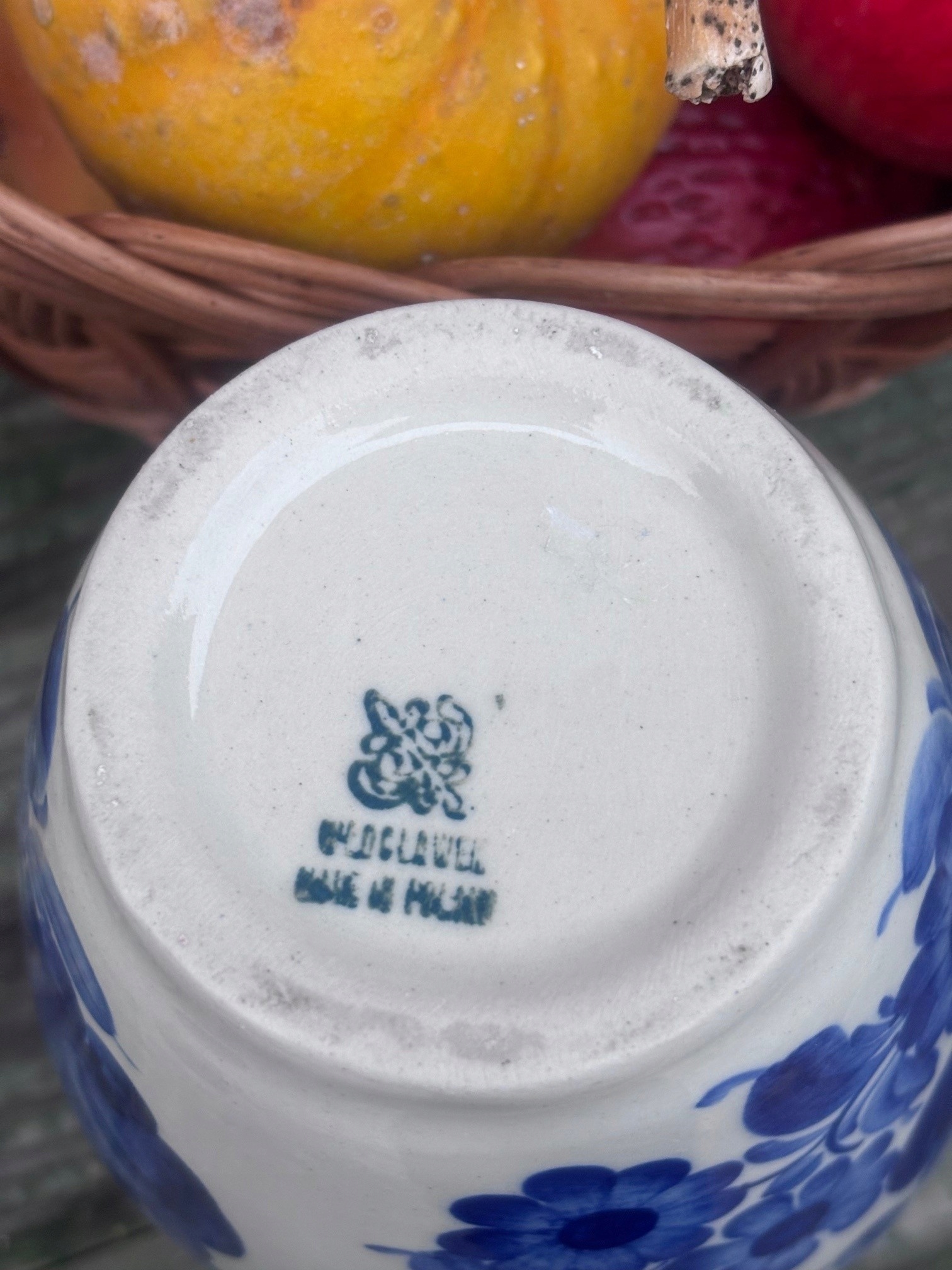 Fajansowy wazon z Włocławka z lat 70/80-tych. Sygnowany. Ręcznie malowany. Wymiary; wys. 15,5 x 11,5 cm. Stan wazonu pokazano na zdjęciach. Drobna wada fabryczna szkliwa, niewielkie ślady użytkowania.
