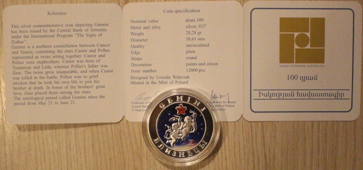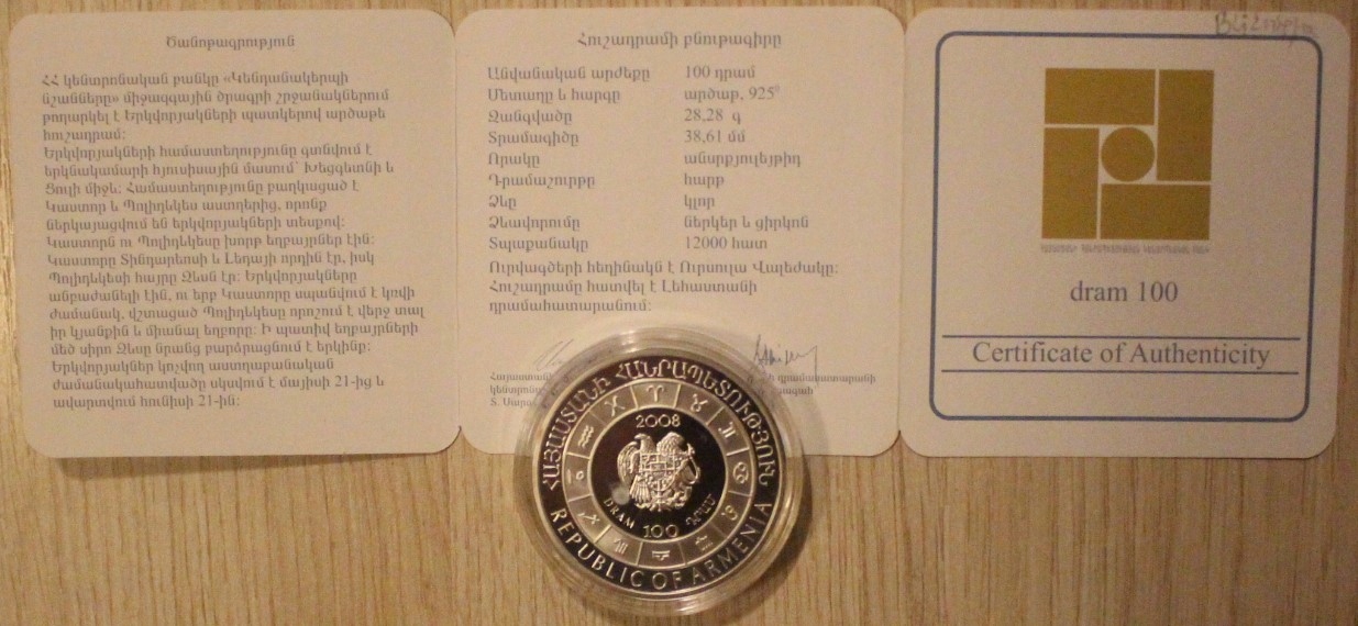Название ARMENIA - ZNAKI ZODIAKU - GEMINI - BLIŹNIĘTA - 100 DRAM 2008 ARMENIA, MENNICZA + DWUJĘZYCZNY ORYGINALNY CERTYFIKAT