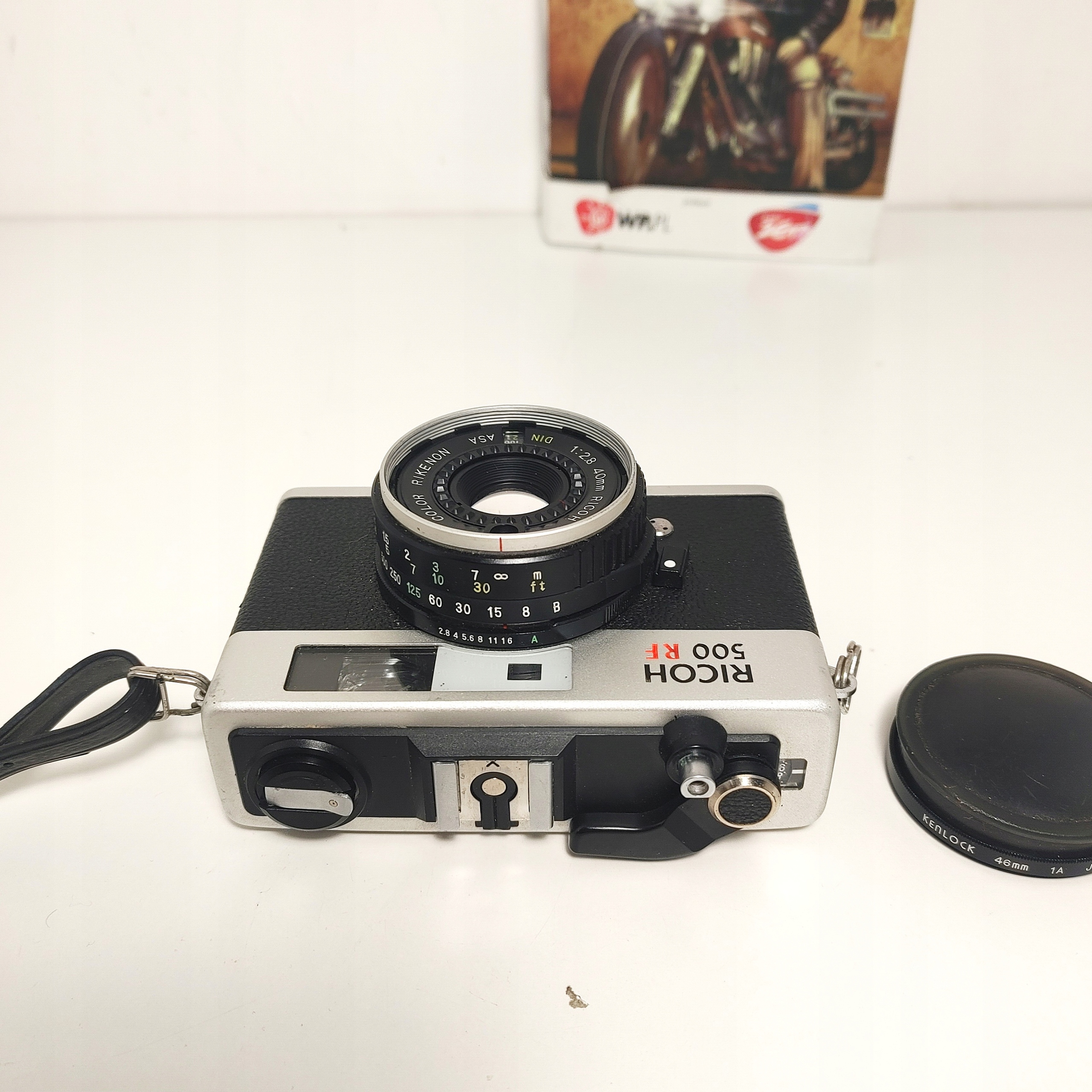 Aparat dysponuje obiektywem 40 mm 1:28Color Rikenon oraz migawką z czasami od 1/8s po 1/500 s oraz B.