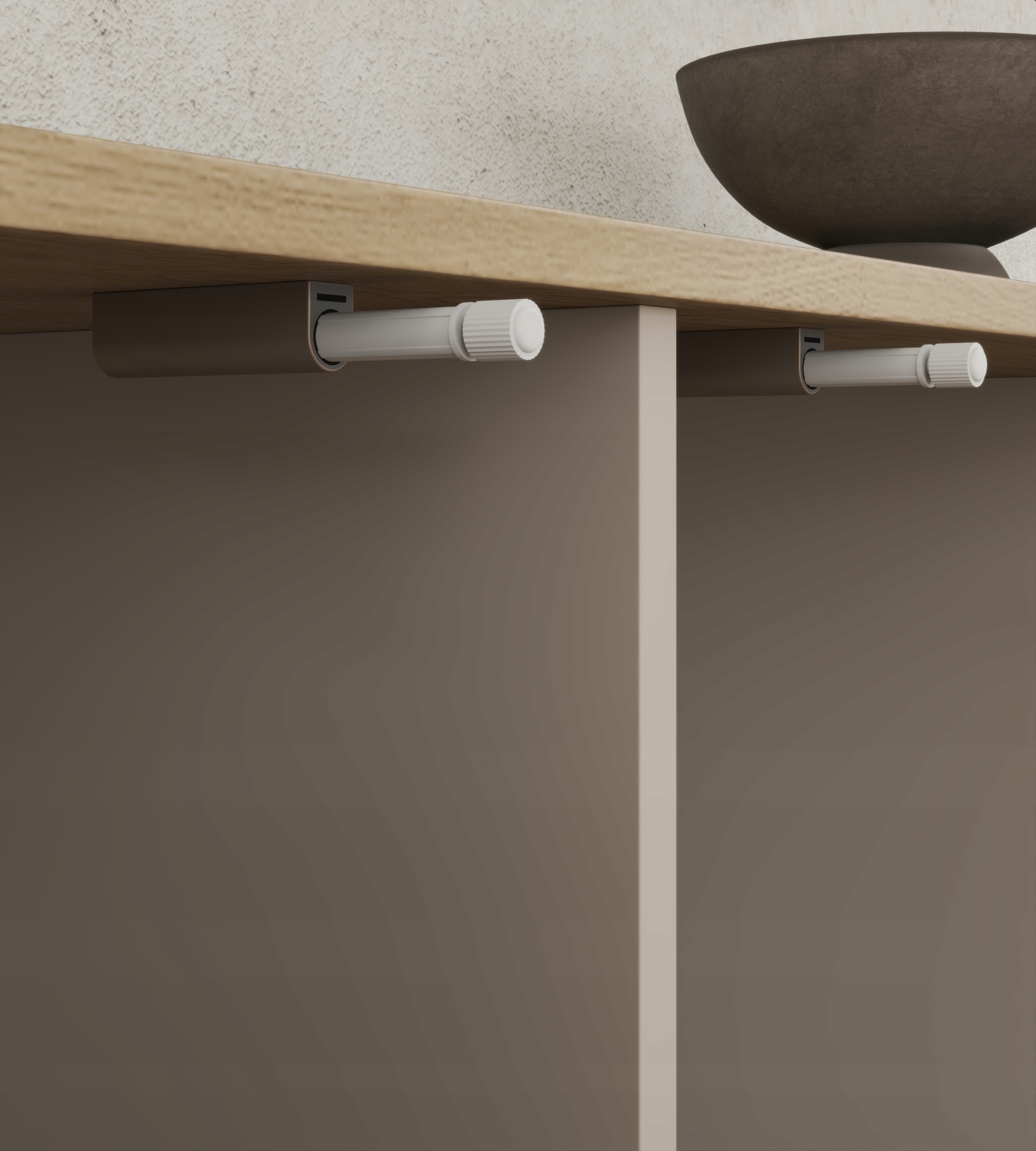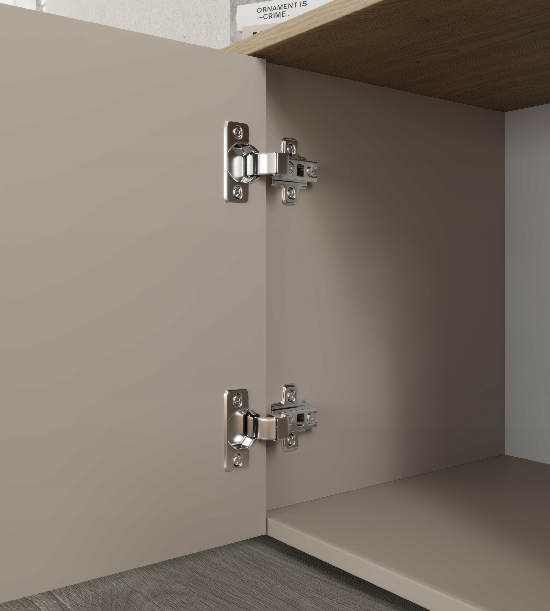 Korpus wykonany jest w jasnym, ciepłym odcieniu kaszmiru, który nadaje wnętrzu przytulności i elegancji. Blat kontrastuje delikatnie – jest w kolorze naturalnego drewna dąb cremona.
