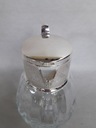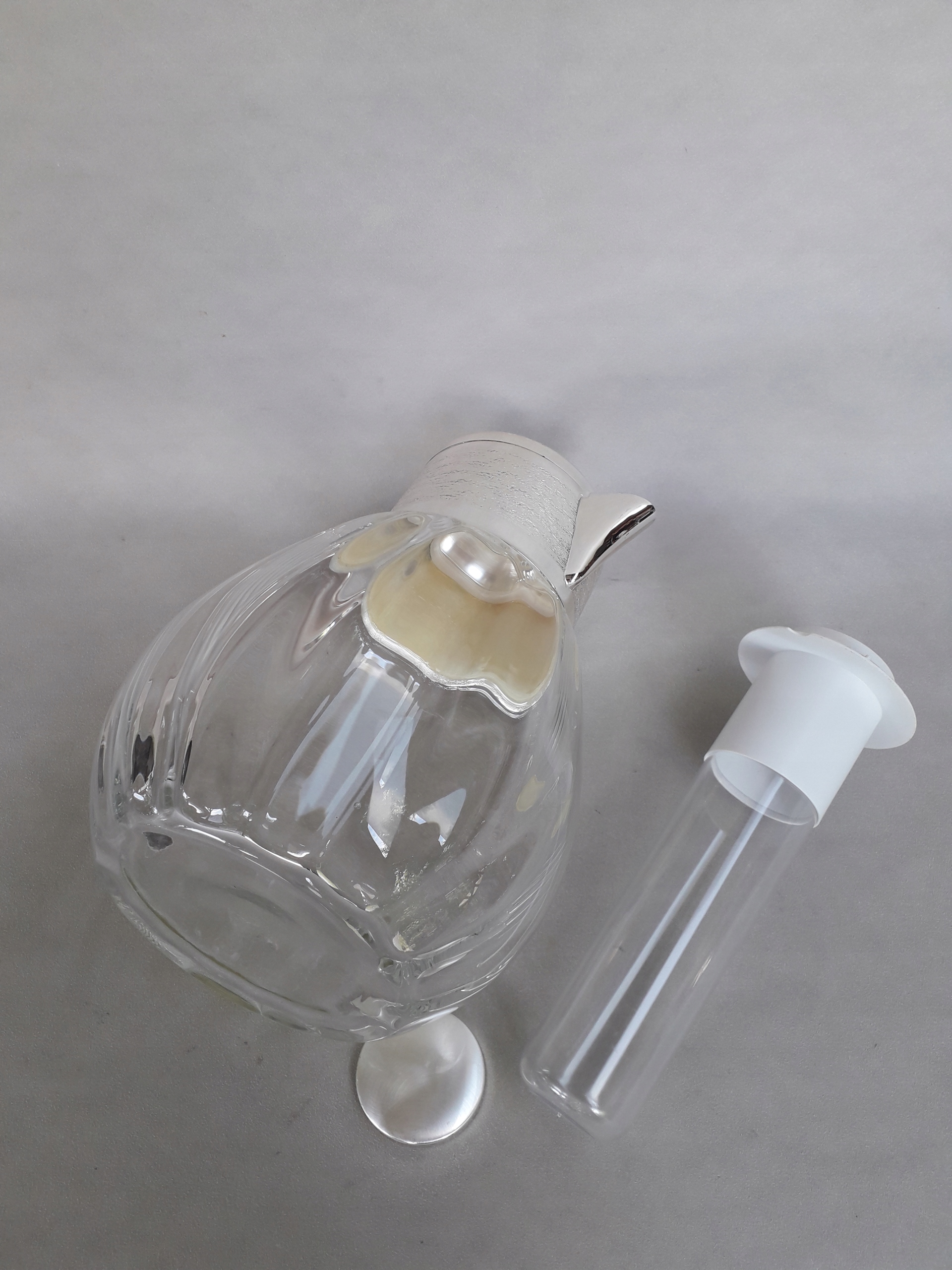 Stary dzbanek wykonany ze szkła kryształowego. Wewnątrz dzbanka widoczny wkład do lodu wykonany z tworzywa. Pozostałe elementy platerowane.