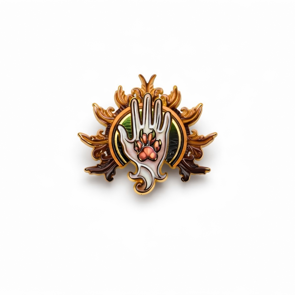 Od dzikich szlaków Wybrzeża Mieczy po lasy wokół Baldur’s Gate — Ranger Class Badge to mocny ukłon w stronę tropicieli, zwiadowców i wiernych towarzyszy u boku. Ten efektowny pin z metalu o rozmiarze 10 cm nawiązuje do ikonografii klasy z gry: w centrum widać jasną, otwartą dłoń z ciepłą, miedzianą łapą, osadzoną na głębokiej zieleni emalii i otoczoną ciemniejszymi akcentami. Wokół rozchodzi się ozdobny „słoneczny” ornament w złotych i brązowo-miedzianych tonach, przypominający stylizowane liście albo płomienie, z wyraźnie wypukłymi konturami i fazowanymi krawędziami. Błyszcząca emalia pięknie łapie światło, a polerowane metalowe obramowania dodają ostrej, kolekcjonerskiej definicji — idealnie na klapę kurtki, płaszcz, plecak albo tablicę z przypinkami. Z tyłu jest elegancki, geometryczny wzór, a dwa bolce z dwoma metalowymi zapięciami typu „motylek” trzymają całość pewnie i równo nawet przy codziennym noszeniu. To świetny, nienachalny akcent do cosplayu i na prezent dla „ranger maina” — przypnij i ruszaj na kolejną wyprawę.