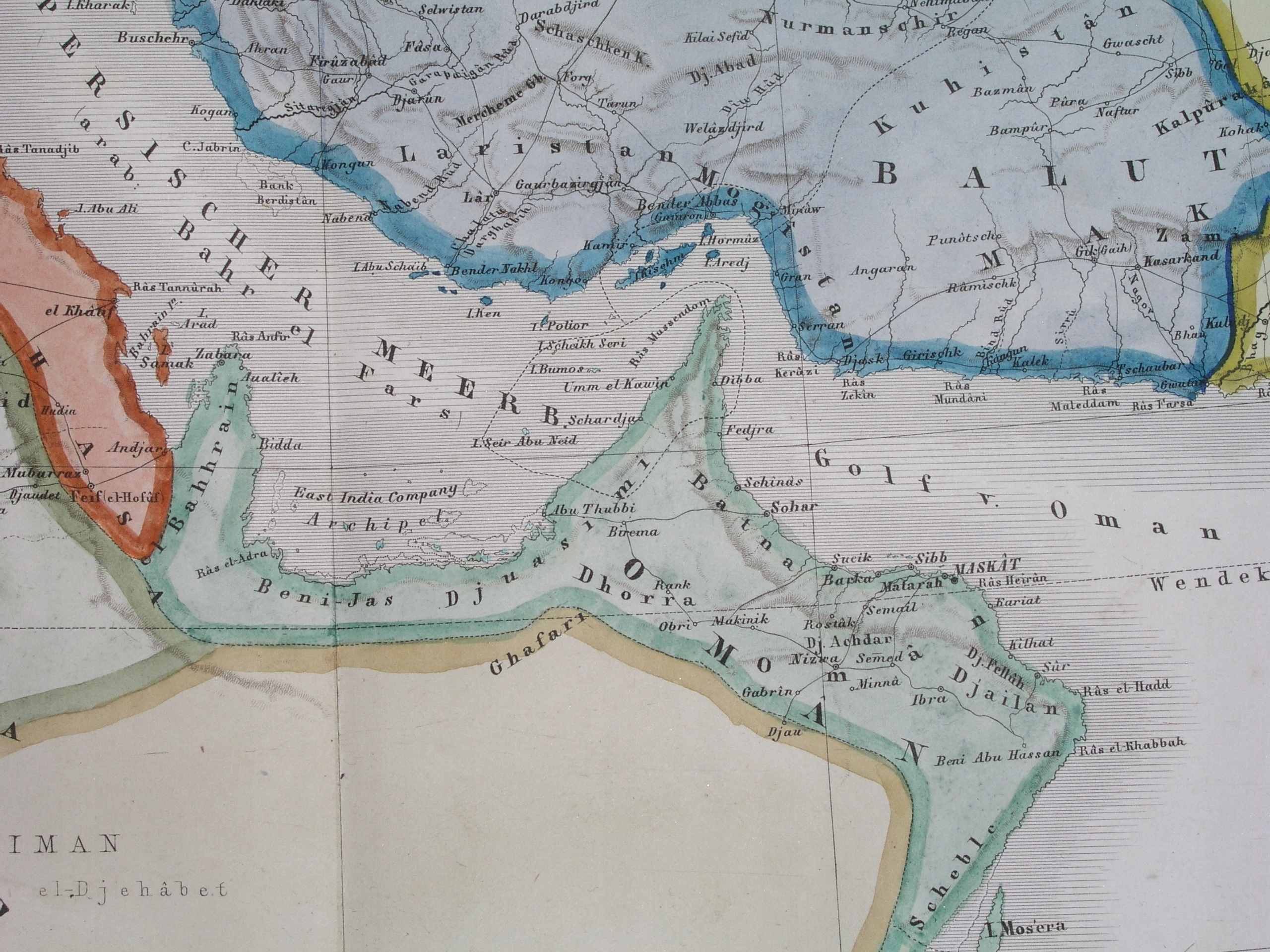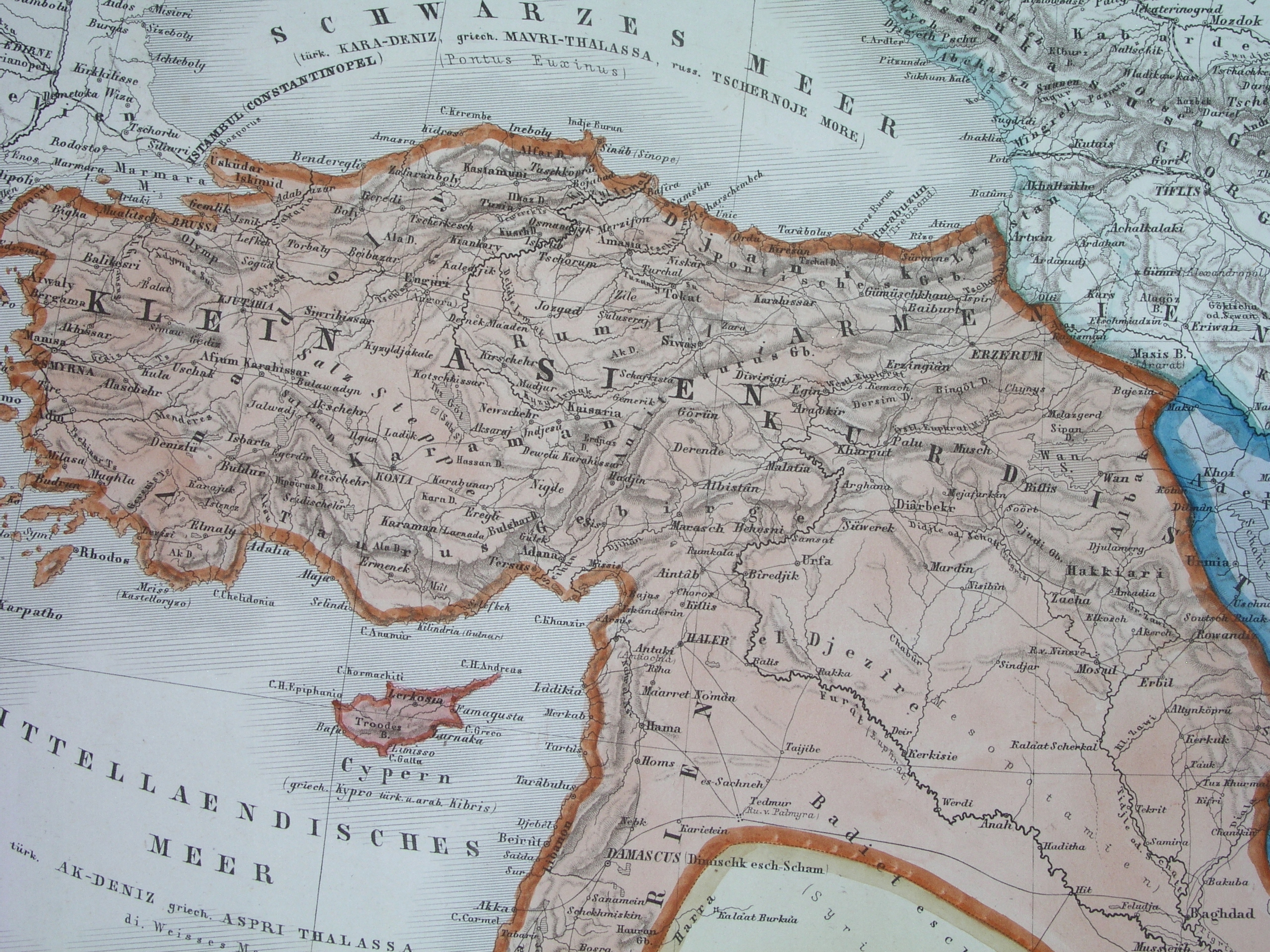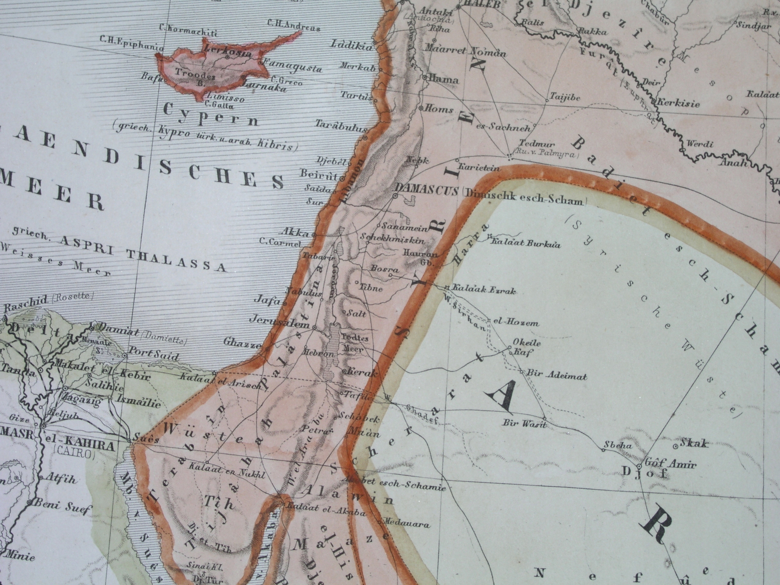 OLBRZYMIA, ORYGINALNA MAPA BLISKIEGO WSCHODU z atlasu Heinricha Kieperta pt. "Neuer Hand-Atlas über alle Theile der Erde..."; wydawanego przez oficynę D. Reimera, Weimar 1869 r. Jest to staloryt wykonany przez A. i C. Graef'ów, ręcznie kolorowany liniowo i powierzchniowo, odbity na arkuszu dość grubego papieru ze zgięciem atlasowym; verso bez druku. Mapa zaopatrzona w skale liniowe, objaśnienie wykorzystanych kolorów oraz mapę poboczną z planem Nowego Jorku. Wielkość arkusza ca 58,5 na 71 cm (w tym marginesy). Mapa w bardzo dobrym stanie zachowania (lekkie zagniecenia i odbarwienia papieru).
