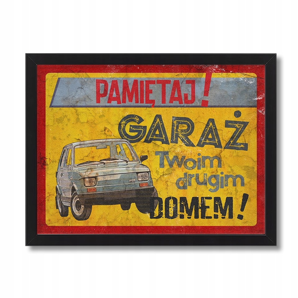 Stylowy obraz 30x40 cm w czarnej eleganckiej ramie, idealny do garażu, warsztatu oraz wnętrz motoryzacyjnych. Motyw kultowego Malucha (Fiat 126p) w połączeniu z hasłem „Garaż Twoim Drugim Domem” to propozycja dla prawdziwych pasjonatów klasycznej motoryzacji.