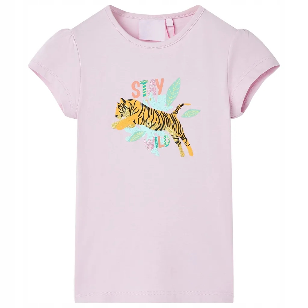 Ta dziecięca koszulka ma krótkie rękawy, okrągły dekolt i prosty krój. Nadrukowano na niej tygrysa oraz napis stay wild. T-shirt dziecięcy został wykonany z bawełny i elastanu, dzięki czemu jest miękki i przyjemny w dotyku.