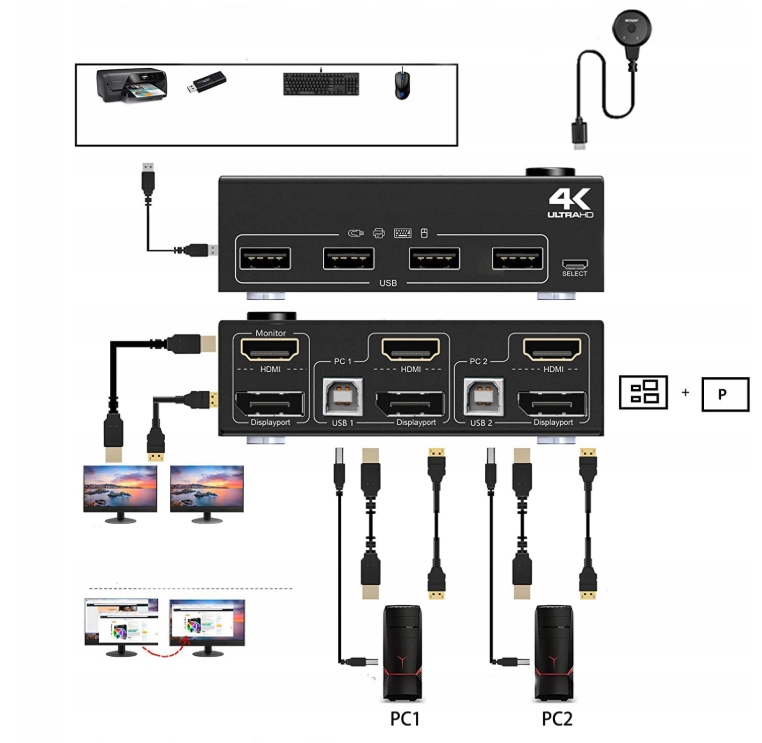 Przełącznik KVM dla podwójnych monitorów w technologii HDMI i DP to idealne rozwiązanie dla osób korzystających z urządzeń wyposażonych w porty DP i HDMI. Umożliwia on współdzielenie klawiatury, myszy oraz monitorów pomiędzy dwoma komputerami. W trybie kopiowania, główny ekran może być odzwierciedlony na drugim wyjściowym ekranie, natomiast w trybie rozszerzenia, okna mogą być przenoszone z głównego ekranu na drugi ekran. Użytkownicy mają do wyboru dwa tryby przełączania, które wspierają zarówno przyciski fizyczne, jak i sterowanie za pomocą przewodu.